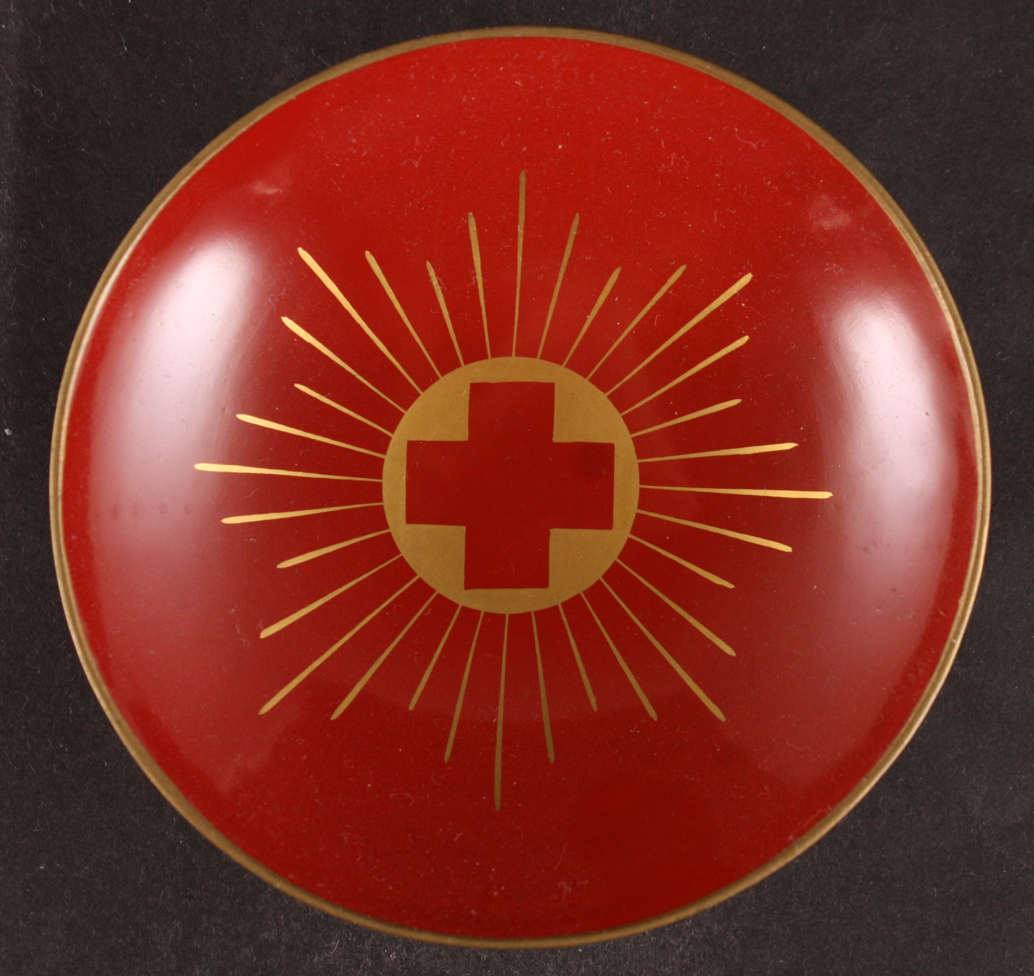 This is an antique Japanese lacquer sake cup, decorated with a sun with rays with a red cross in the middle. The words on the back are "Hiroshima city resident Red Cross Association Member general meeting commemoration".