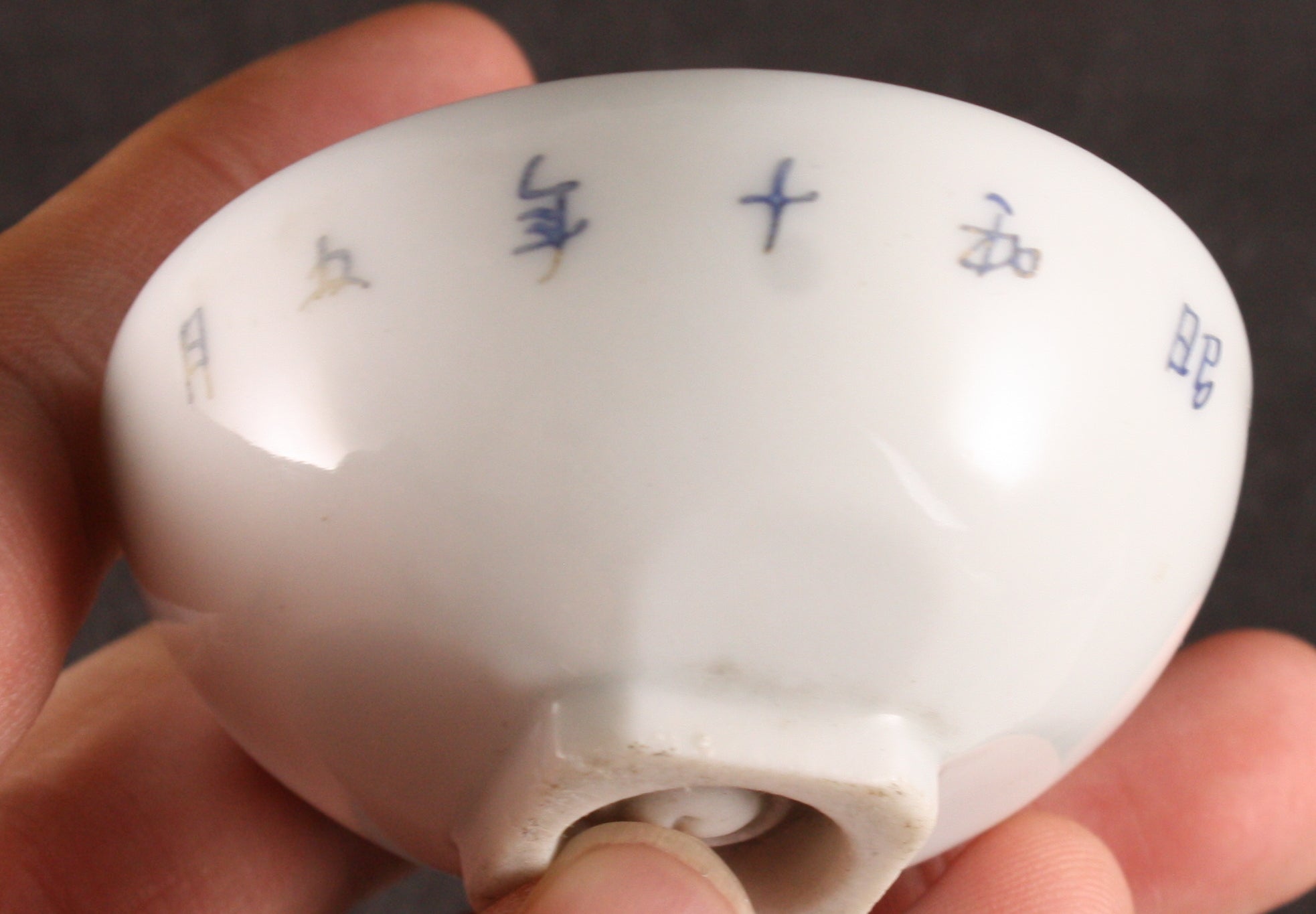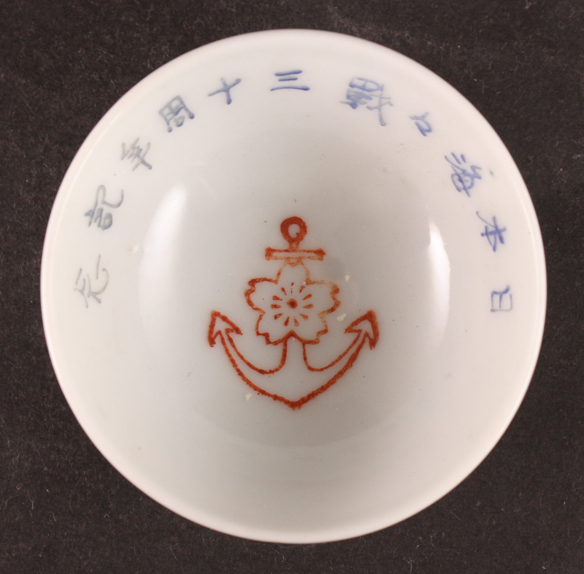 This is an antique Japanese military sake cup, decorated with an anchor and the words "Battle of Sea of Japan 30th Anniversary Commemoration" and on the exterior "Showa 10th Year May". The Japanese referred to the Battle of Tsushima as the Battle of Sea of Japan.