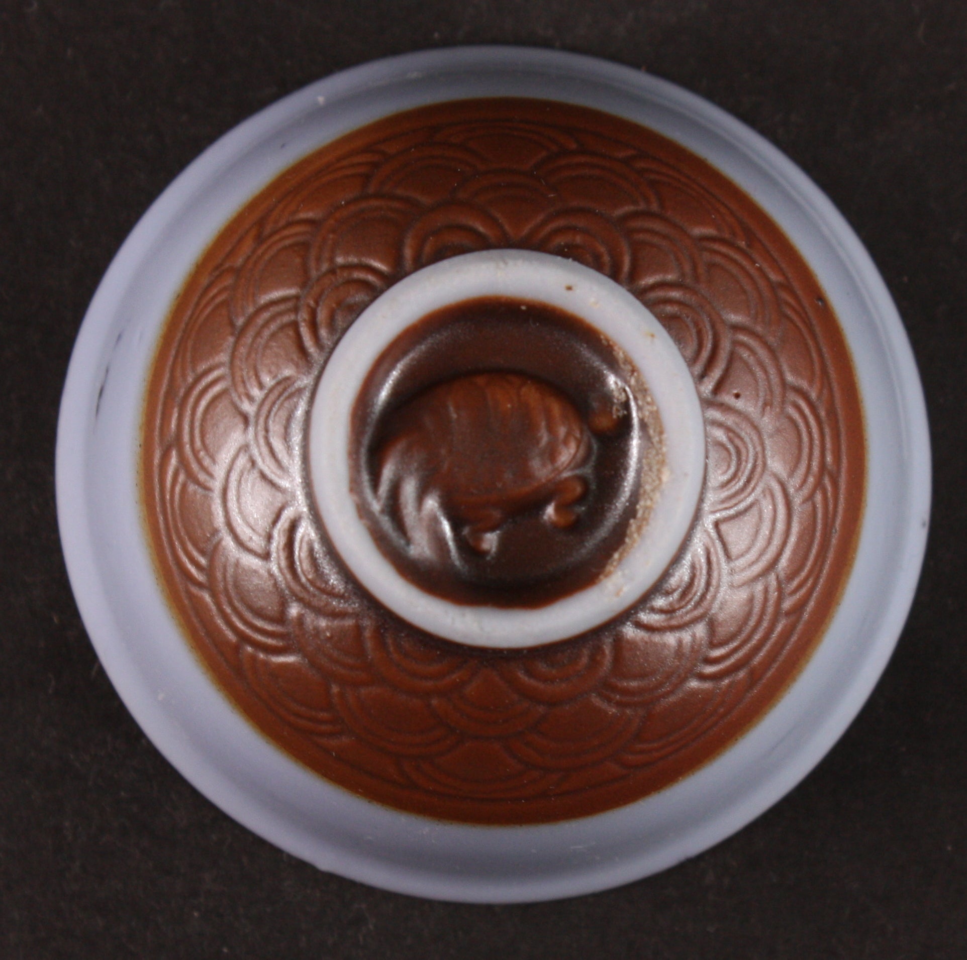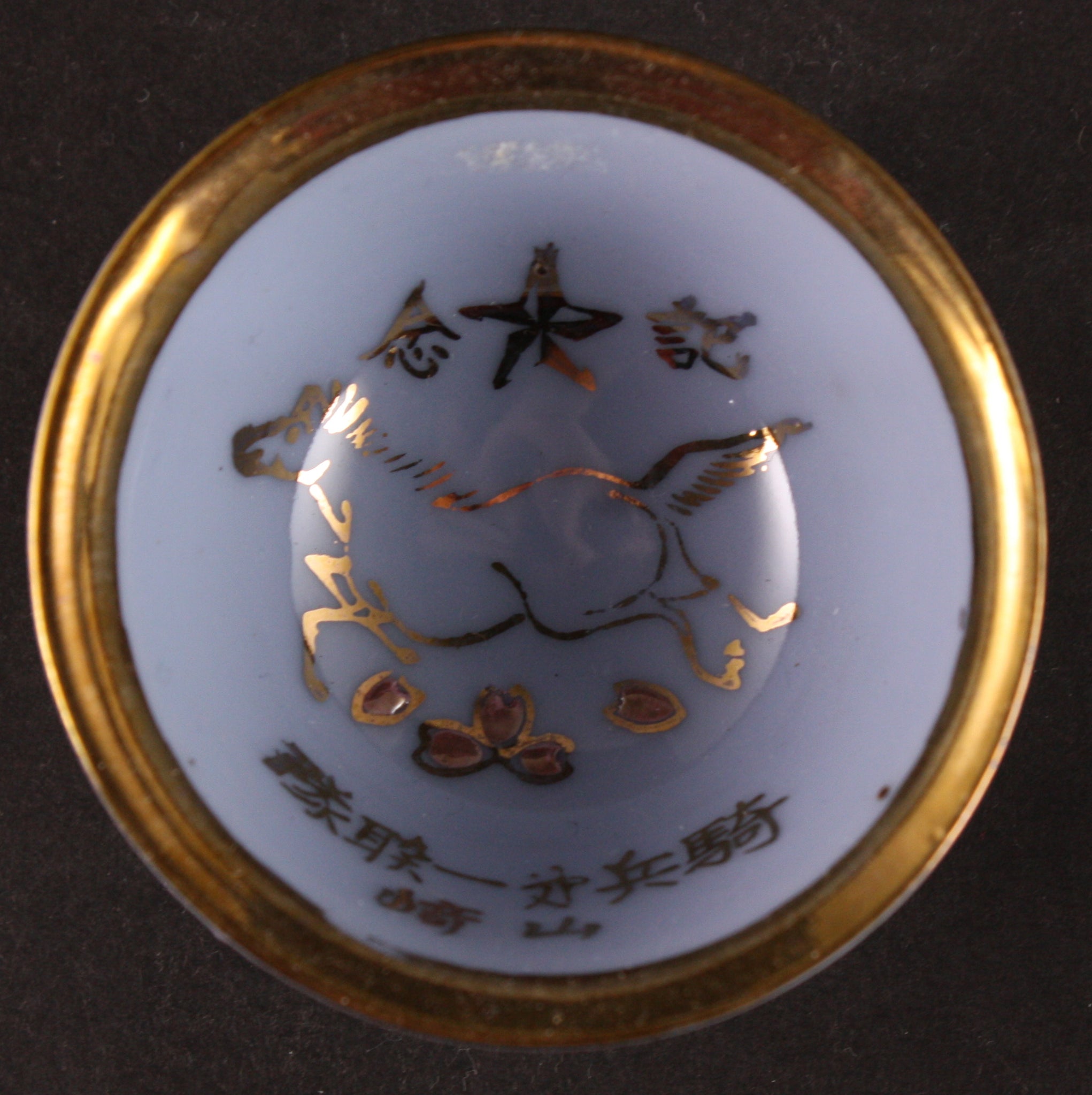 This is an antique Japanese military sake cup, decorated with a horse and the words "Commemoration" "1st Cavalry Regiment" and the soldier's name Yamazaki. The base of the cup has an embossed turtle, which represents longevity.