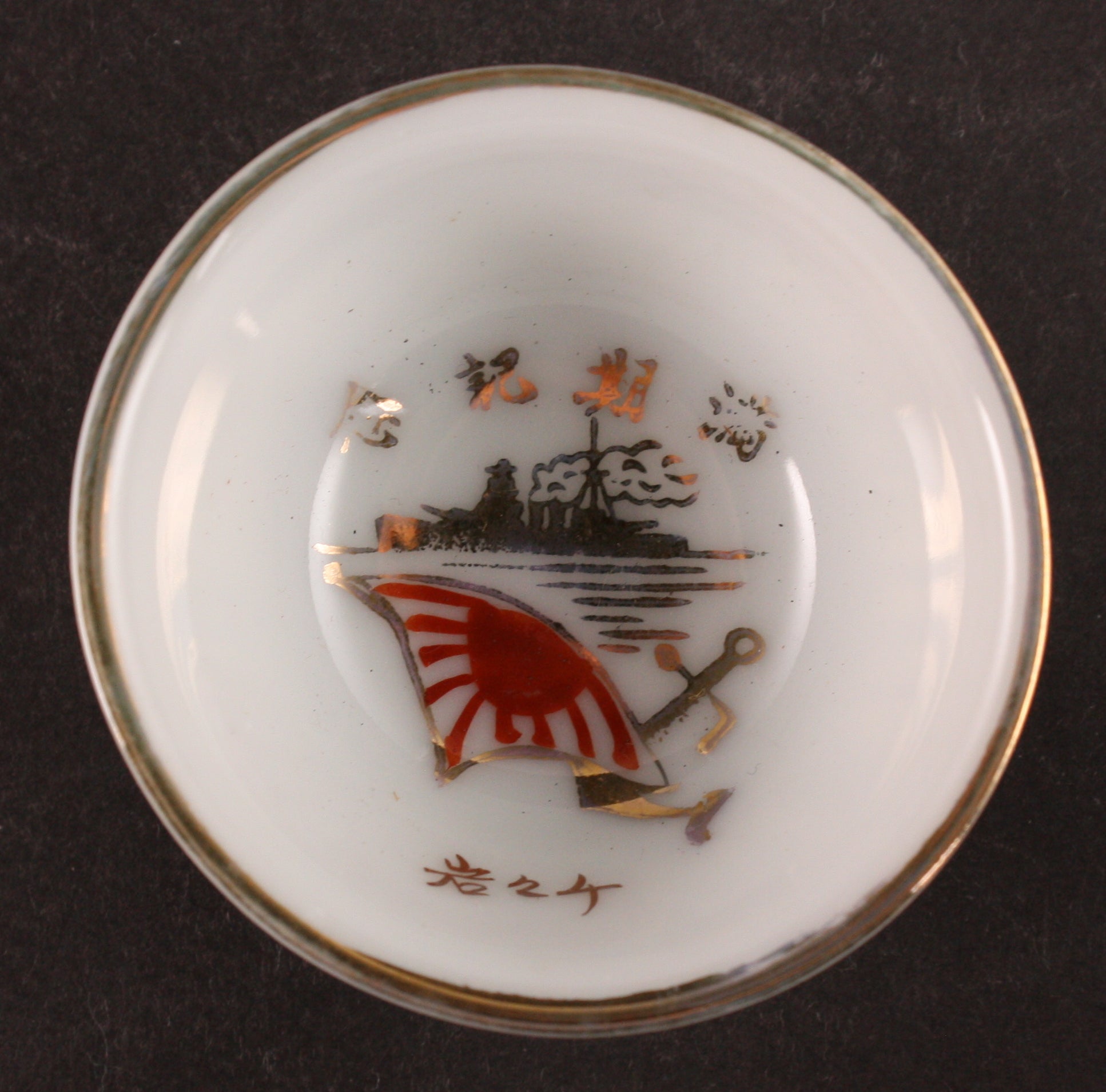 This is an antique Japanese military sake cup, decorated with a battleship profile with a new pagoda mast, a flag, and an anchor. The words are "Term Fulfillment Commemoration" and the sailor's name Chichiiwa. The exterior of the cup is in the shape of a helmet with an anchor in the base.