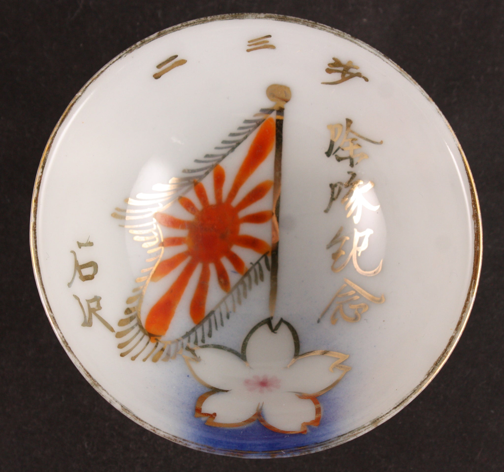 This is an antique Japanese military sake cup, decorated with a flag and cherry blossom. The words are "32nd Infantry Discharge Commemoration" and the soldier's name Ishizawa.