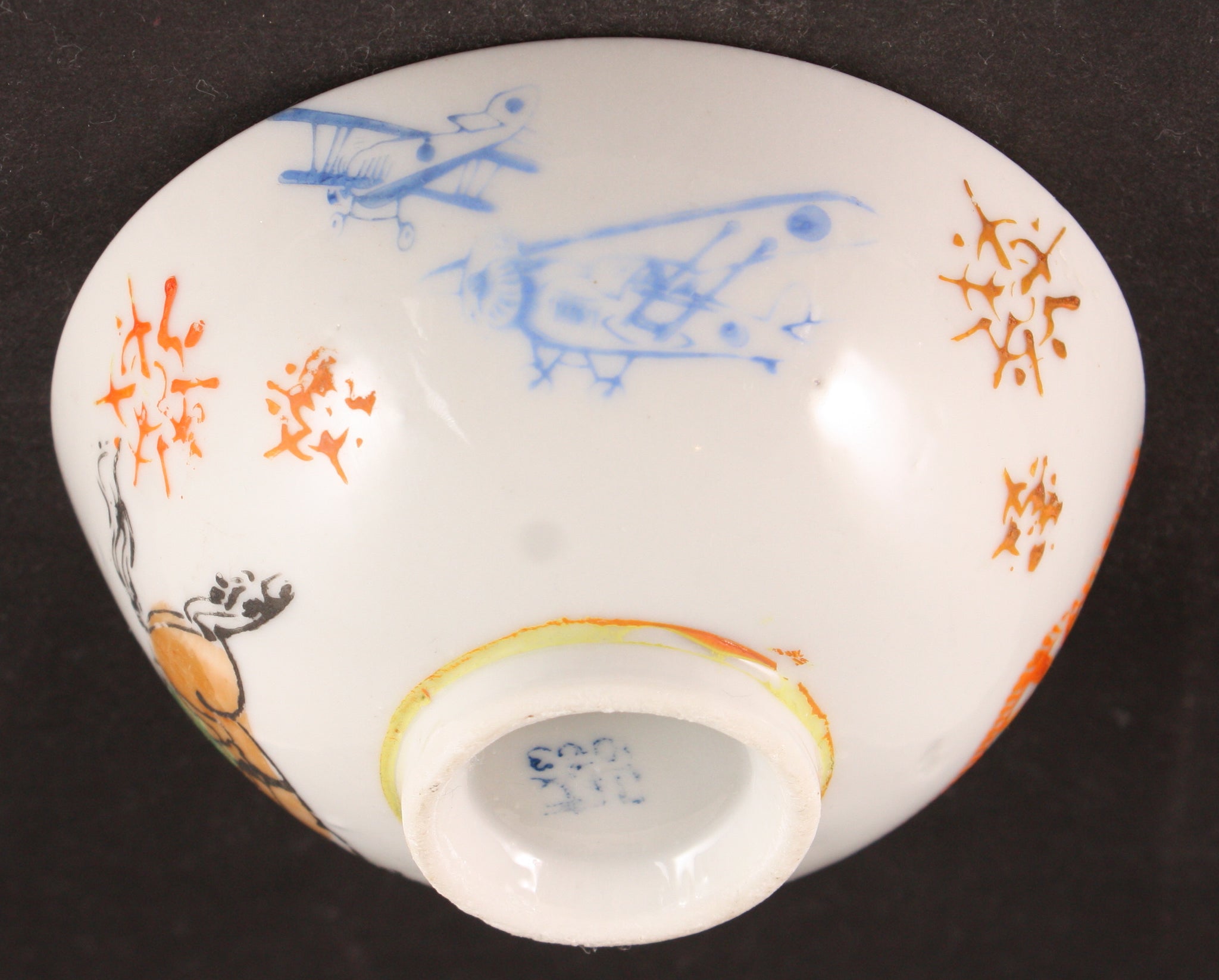 This is an antique Japanese military children's rice bowl, decorated with a cavalry soldier, two planes, and a flag.