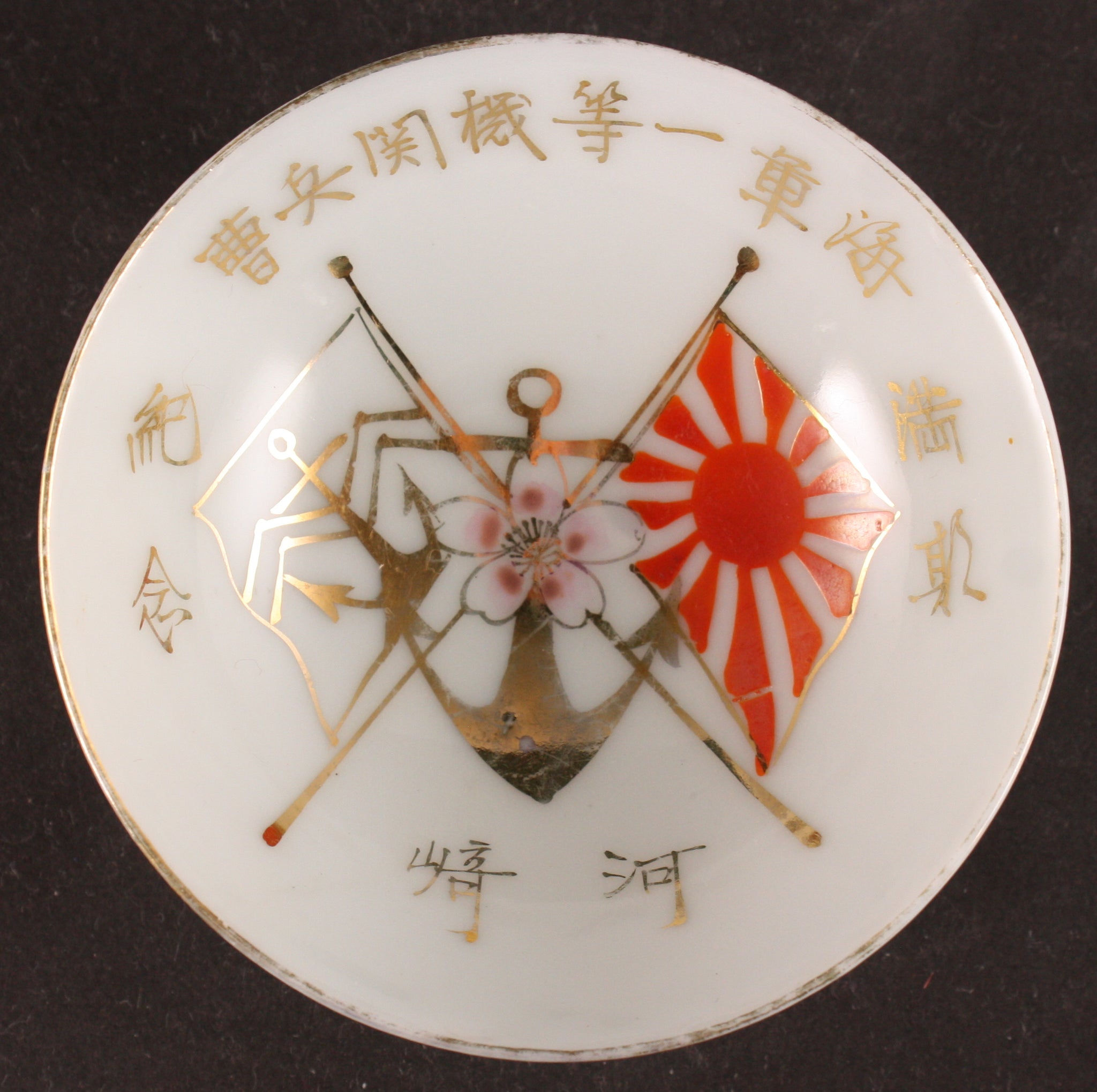This is an antique Japanese military sake cup, decorated with a pair of flags and an anchor, and the words are "Navy Chief Propulsion Petty Officer" "Term Fulfillment Commemoration" and the sailor's name Kawasaki.