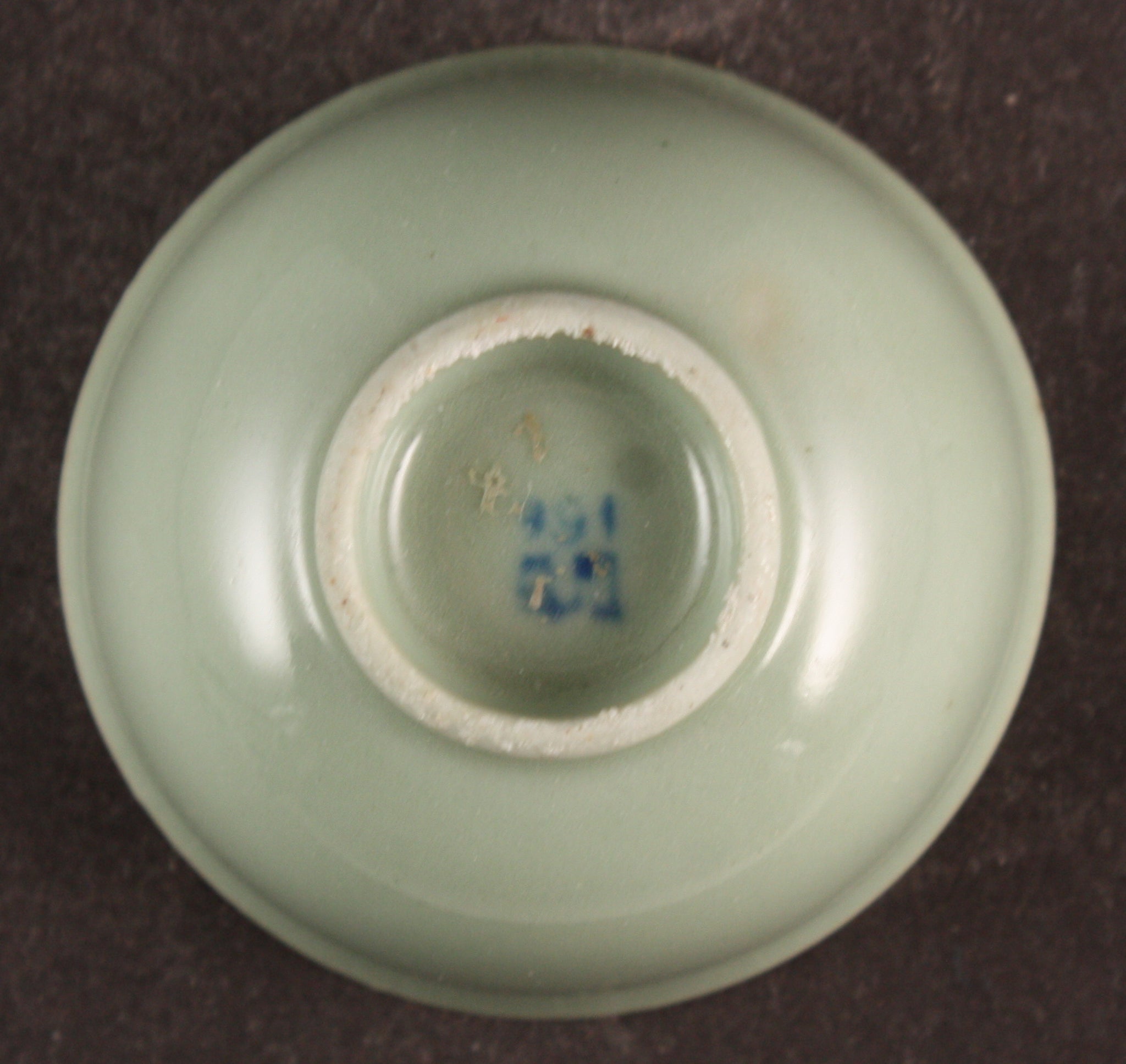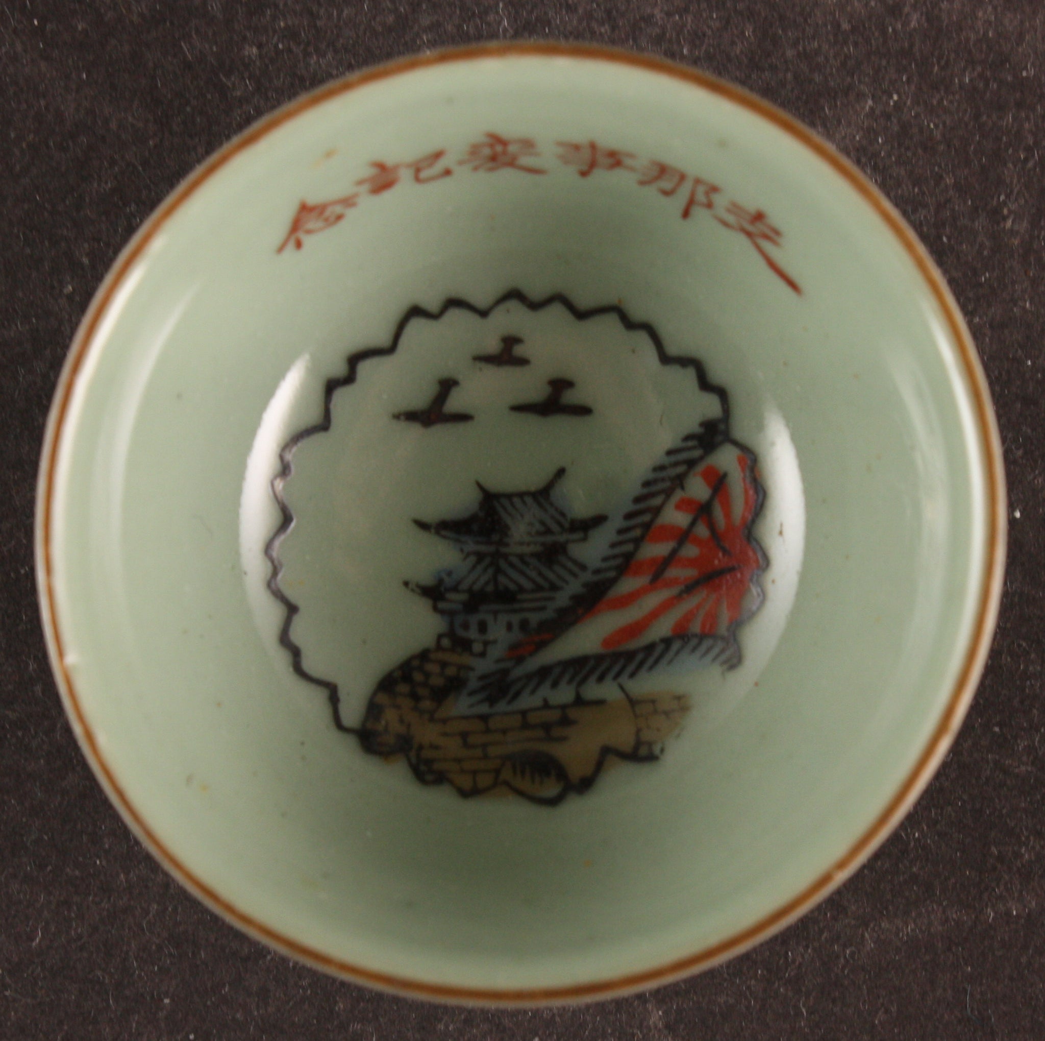 This is an antique Japanese military sake cup, decorated with a picture of a Chinese city gate with a Japanese flag flying in front, with planes overhead. The words are "China Incident Commemoration". There's a maker's mark on the bottom.
