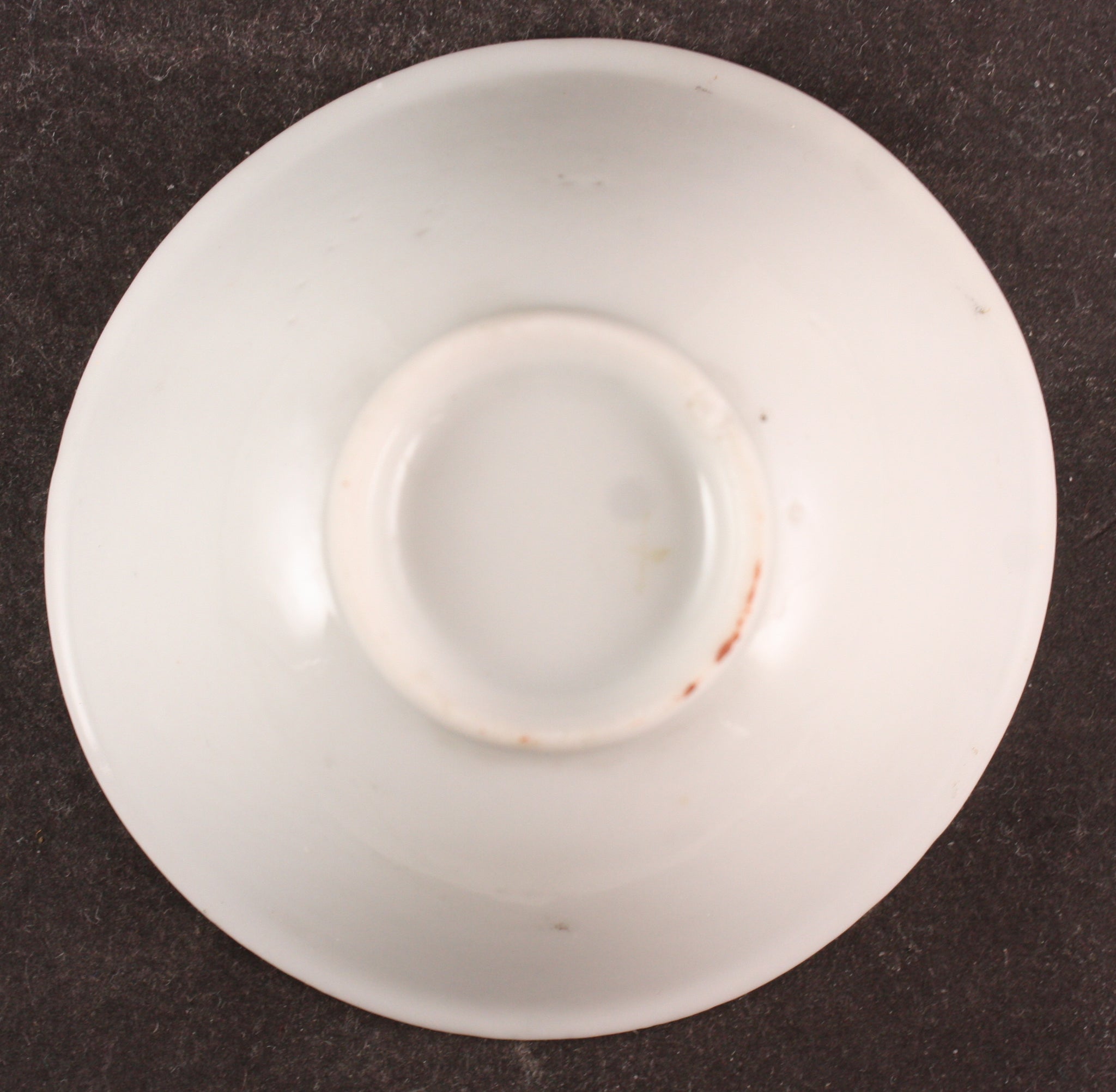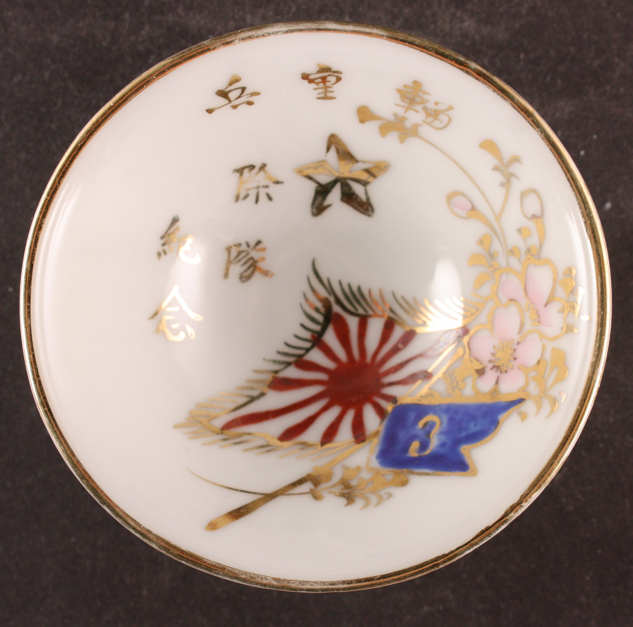 This is an antique Japanese military sake cup, decorated with a collar tab with a number 3, a flag, and cherry blossoms. The words are "Transport" and "Discharge Commemoration".