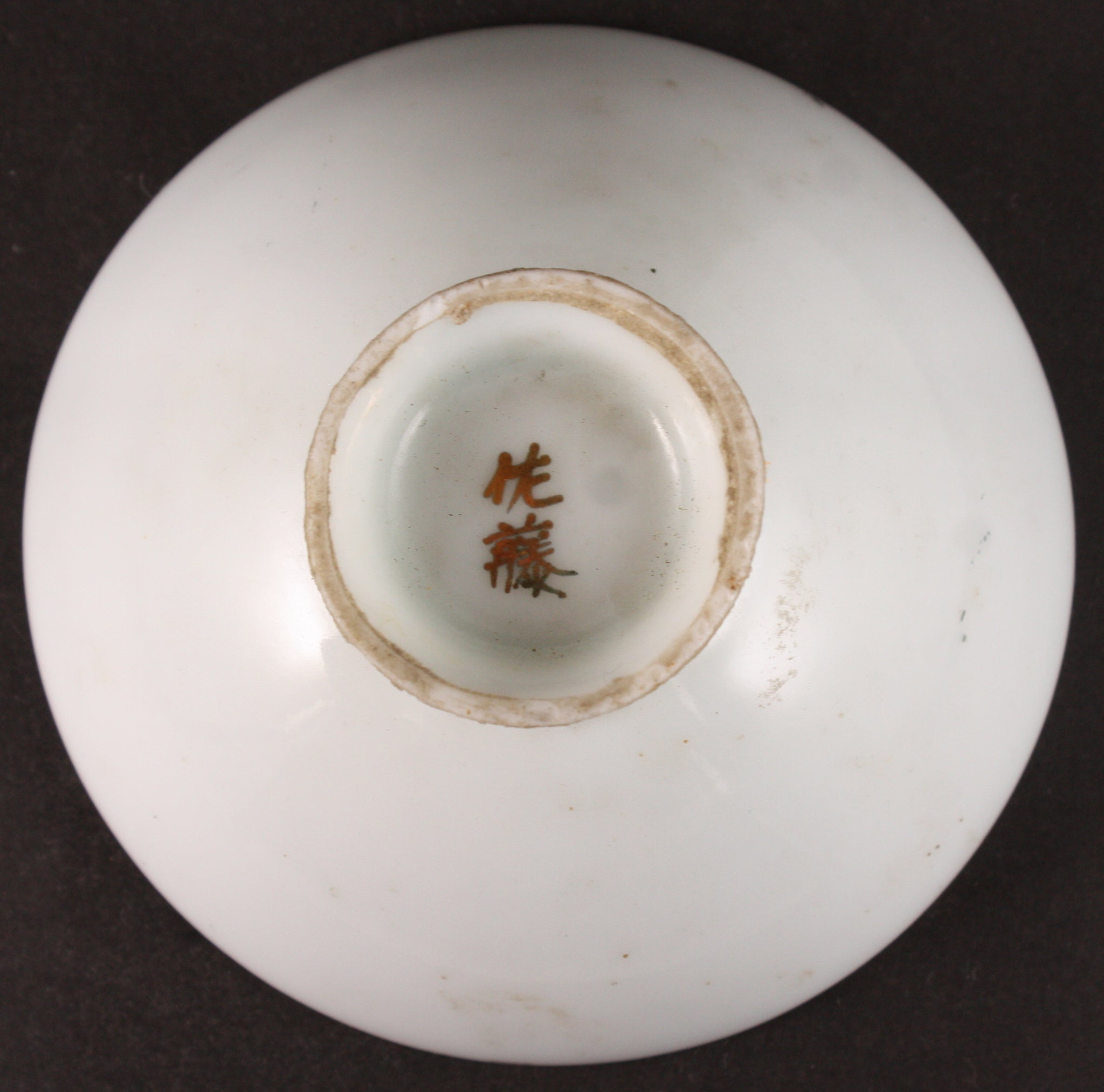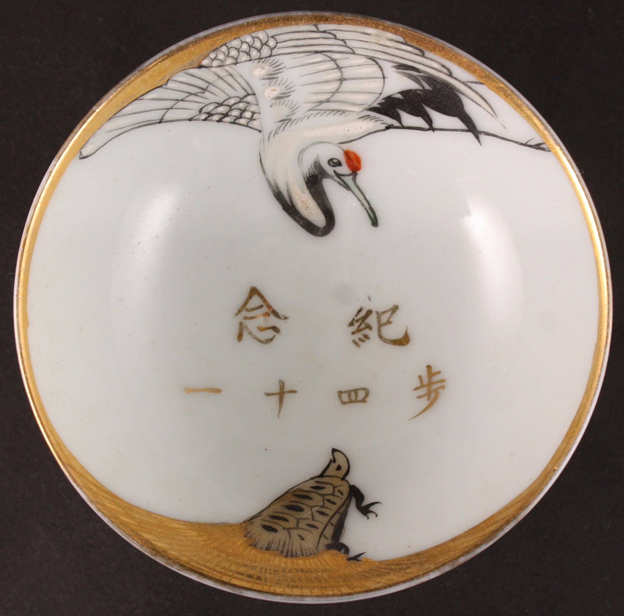 This is an antique Japanese military sake cup, decorated with a beautifully done crane and turtle. The words are "Commemoration" "41st Infantry" and the soldier's name Sato is on the back.