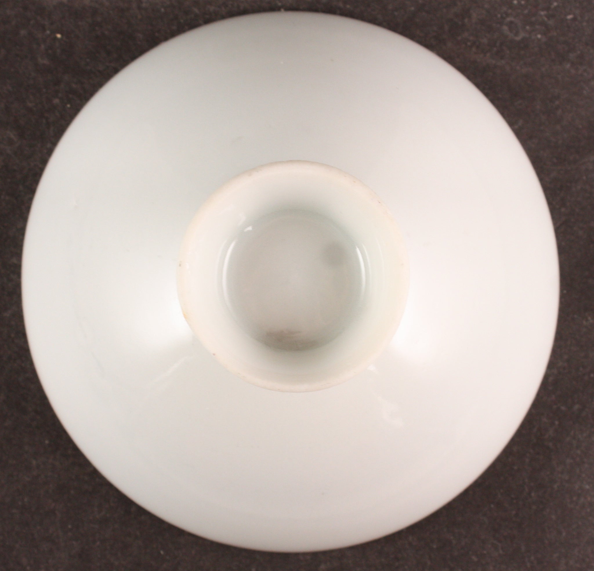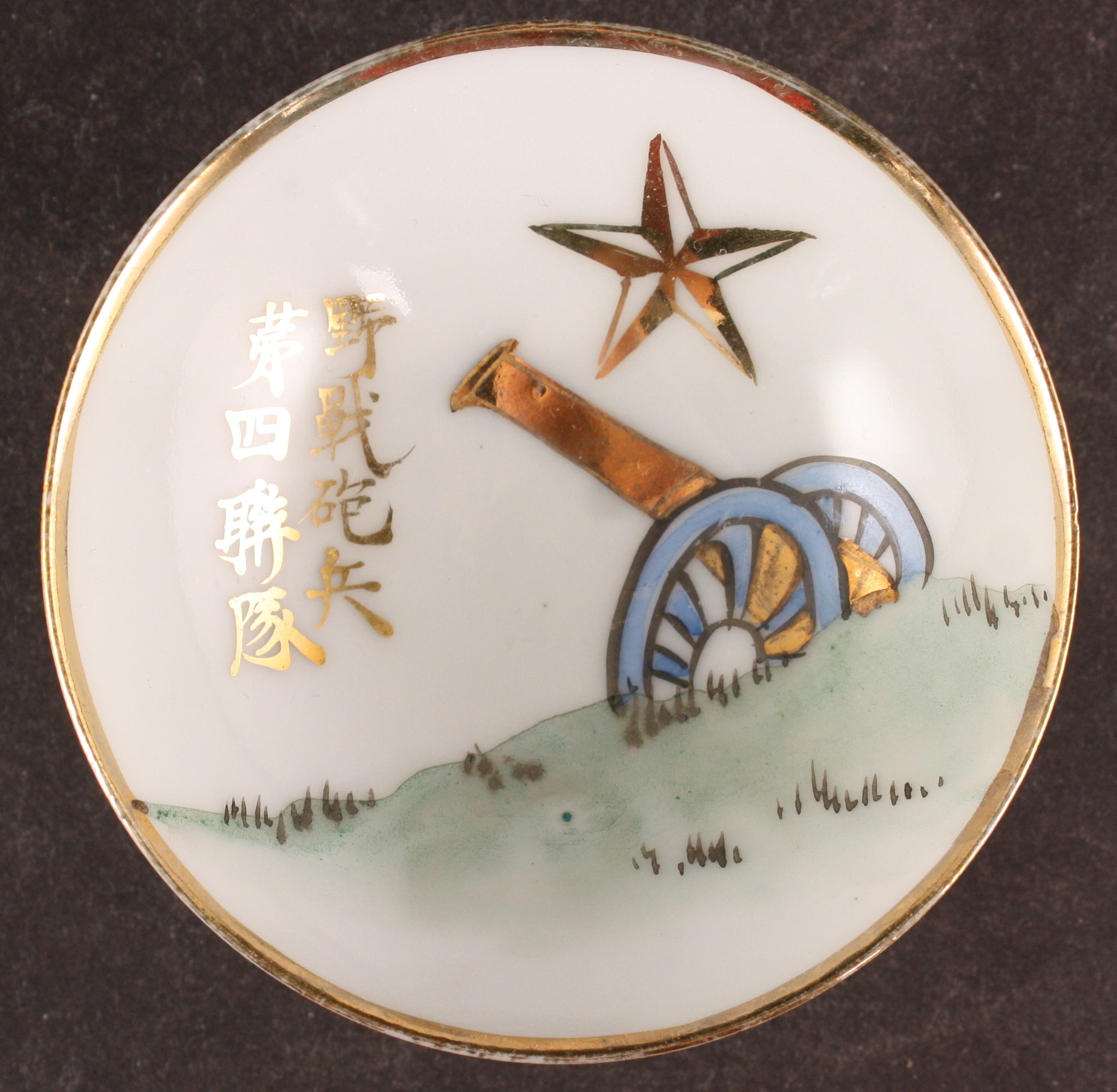 This is an antique Japanese military sake cup, decorated with a hand painted field gun, a star, and a landscape. The words are "4th Field Artillery Regiment".