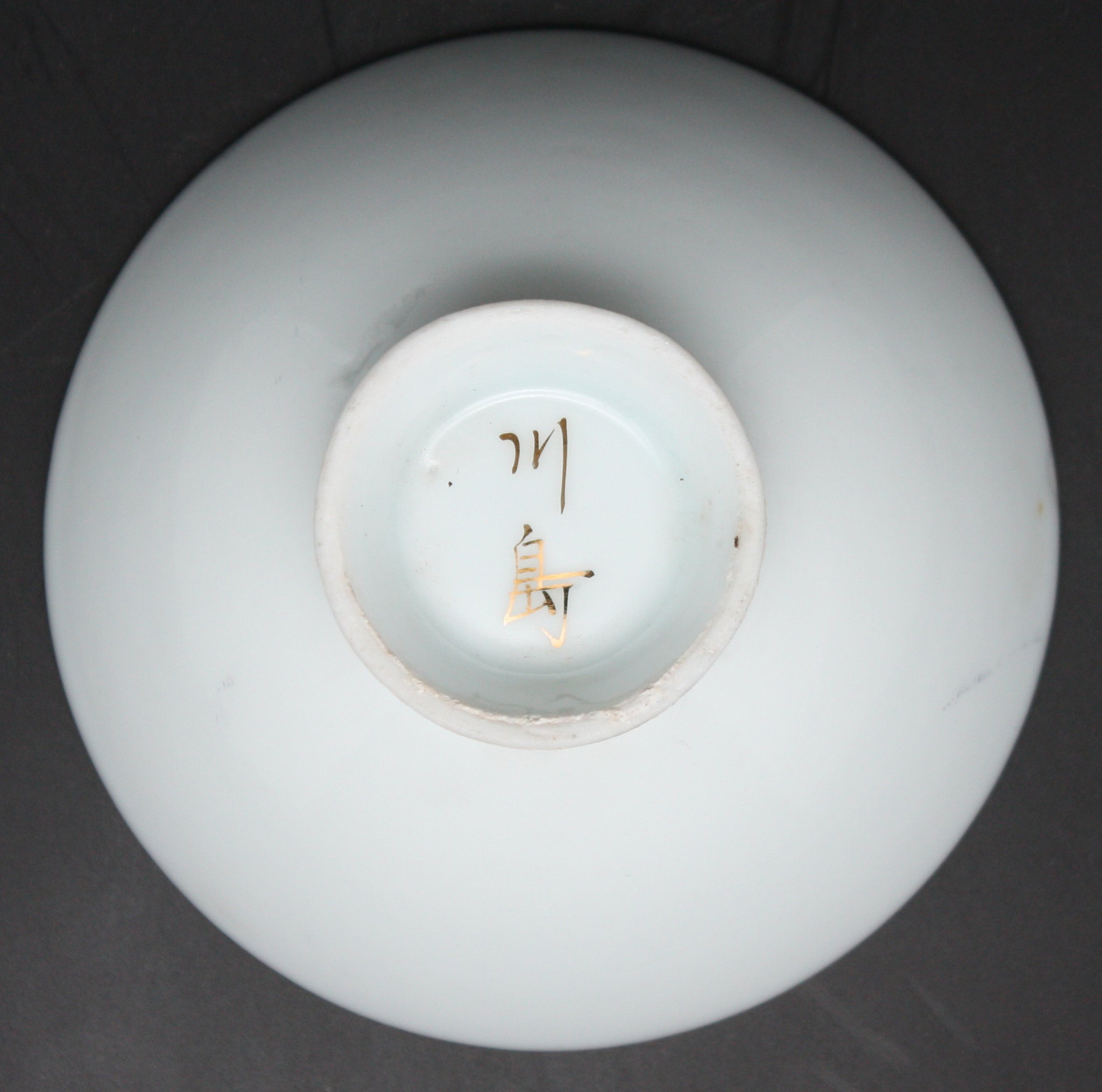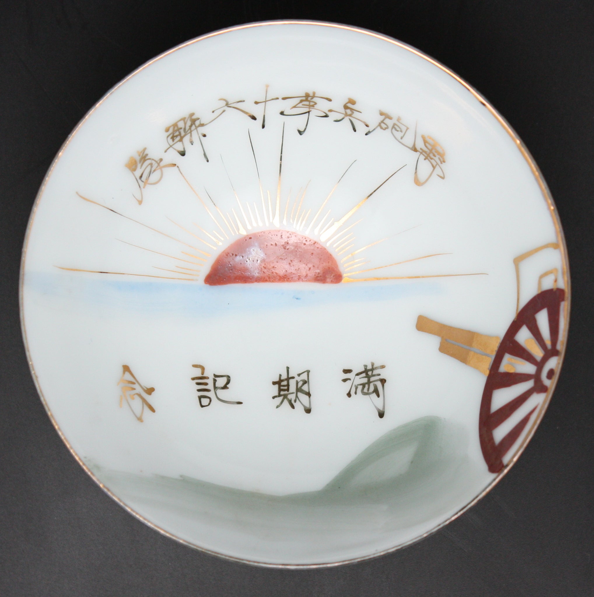 This is an antique Japanese military sake cup, decorated with a rising sun, a field gun, and the words "16th Field Artillery Regiment" "Term Fulfillment Commemoration" and the soldier's name Kawajima is on the back.