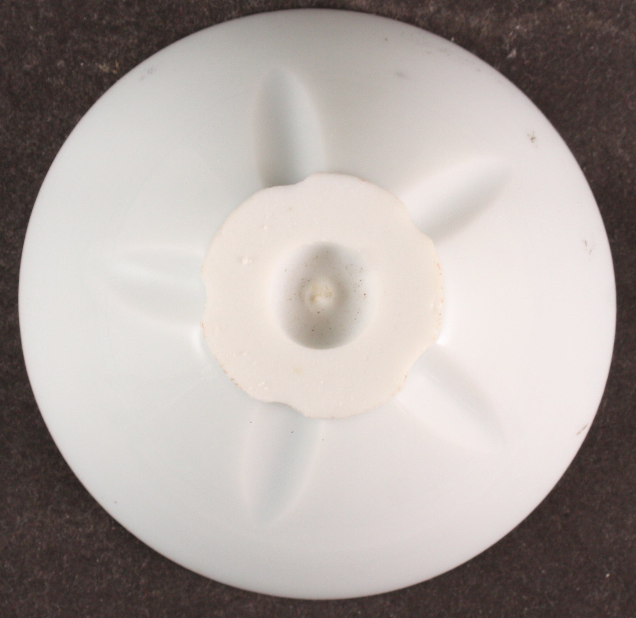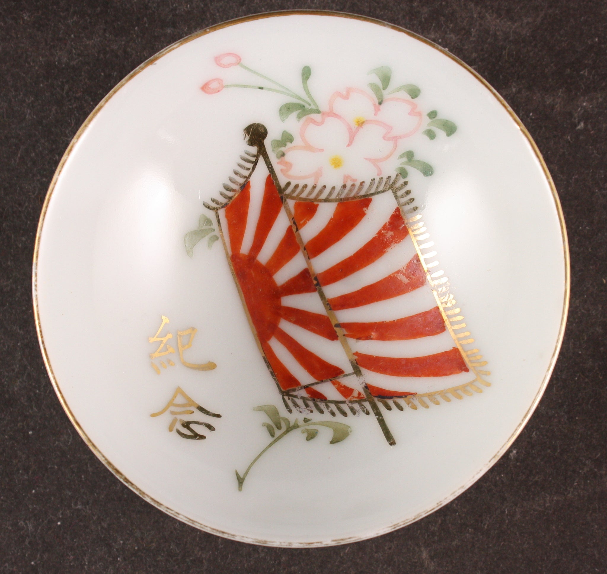 This is an antique Japanese military sake cup, decorated with a flag, cherry blossoms, and the words "Commemoration".
