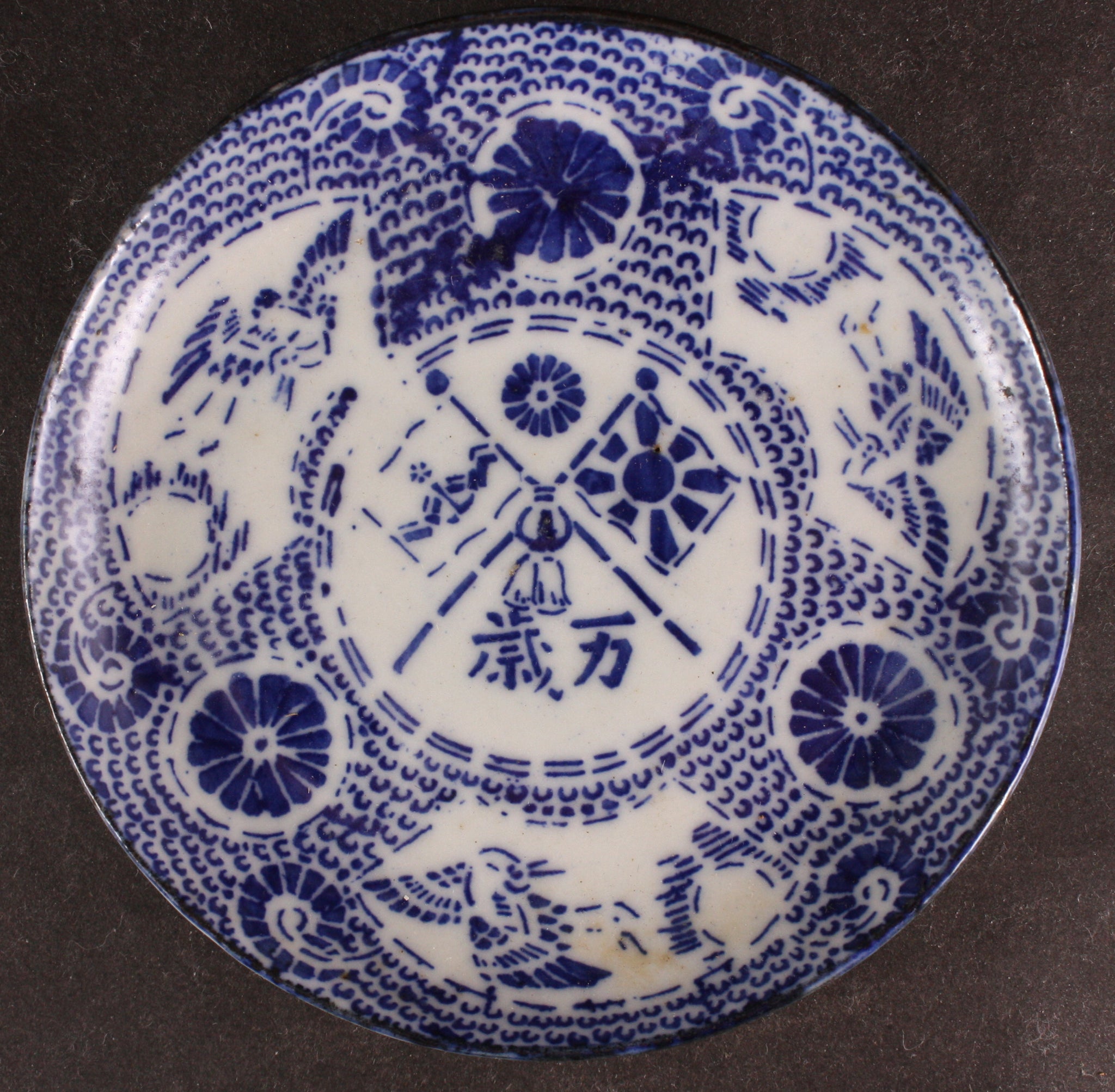 This is an antique Japanese military dish, decorated with a pair of flags and three of what looks like golden kites, plus a chrysanthemum.