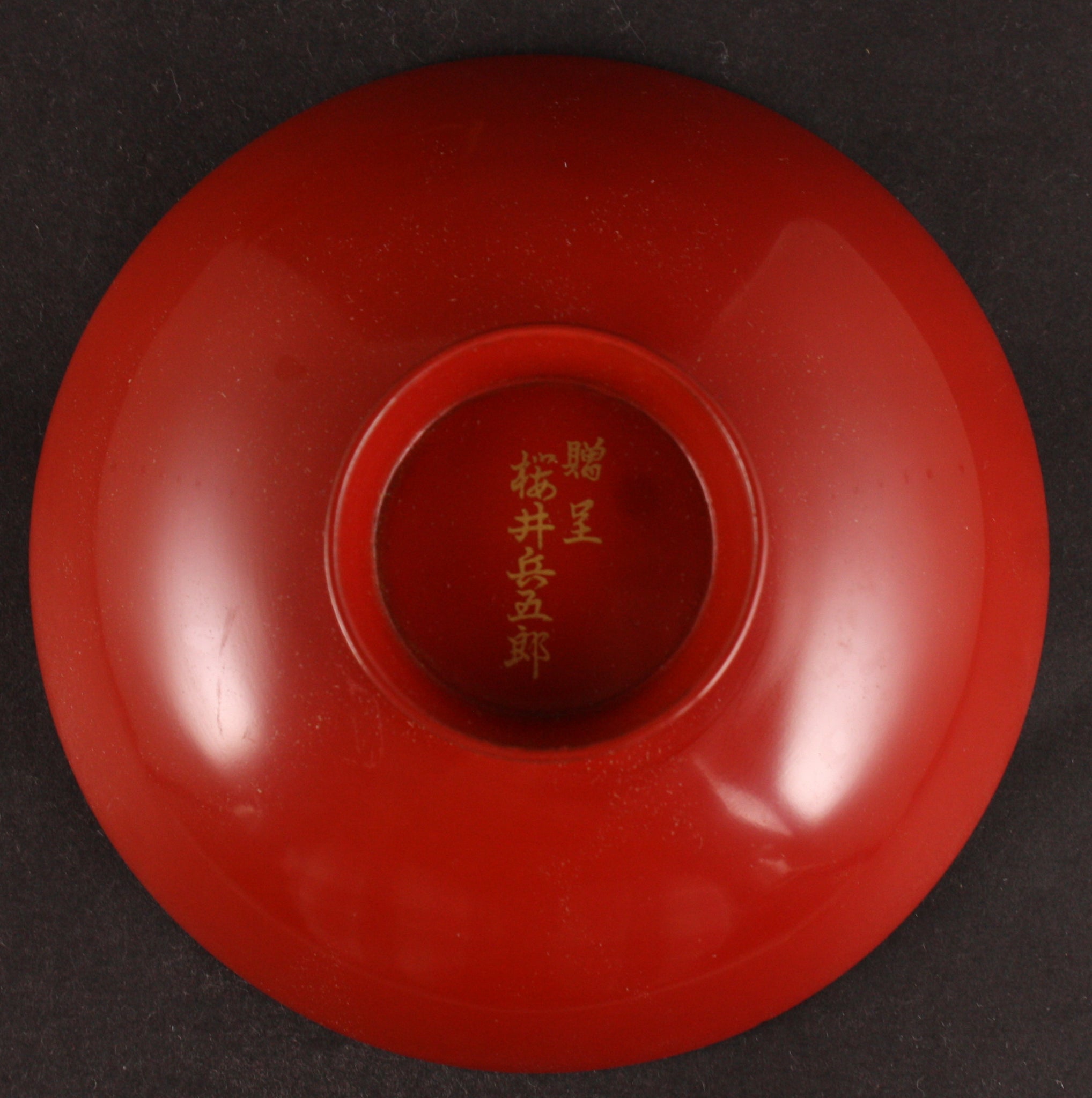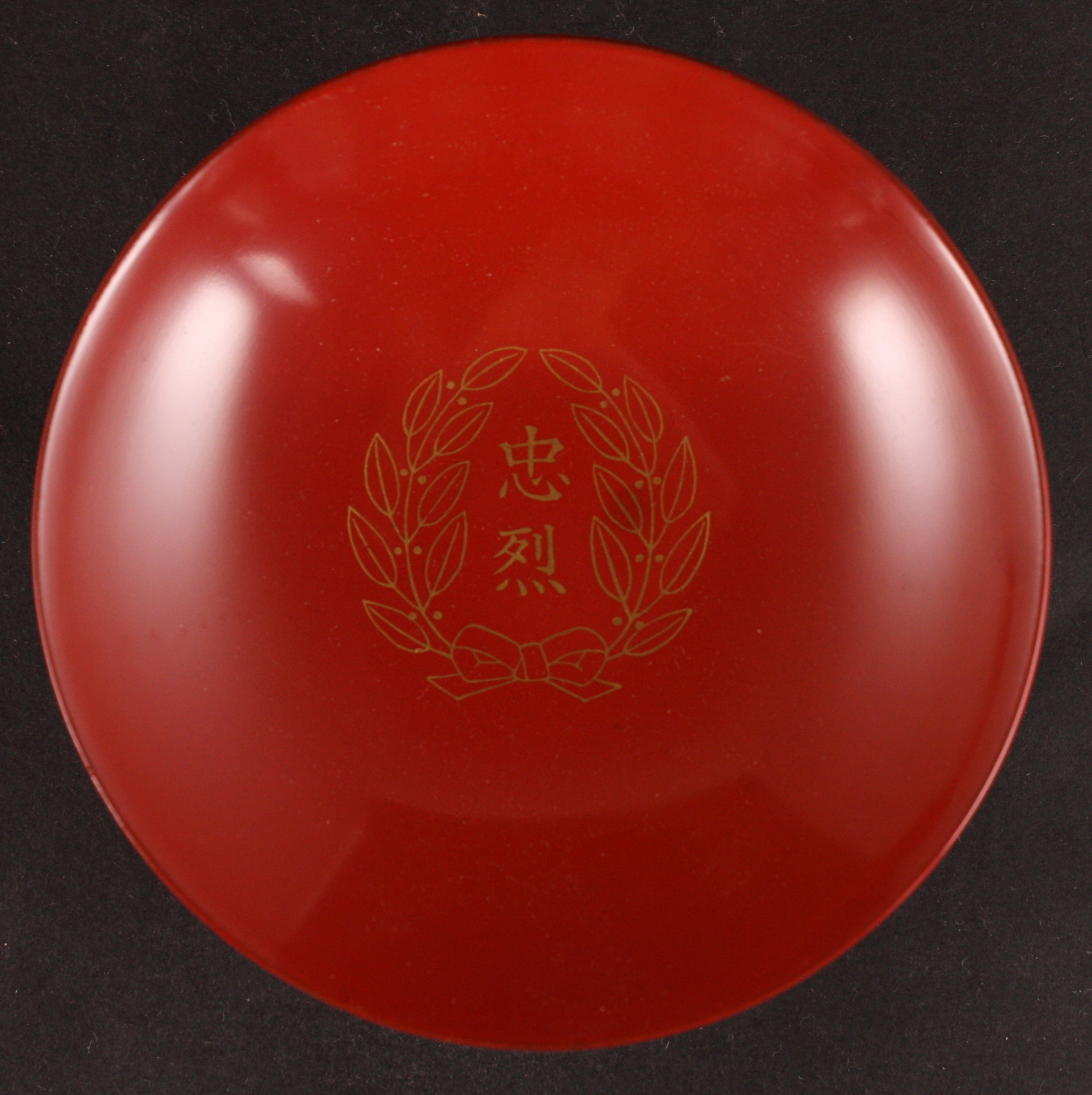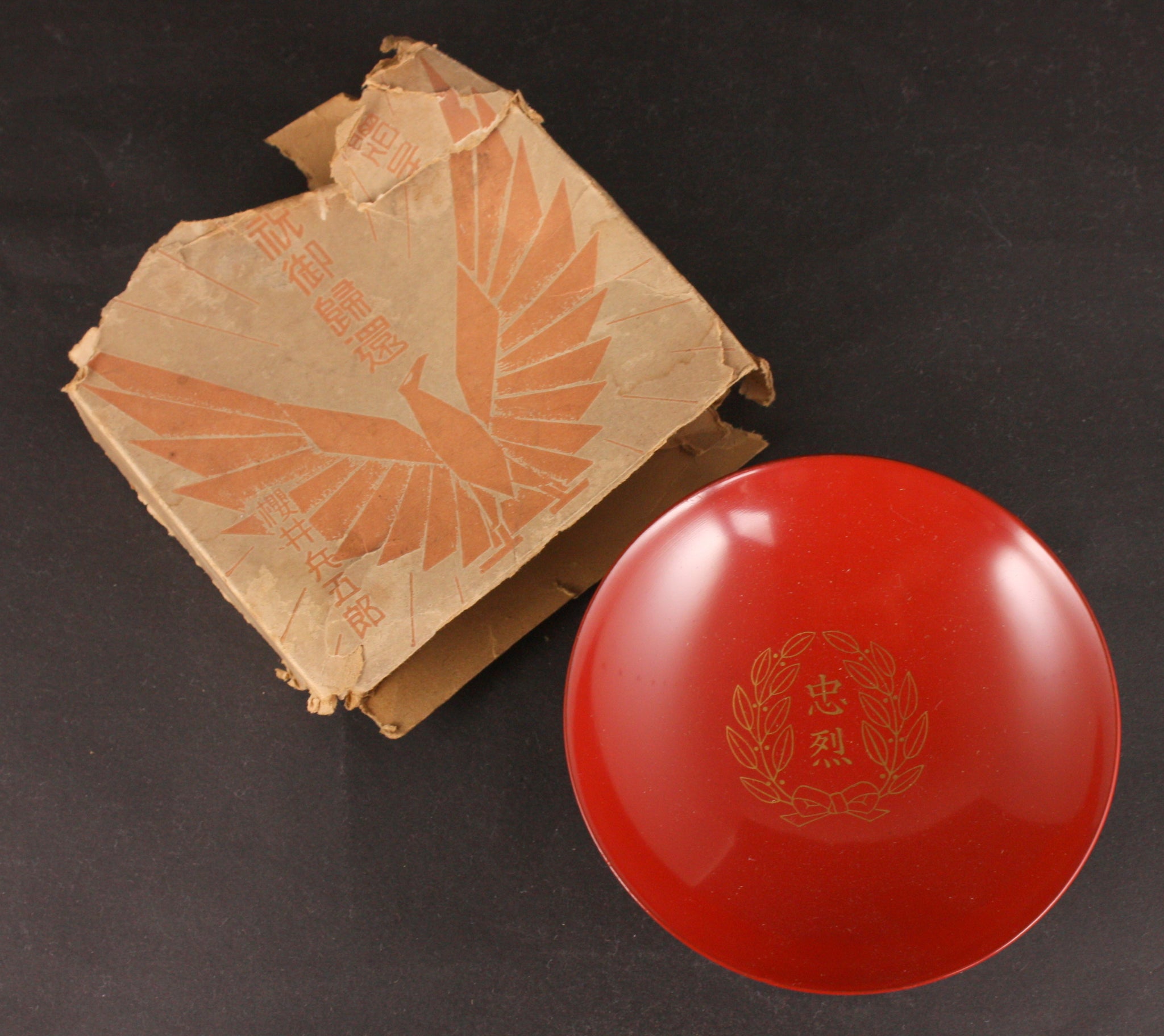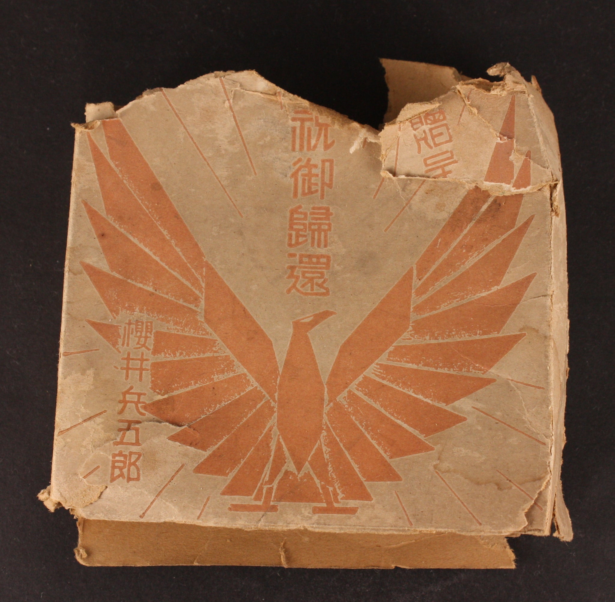 This is an antique Japanese military sake cup, decorated with a wreath with the words "Spirited Loyalty" in the center. The words on the back are "Gift by Sakurai Heigoro". The cup comes with an original cardboard box with a nice eagle design, also has the words "Congratulations on Coming Home" "Gift" and the same name, Sakurai Heigoro. I suppose this might be some local notable who made a bunch of these for returning soldiers.