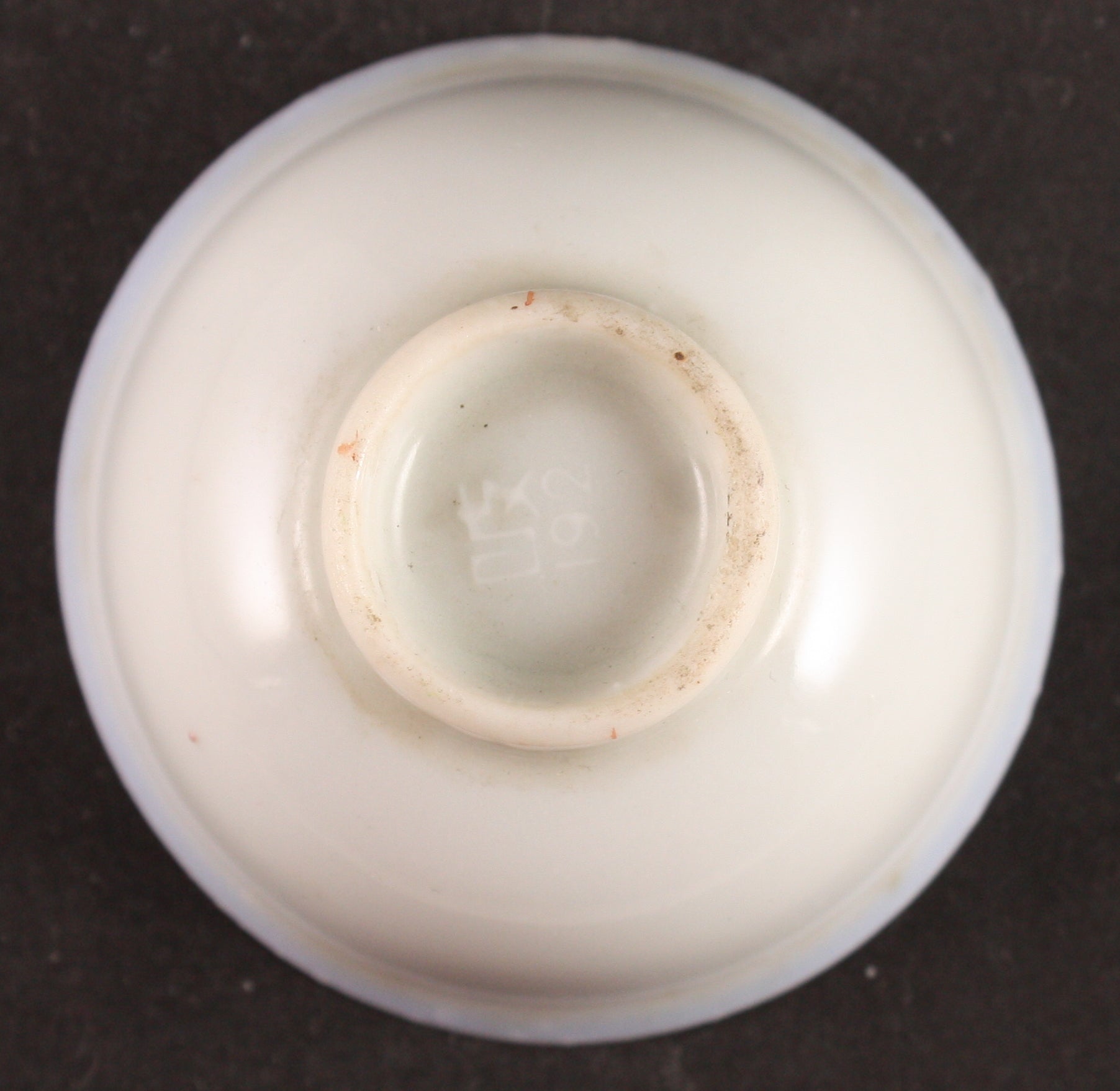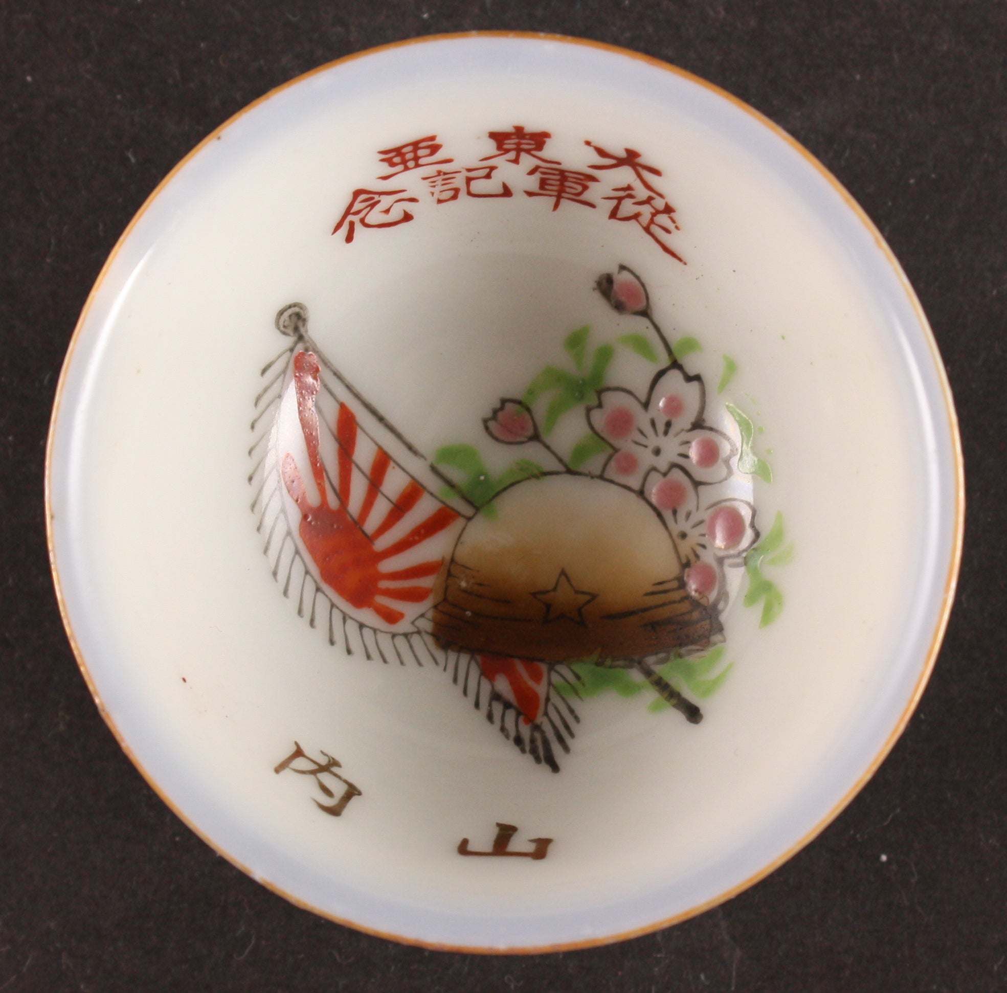 This is an antique Japanese military sake cup, decorated with a helmet, a flag, and some cherry blossoms. The words are "Great East Asia Participation in Army Commemoration" with the soldier's name Yamanouchi. The term Great East Asian War wasn't used until 1941.