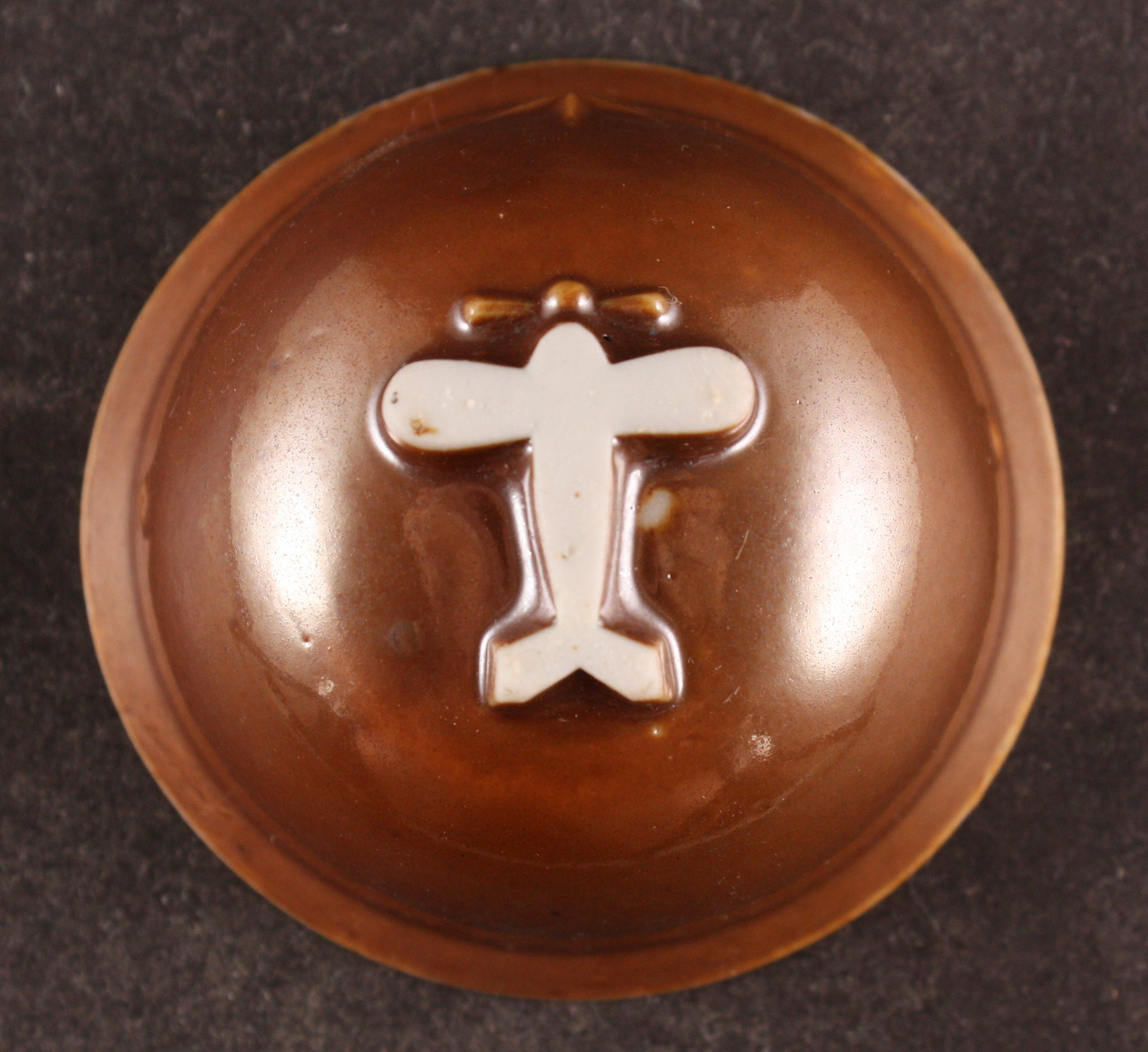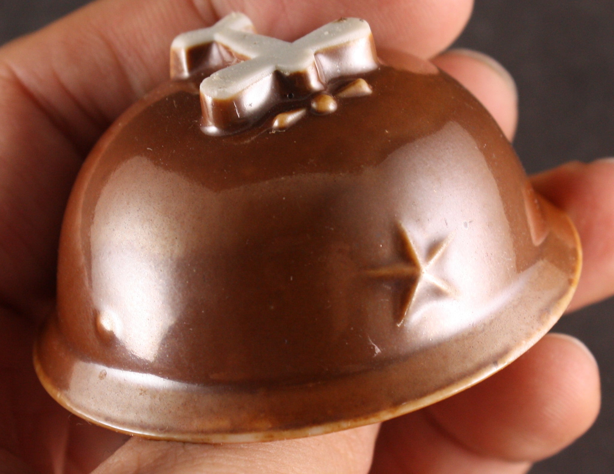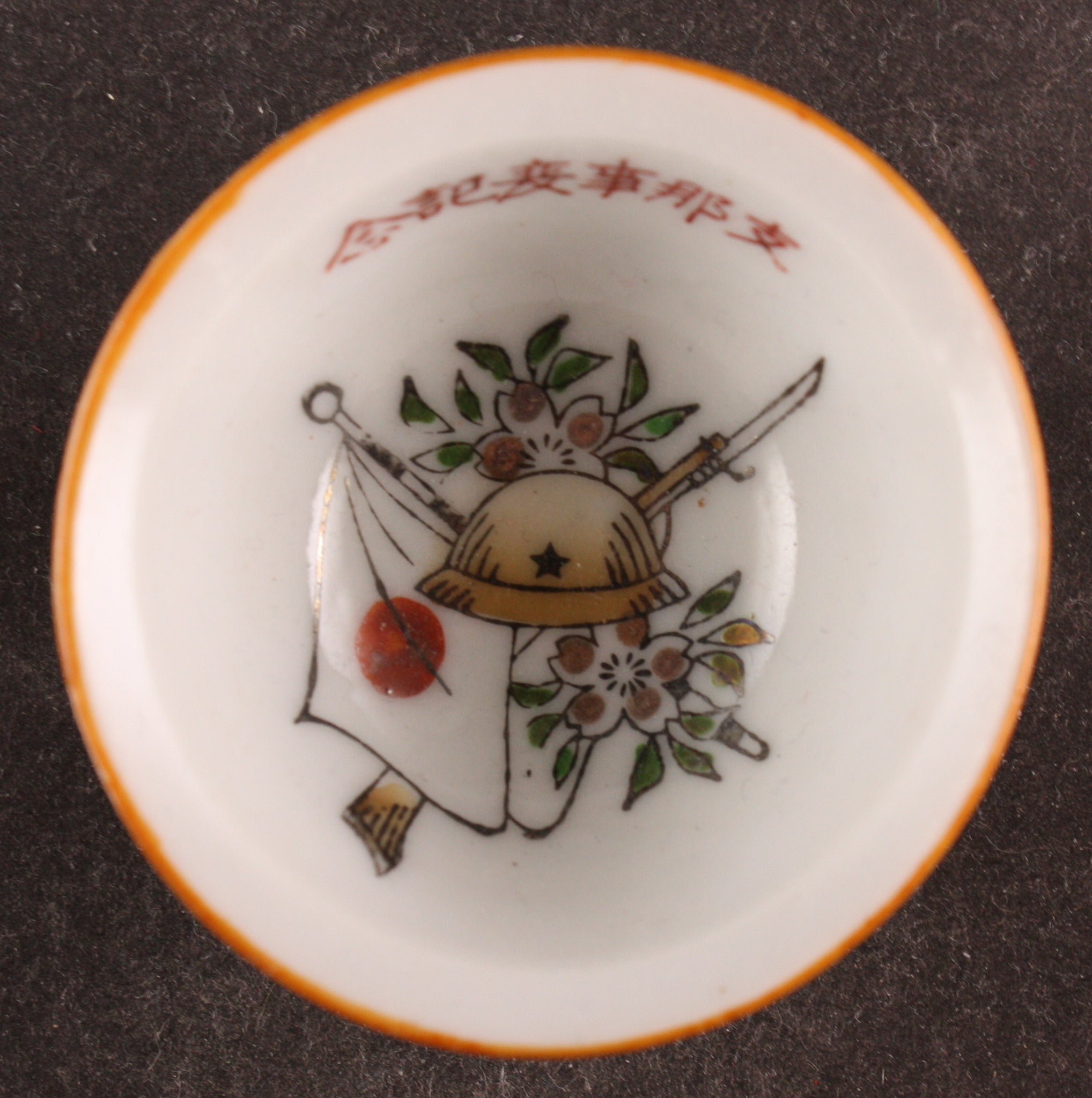 This is an antique Japanese military sake cup, decorated with a helmet, a rifle with bayonet, and a flag. The words are "China Incident Commemoration". The exterior of the cup is in the shape of a helmet with a plane as the base.