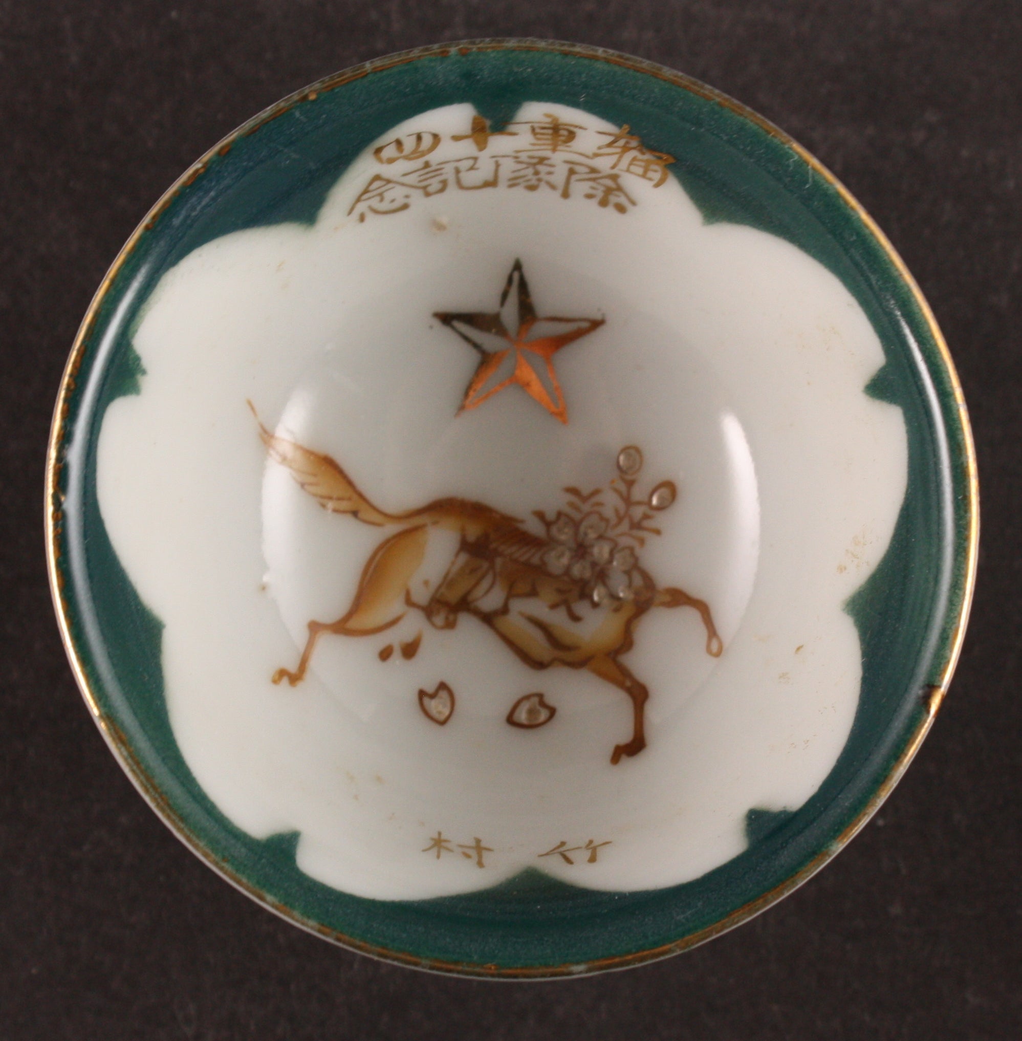 This is an antique Japanese military sake cup, decorated with a nicely done horse and a cherry blossom branch. The words are "14th Transport Discharge Commemoration" and the soldier's name Takemura.