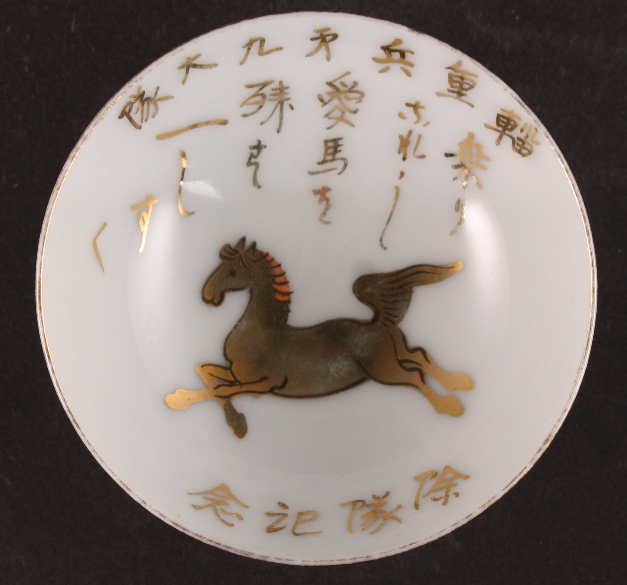 This is an antique Japanese military sake cup, decorated with a horse and a poem. The words are "Transport soldier 9th battalion" "Discharge Commemoration".