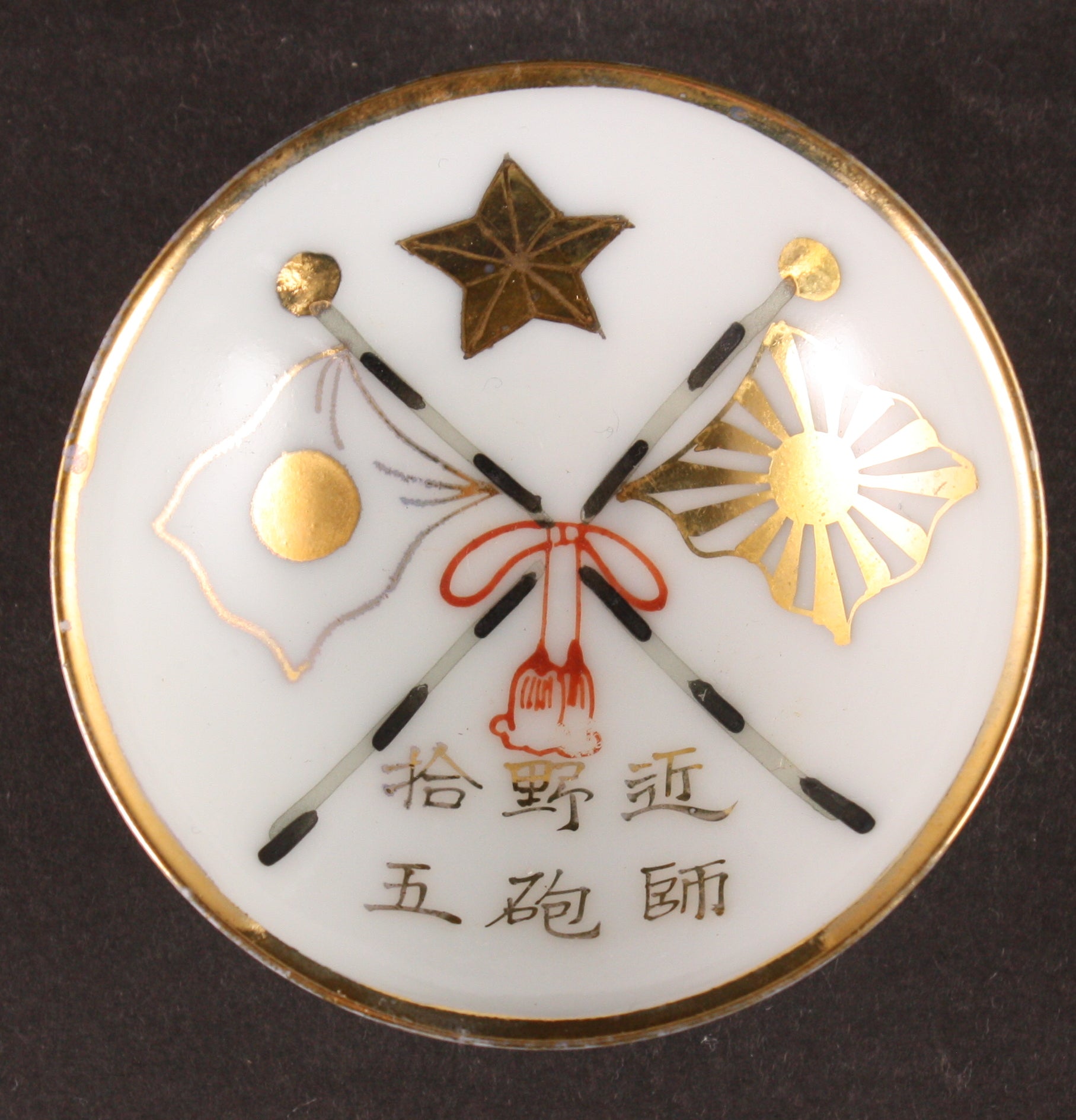 This is an antique Japanese military sake cup, decorated with a pair of flags, a star, and the words "Imperial Guards Division 15th Field Artillery". This is probably an artillery company.