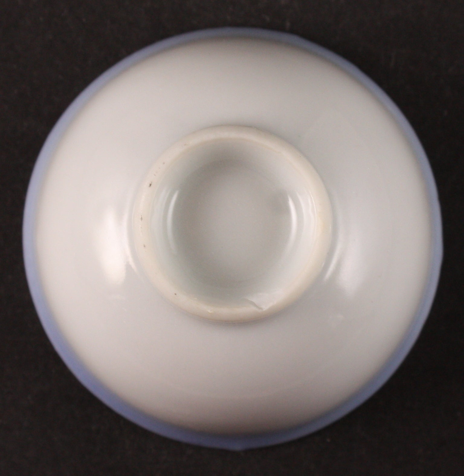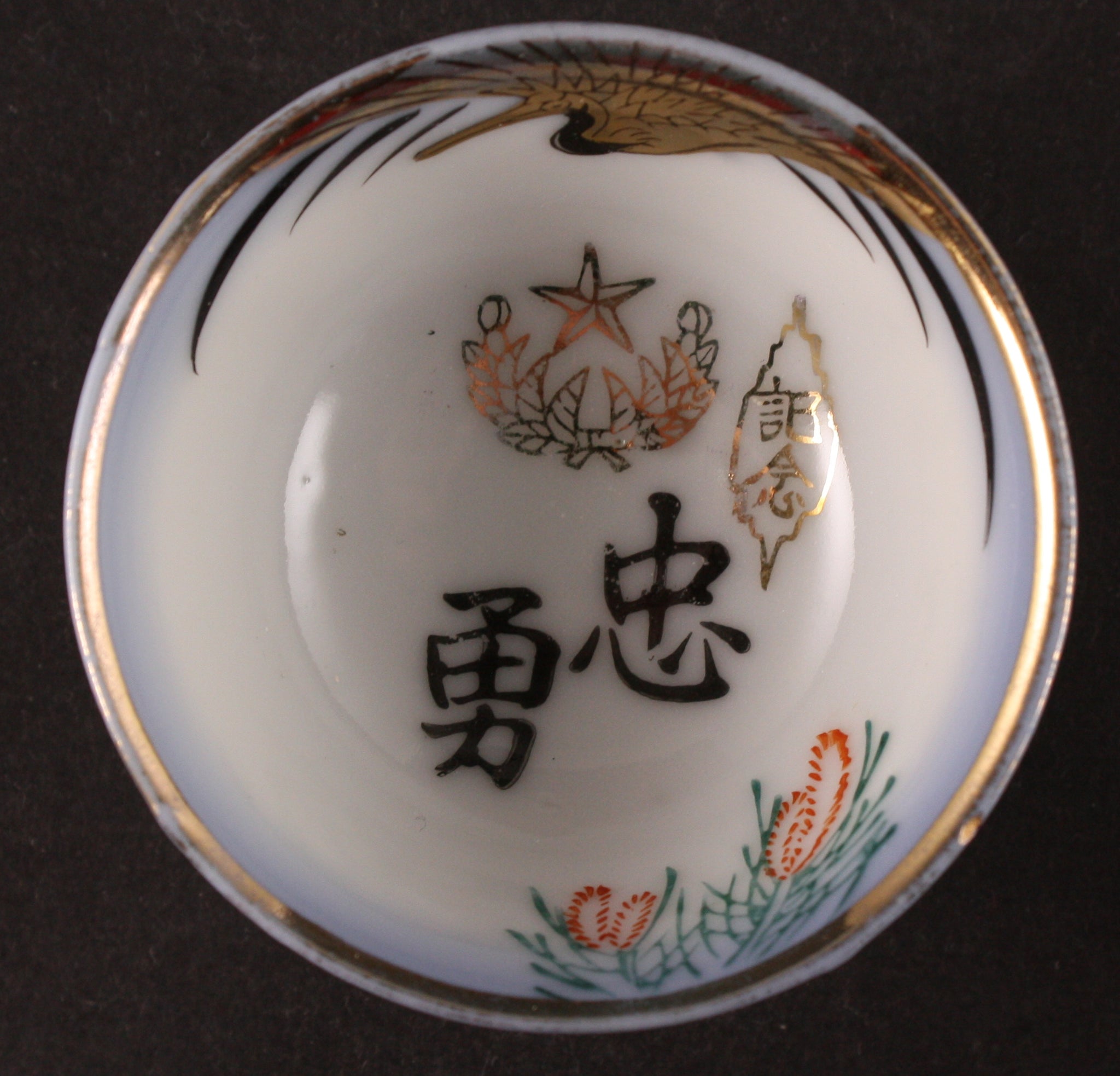 This is an antique Japanese military sake cup, decorated with a crane, an insignia of the Imperial Guards, the big words "Loyalty and Bravery" and some flowers. The words in gold are "Commemoration".