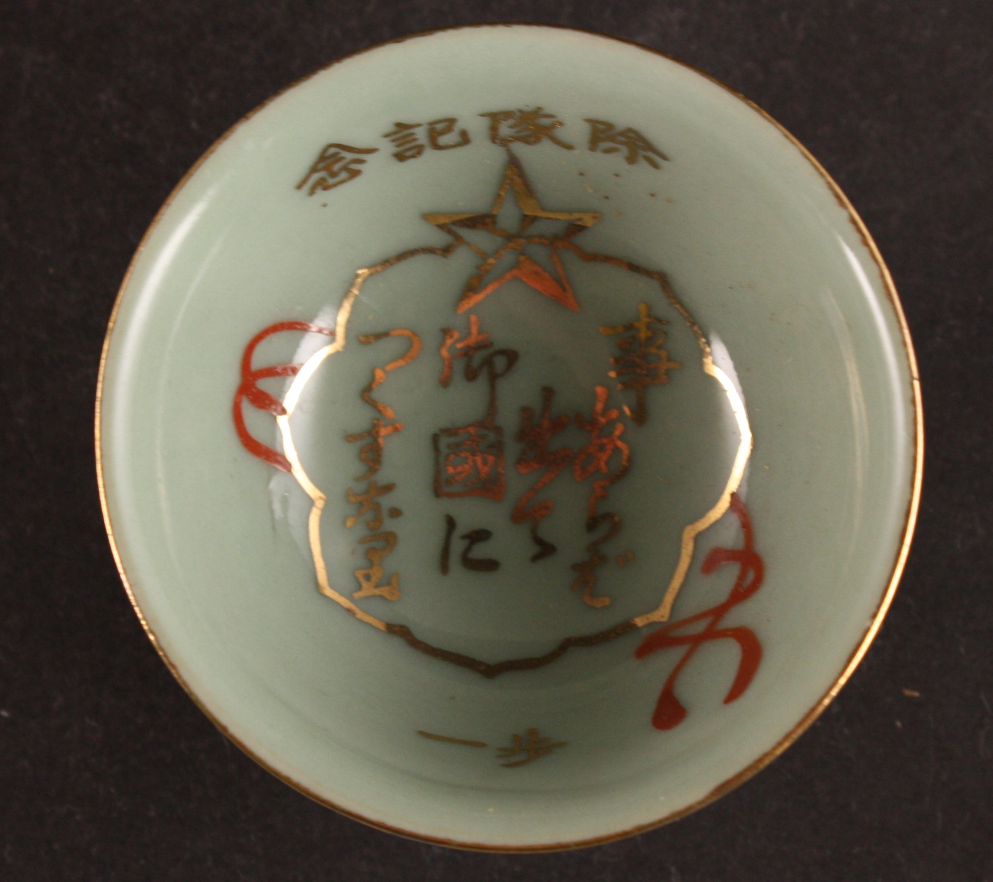 This is an antique Japanese military sake cup, decorated in the middle with the shape of the imperial mirror and a poem, and a star on top. The words are "Discharge Commemoration" "1st Infantry".