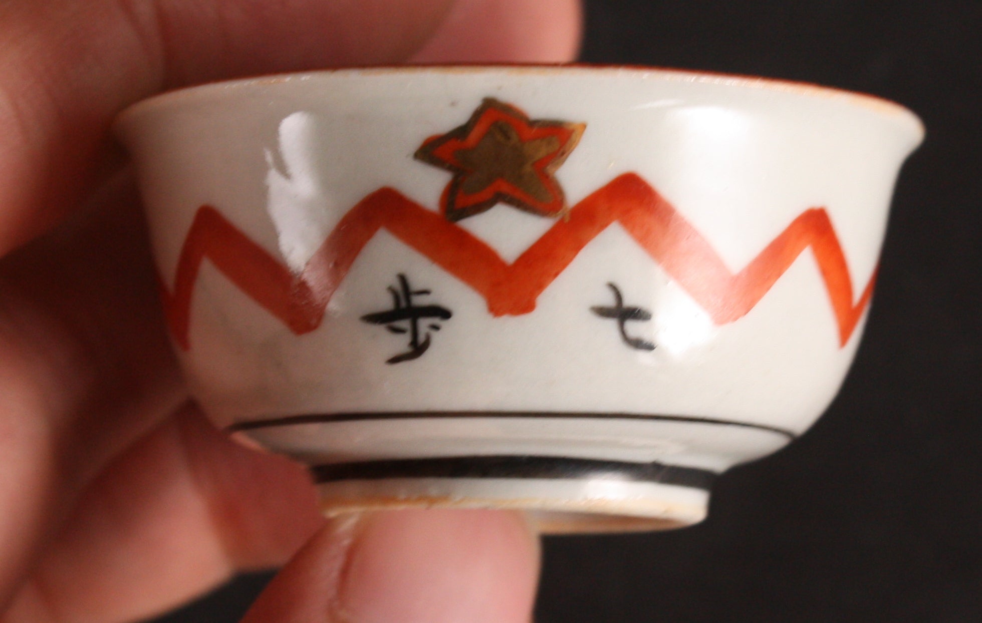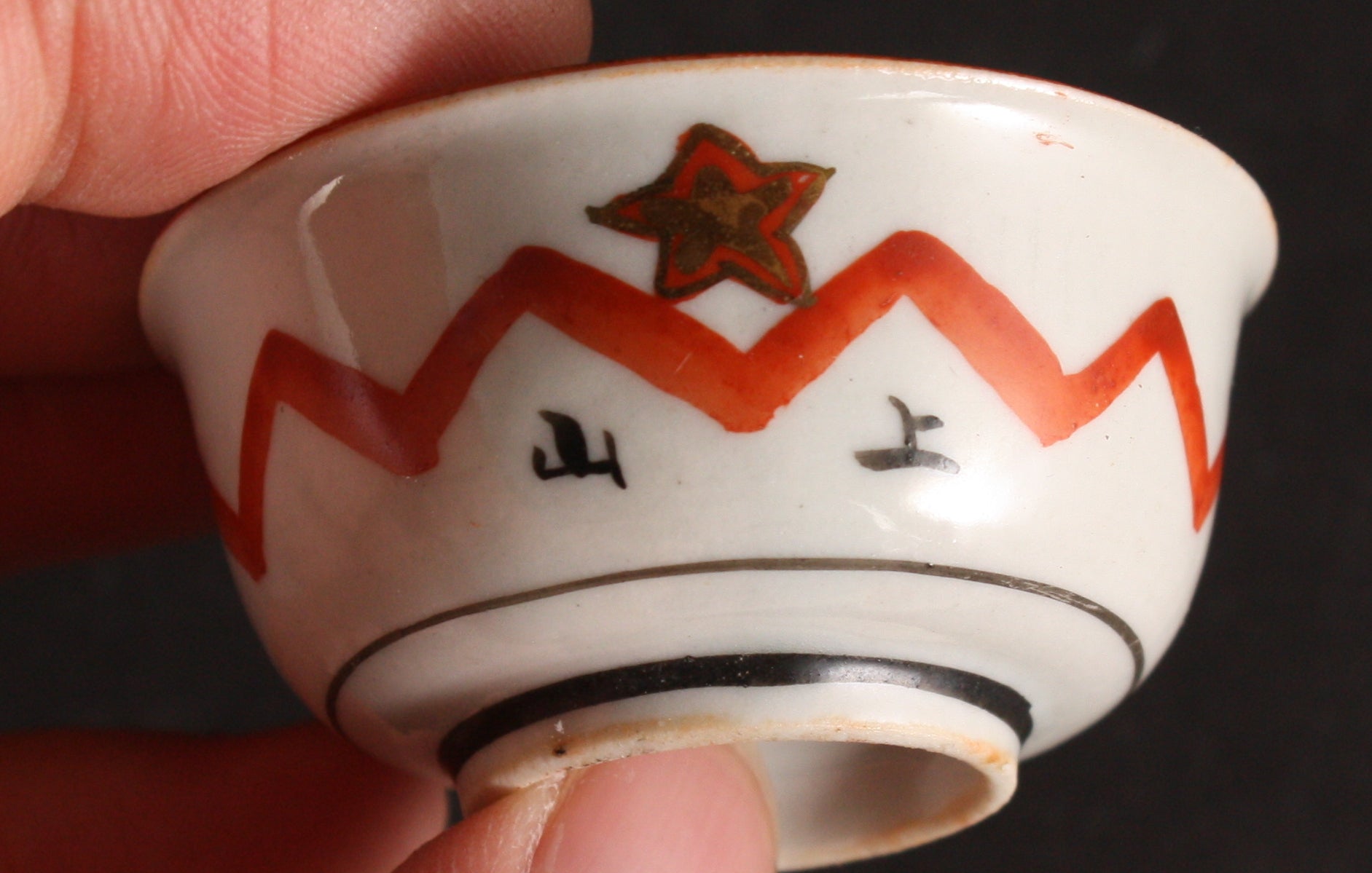 This is an antique Japanese military sake cup, decorated with a pair of flags and the words "Discharge Commemoration" in the center. The exterior is decorated with stars and the words "7th Infantry" and the soldier's name Kamiyama. The star and zigzag line decoration on the outside is quite unusual.