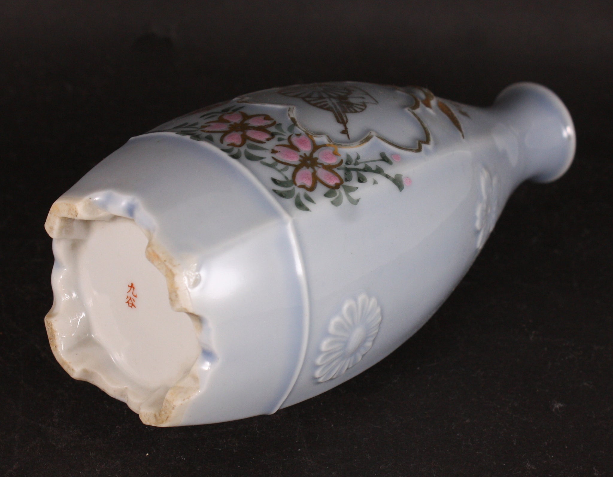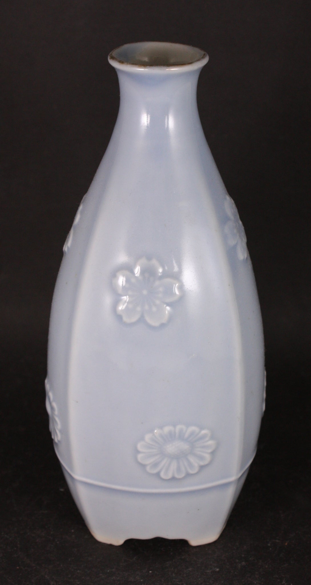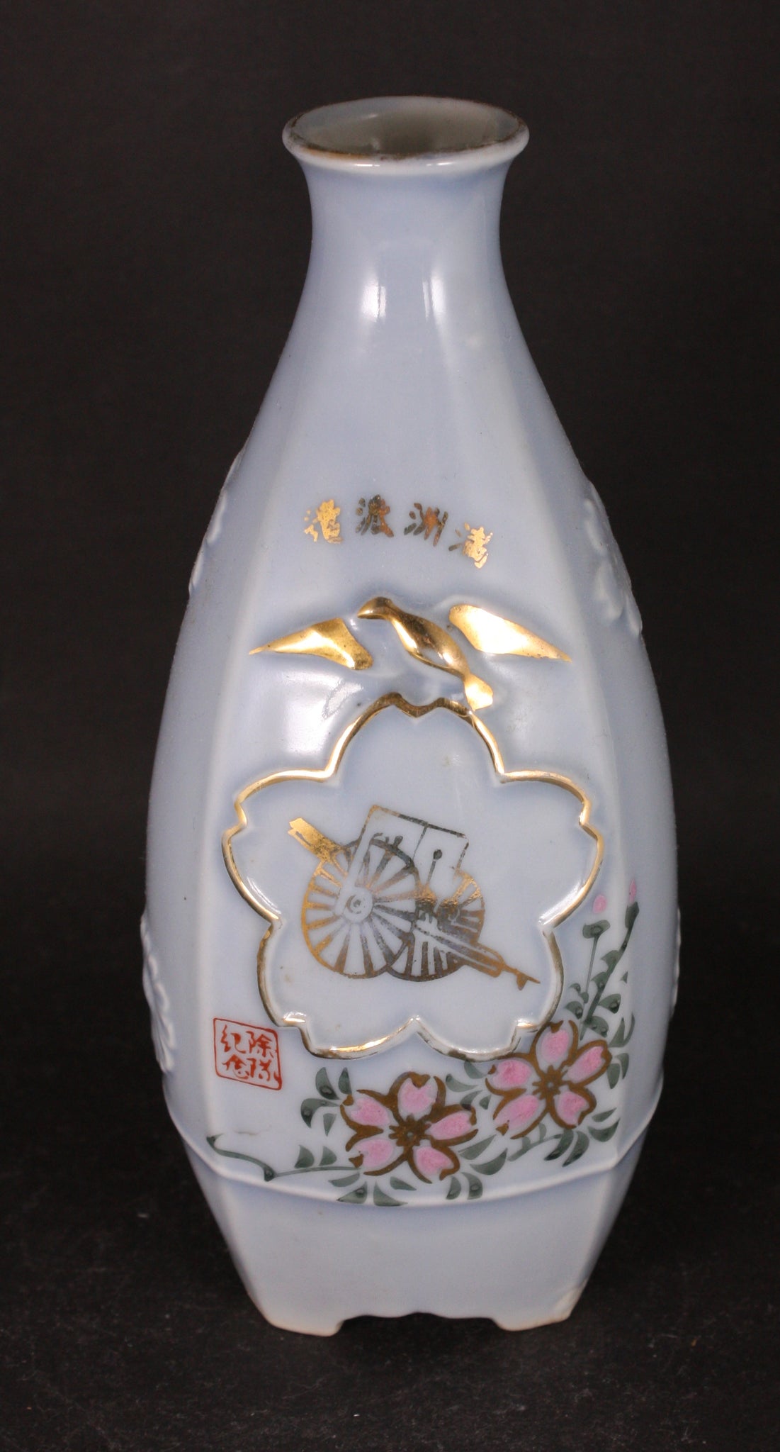This is an antique Japanese military sake bottle, decorated with a field gun, an embossed eagle, and some cherry blossoms. The words are "Manchuria dispatch" and in red "Discharge Commemoration".