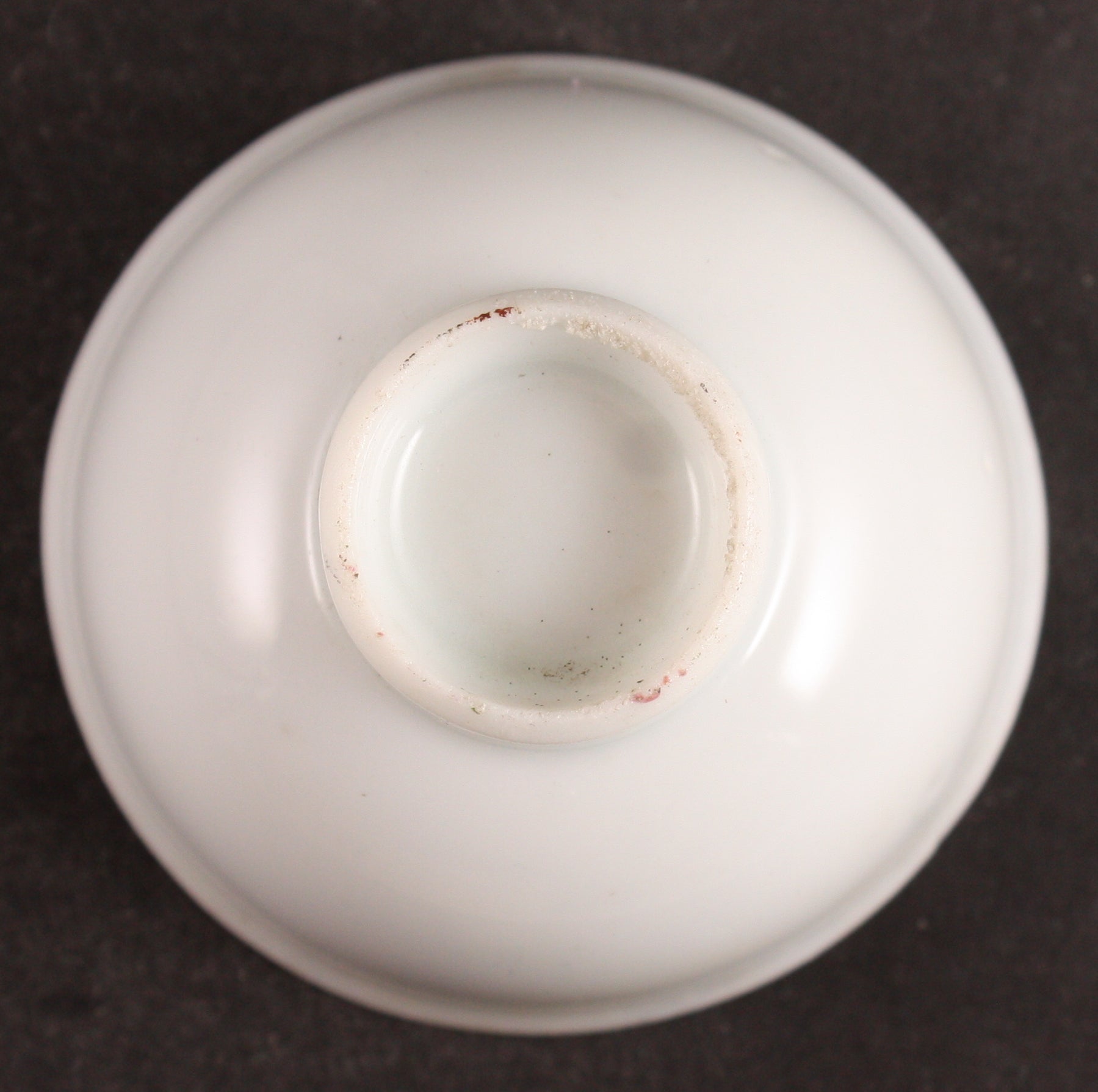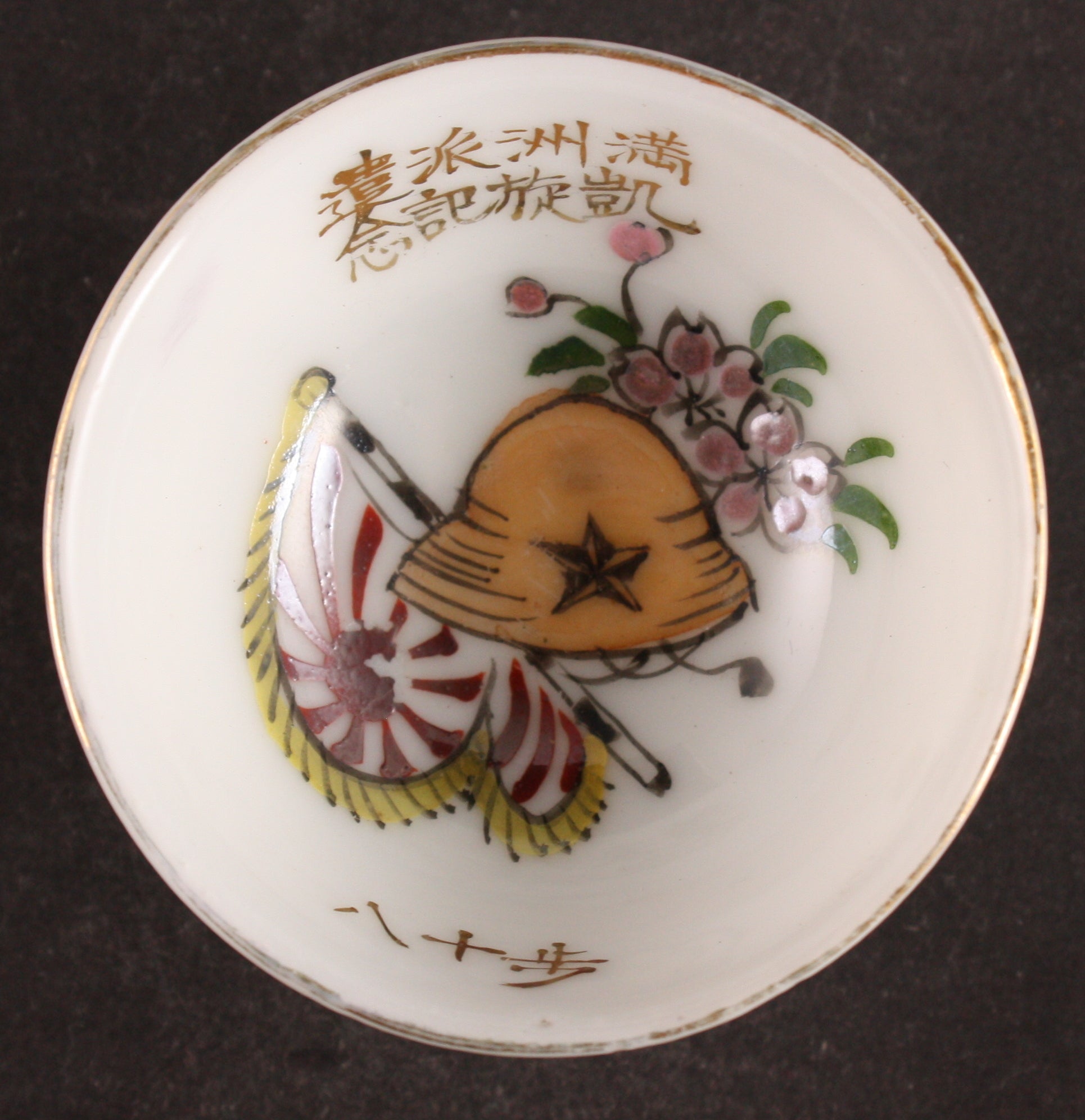 This is an antique Japanese military sake cup, decorated with a pith helmet, a flag, and some cherry blossoms. The words are "Manchuria Dispatch Victorious Return Commemoration" "18th Infantry".