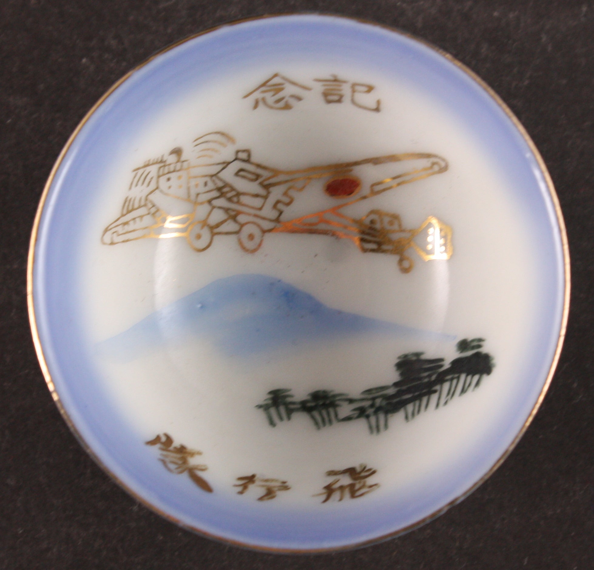 This is an antique Japanese military sake cup, decorated with what looks like the Mitsubishi G3M bomber, flying over the Mount Fuji and trees. The words are "Commemoration" "Flying Unit". The soldier's name Tayo is on the back.