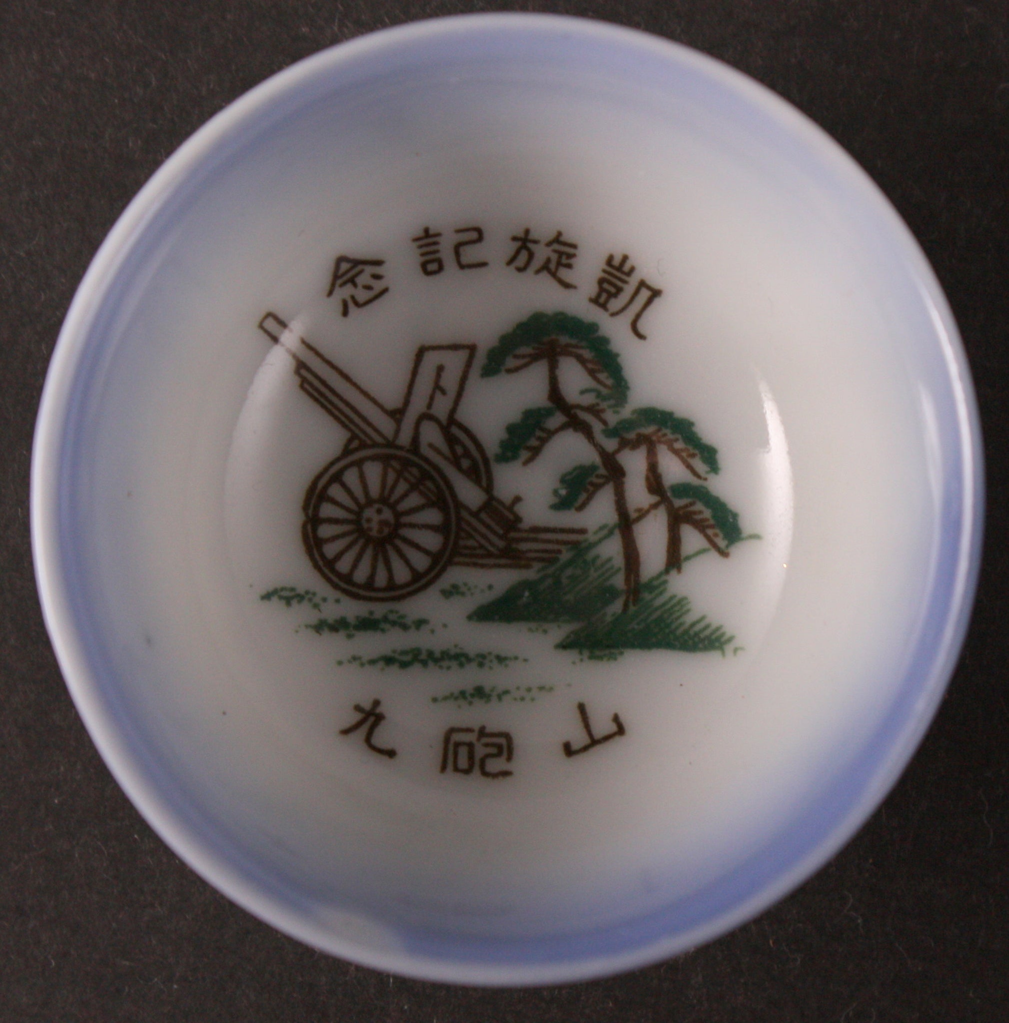 This is an antique Japanese military sake cup, decorated with a field gun and a pine tree. The words are "Victorious Return Commemoration" and "9th Mountain Artillery".