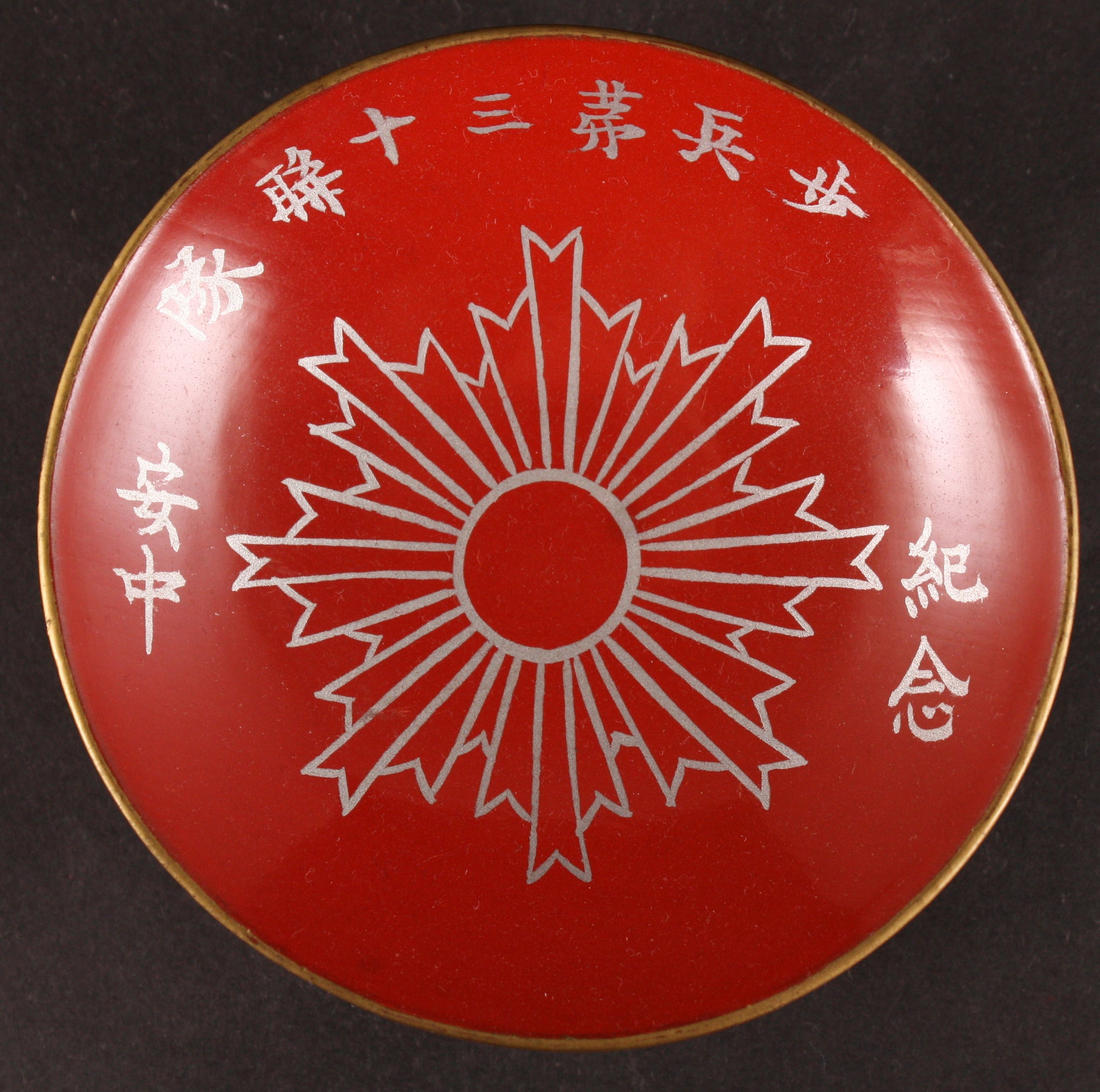 This is an antique Japanese military sake cup, decorated with a badge of the Order of Rising Sun, and the words "30th Infantry Regiment" "Commemoration" and the soldier's name Yasunaka.