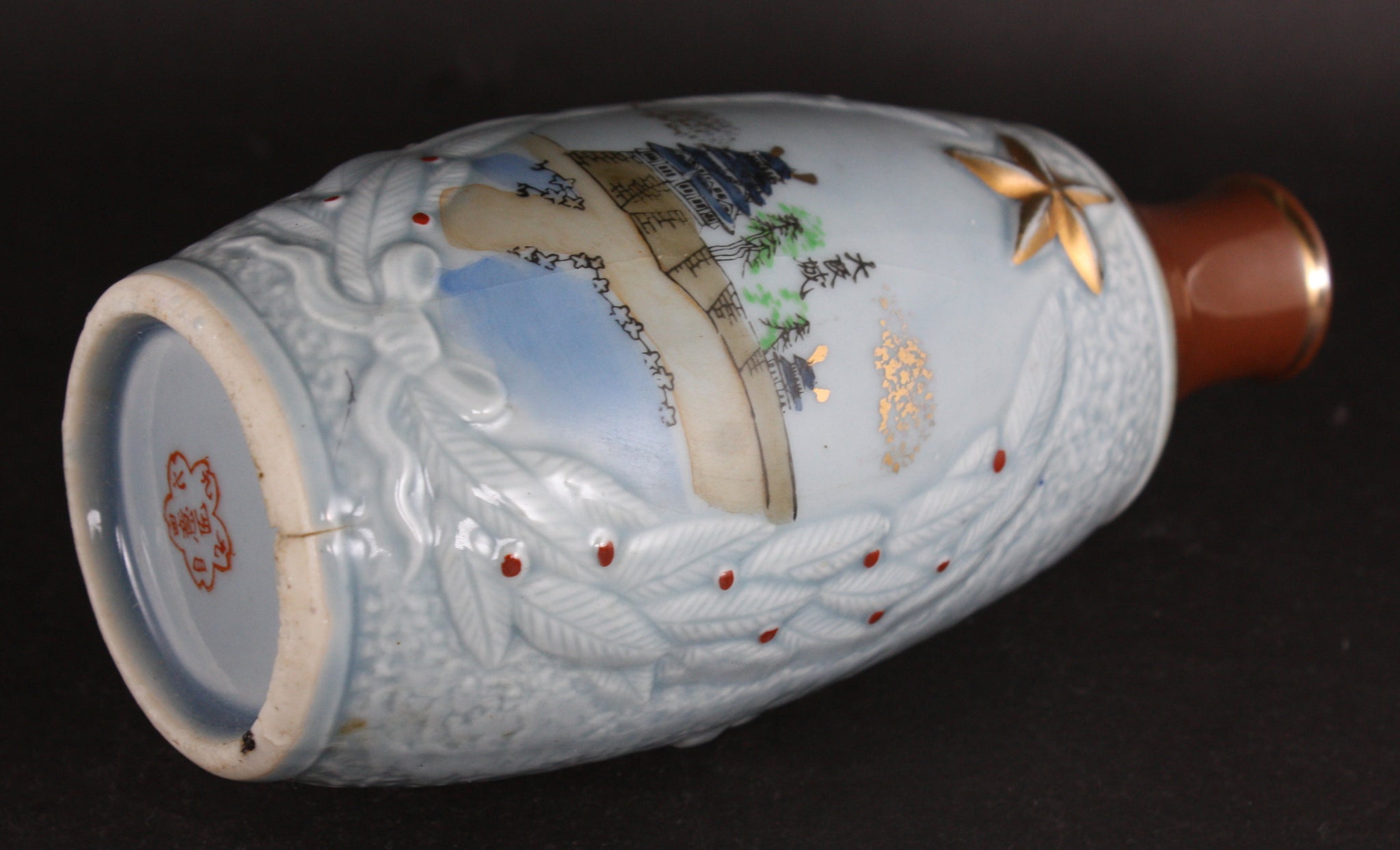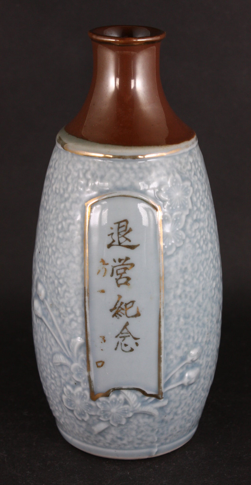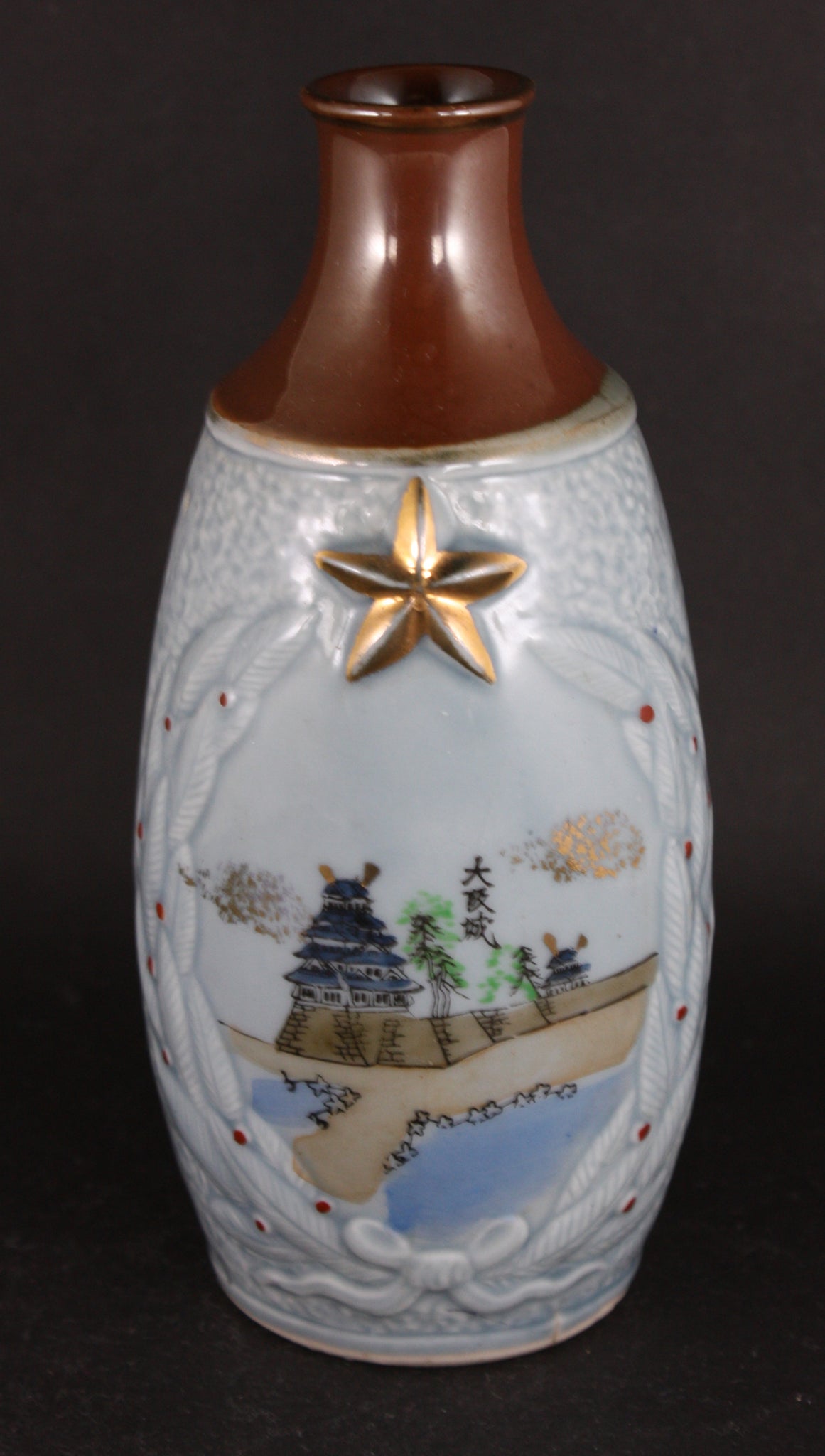 This is an antique Japanese military sake bottle, decorated with a very nicely detailed Osaka Castle and an embossed wreath and star. The words on the back are "Leaving the service commemoration". The mark on the base is for registered design.