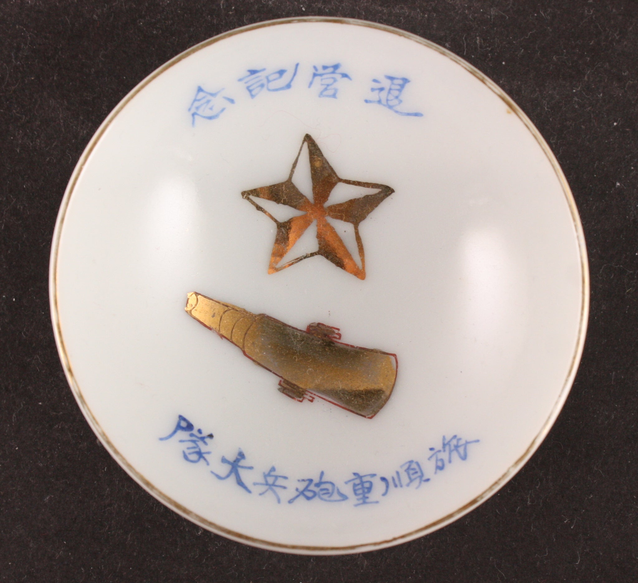 This is an antique Japanese military sake cup, decorated with a cannon and a star, and the words "Leaving the service commemoration" "Port Arthur Heavy Artillery Battalion" and the soldier's name Hori is on the back. This refers to the Port Arthur fortifications that guarded the port itself.