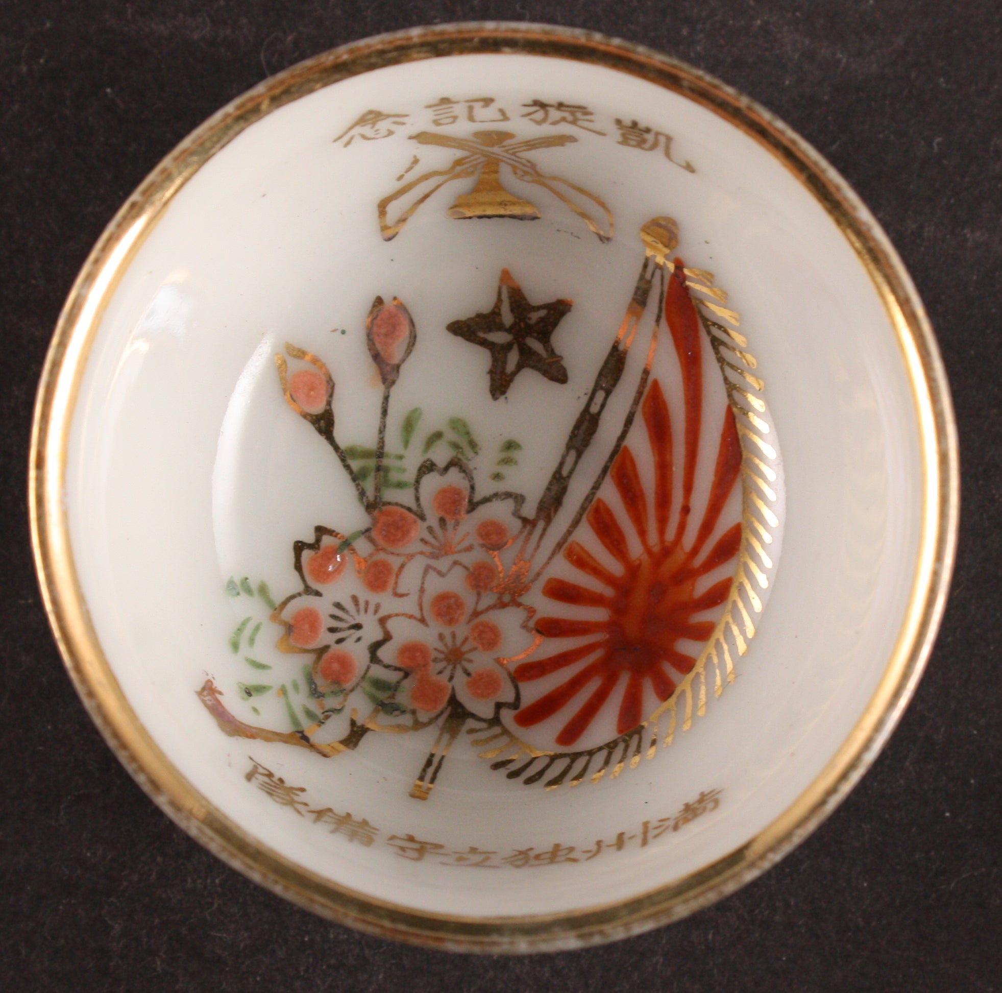 This is an antique Japanese military sake cup, decorated with a flag and cherry blossom and an insignia of the railroad units. The words are "Victorious Return Commemoration" "Manchuria Independent Defense Unit". The exterior of the cup is decorated with a landscape and the name of the kiln Kutani is in the base.