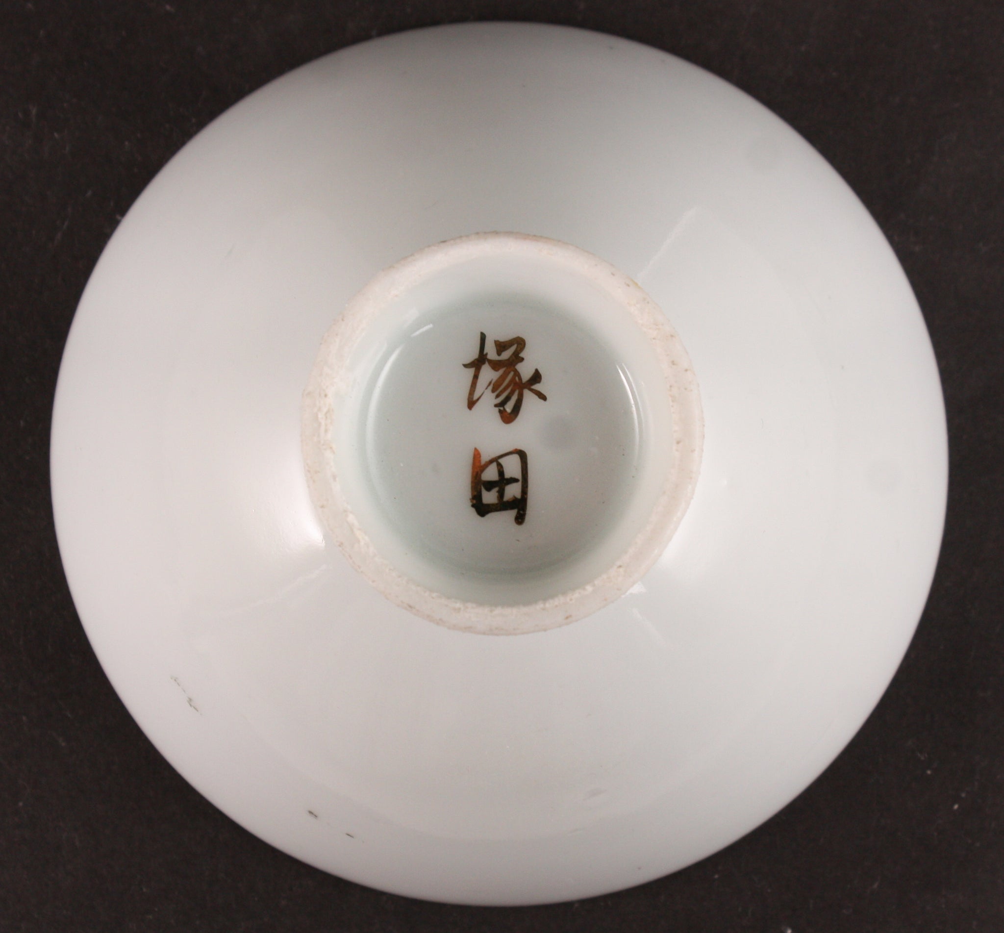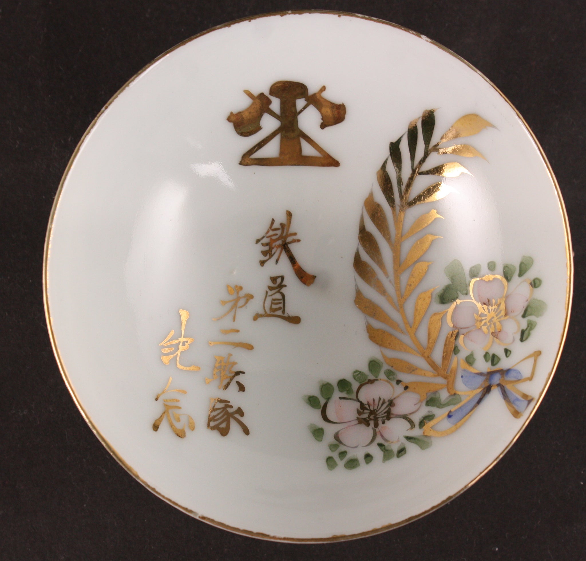 This is an antique Japanese military sake cup, decorated with a wreath, some cherry blossoms, and an insignia of the railroad regiment. The words are "2nd Railroad Regiment Commemoration" and the soldier's name Tsukada is on the back.