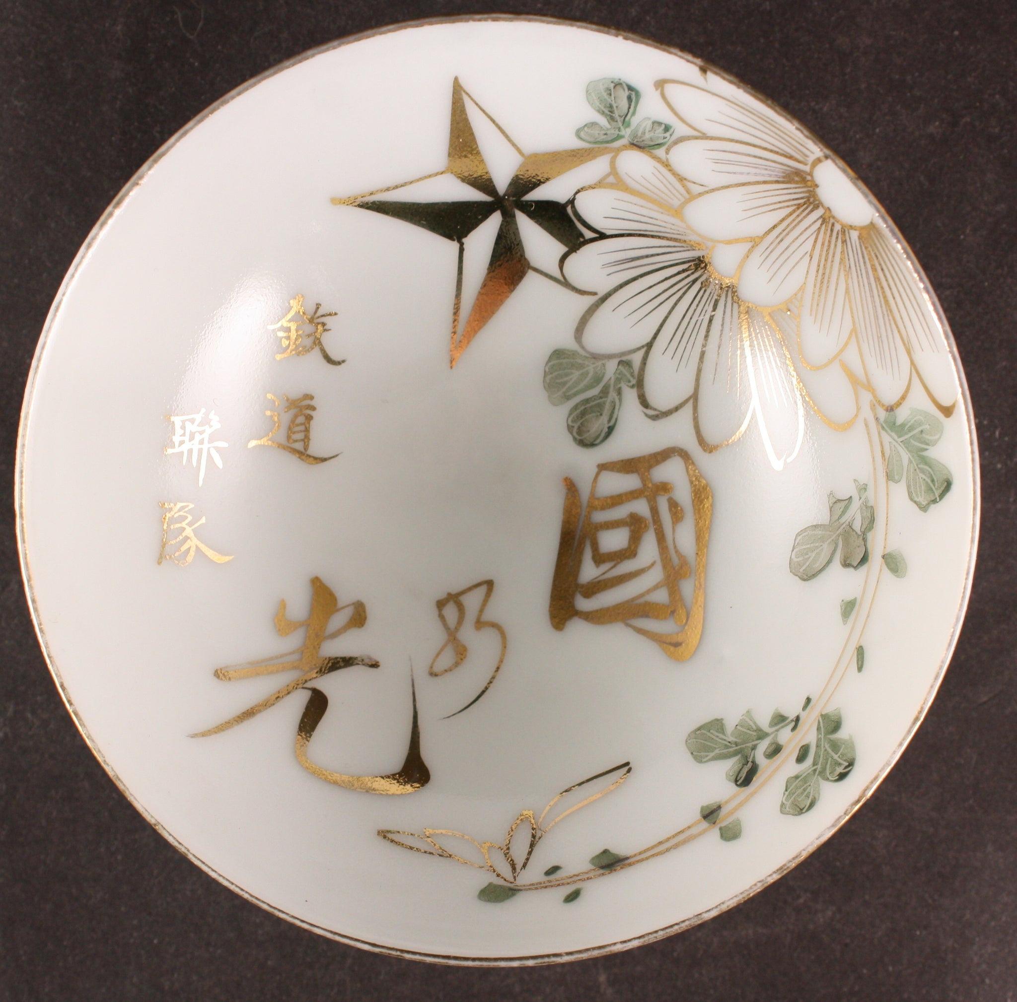 This is an antique Japanese military sake cup, decorated with a pair of chrysanthemum, the big words "Glory of the Nation" and the smaller words "Railroad Regiment".
