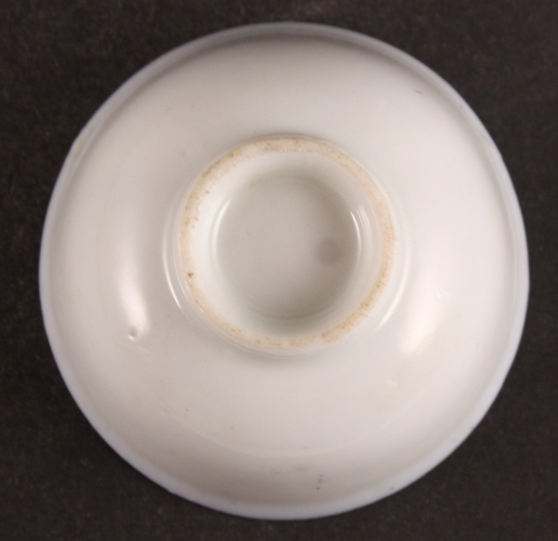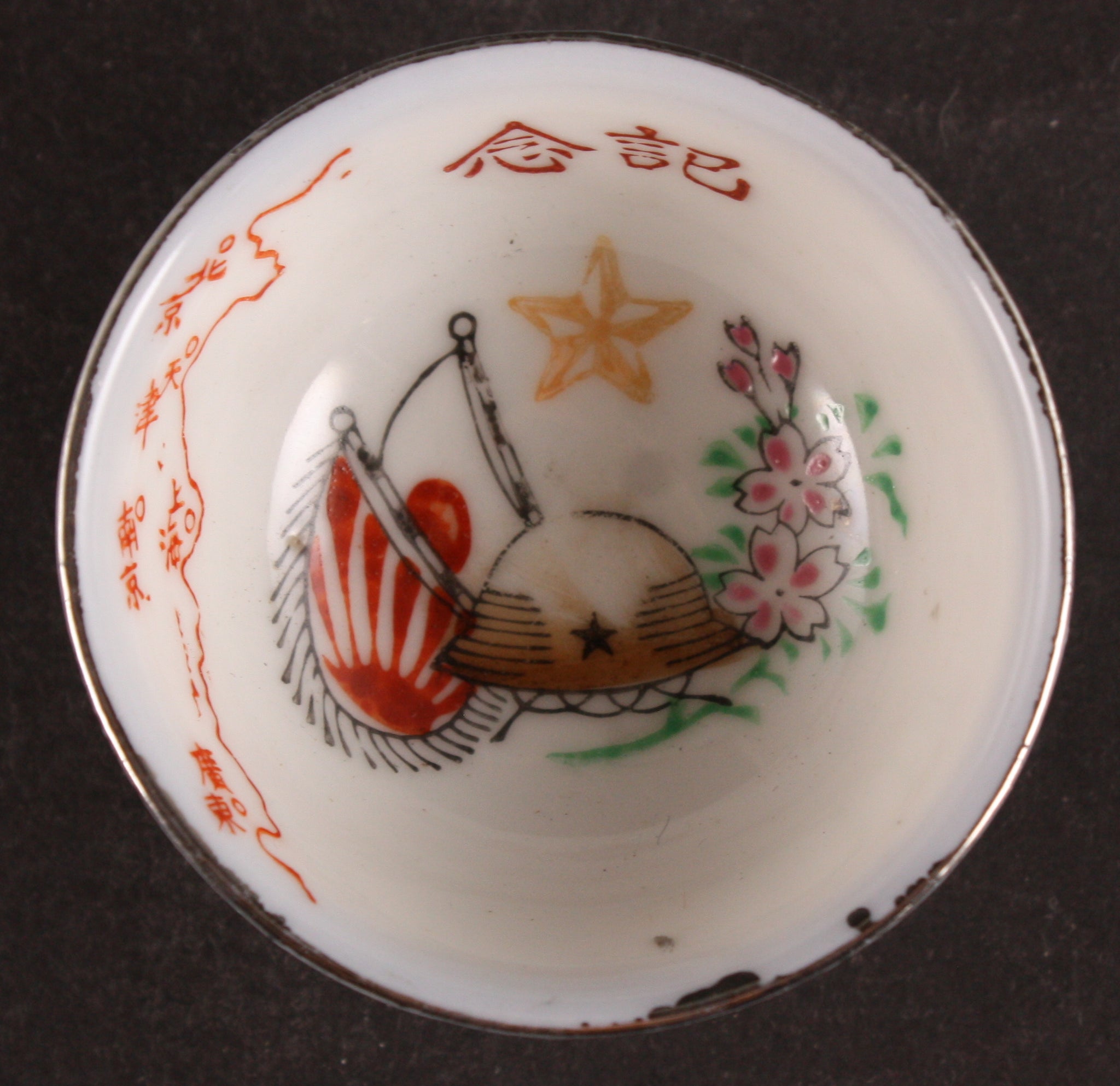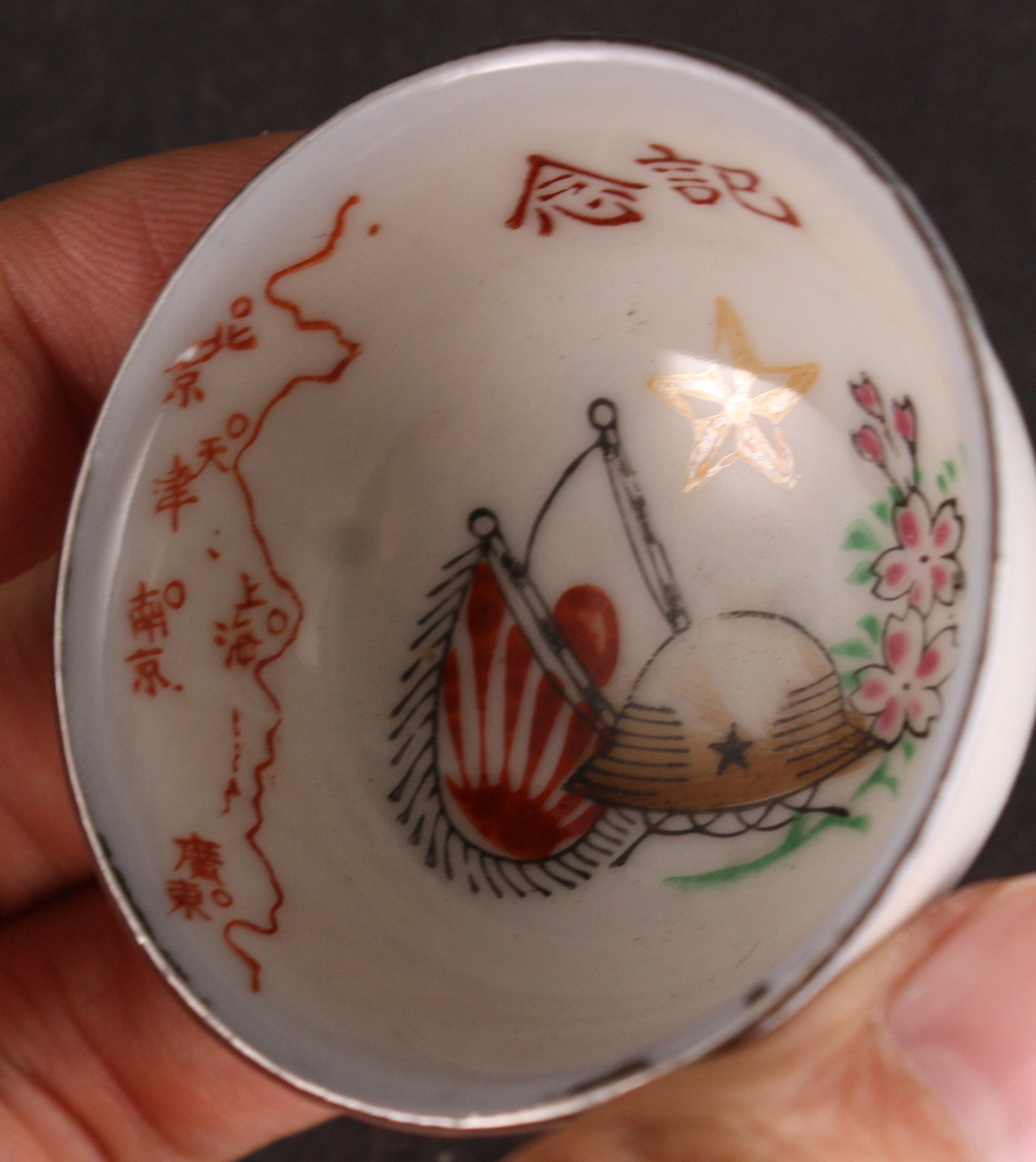 This is an antique Japanese military sake cup, decorated with a helmet, a pair of flags, and some cherry blossoms. The words are "Commemoration". The cup is rather unique in having a map on the left side of the cup showing Shanghai and other major coastal cities of China. This is quite likely for the China Incident when Japan invaded in 1937.