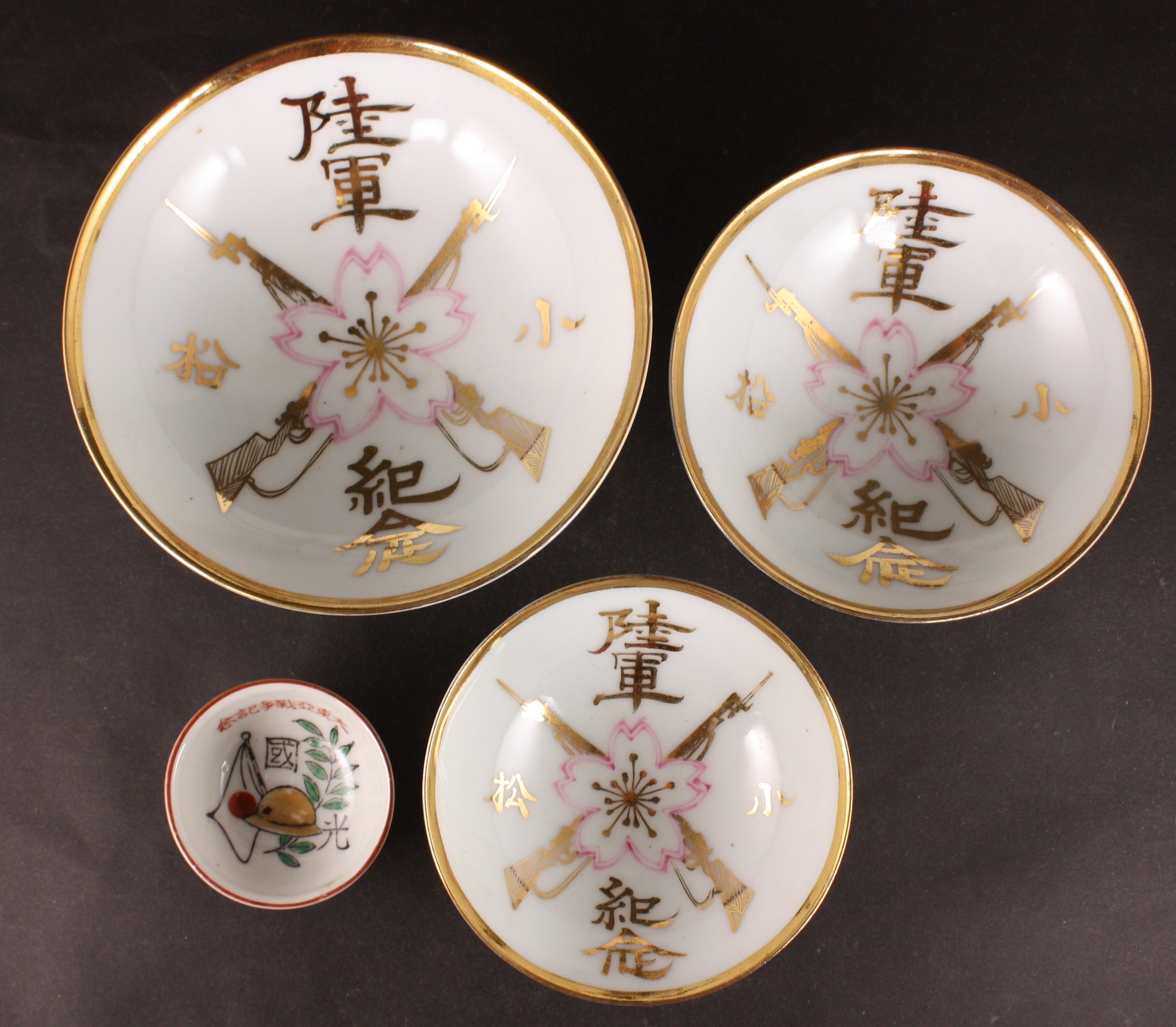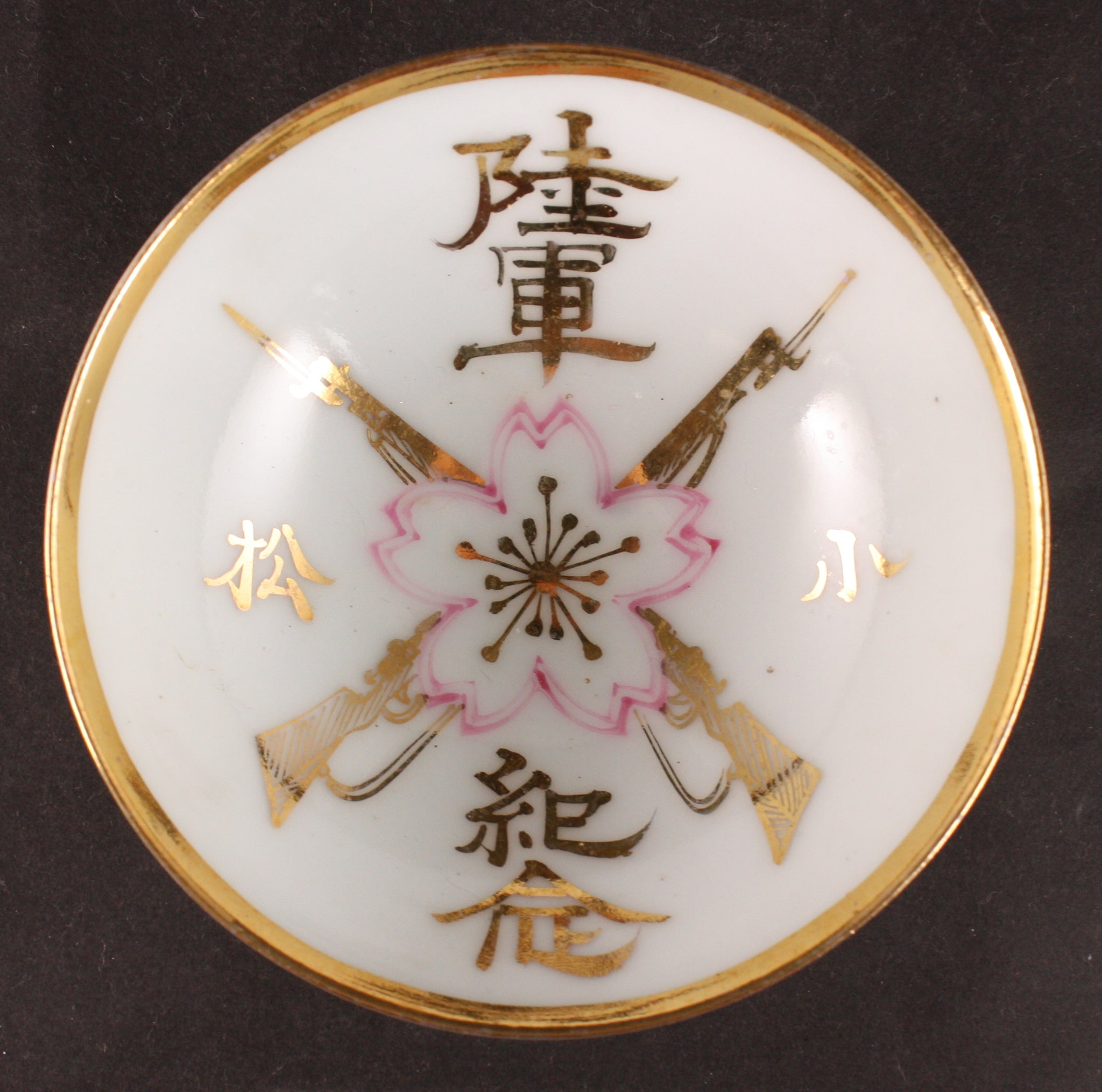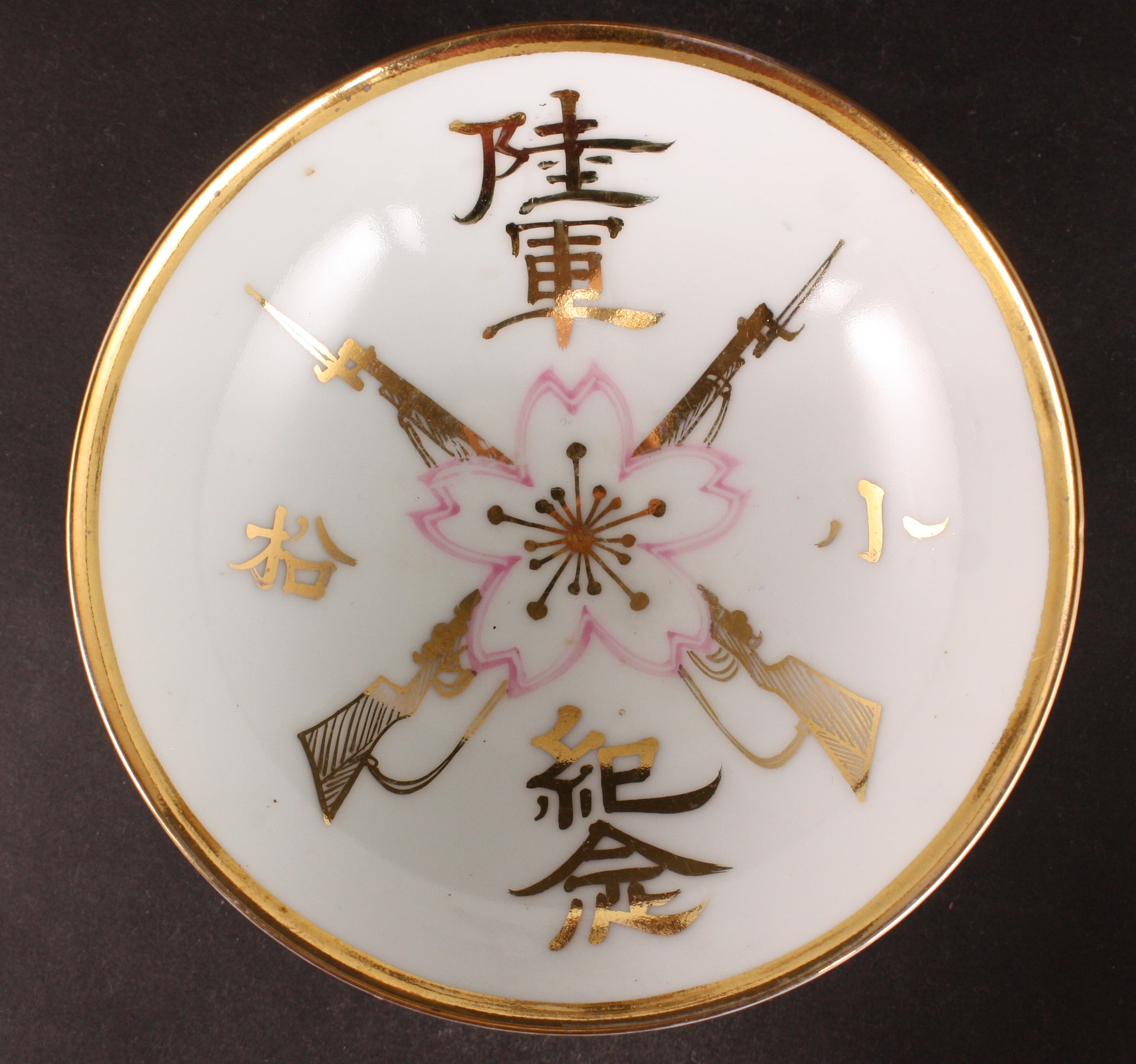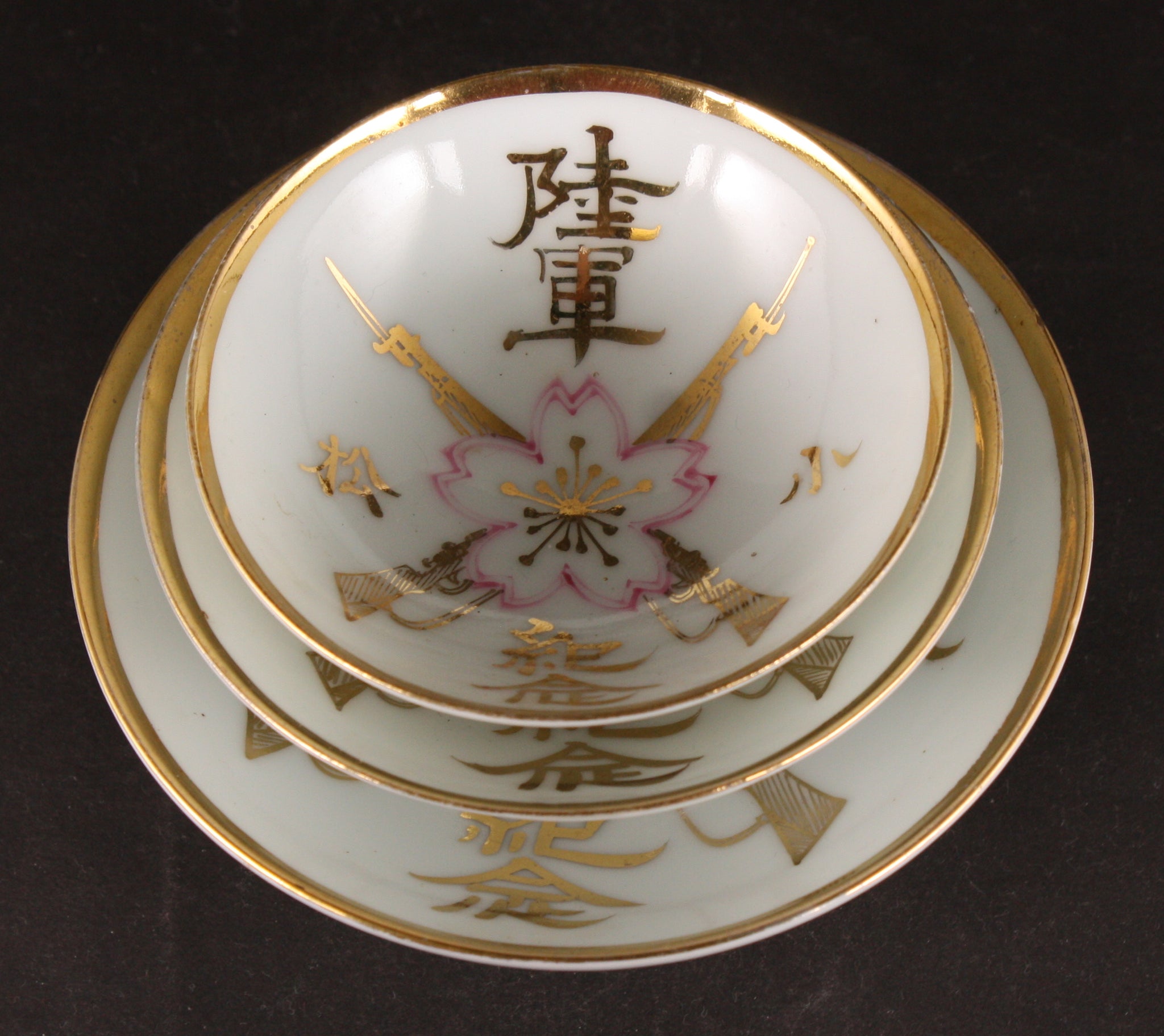 This is a set of 3 antique Japanese military sake cups, decorated each with a crossed pair of rifles, a cherry blossom in the center, and the words "Army Commemoration" and the soldier's name Komatsu. Cups with this design are usually for someone who received the marksmanship award, even though proportionally the cherry blossom here is a little small. The cups, however, are very large - I've included a 2" cup in one of the pictures for scale.