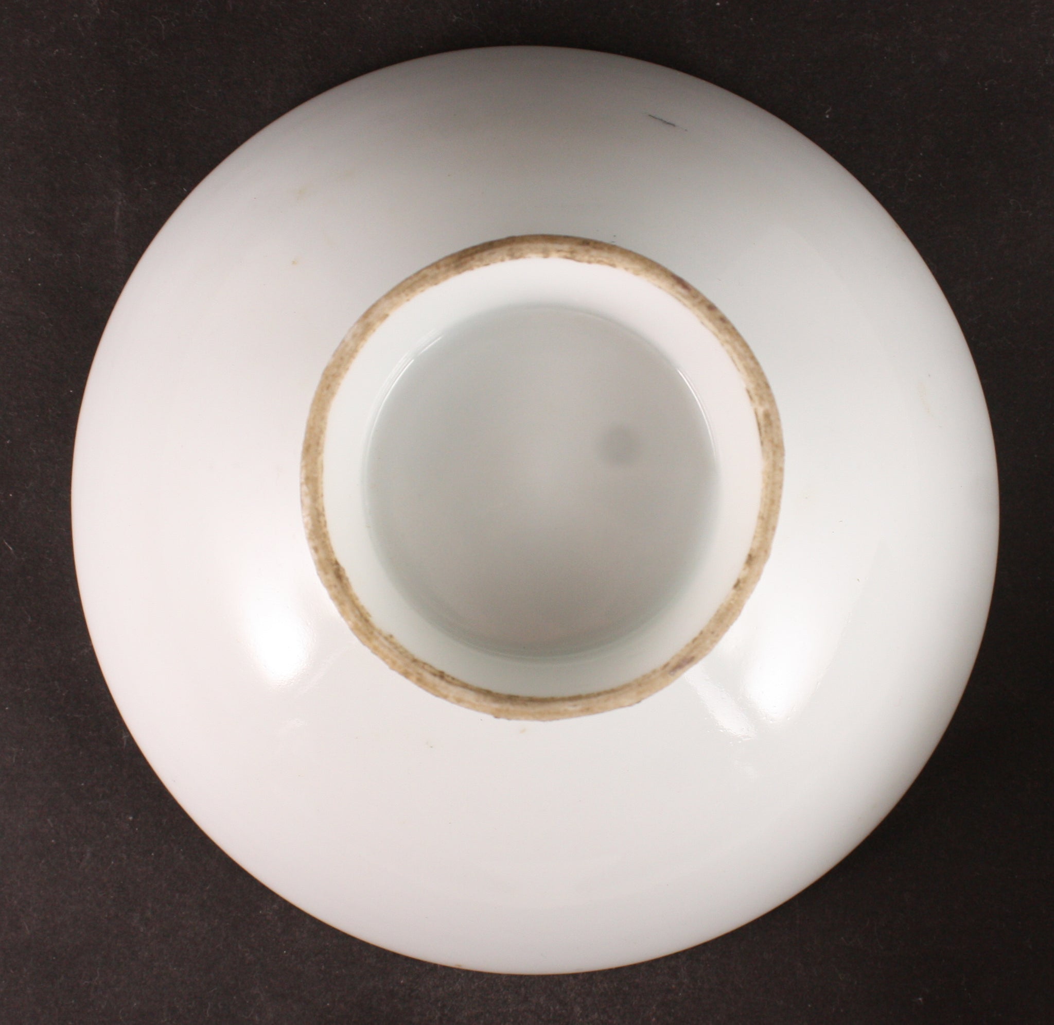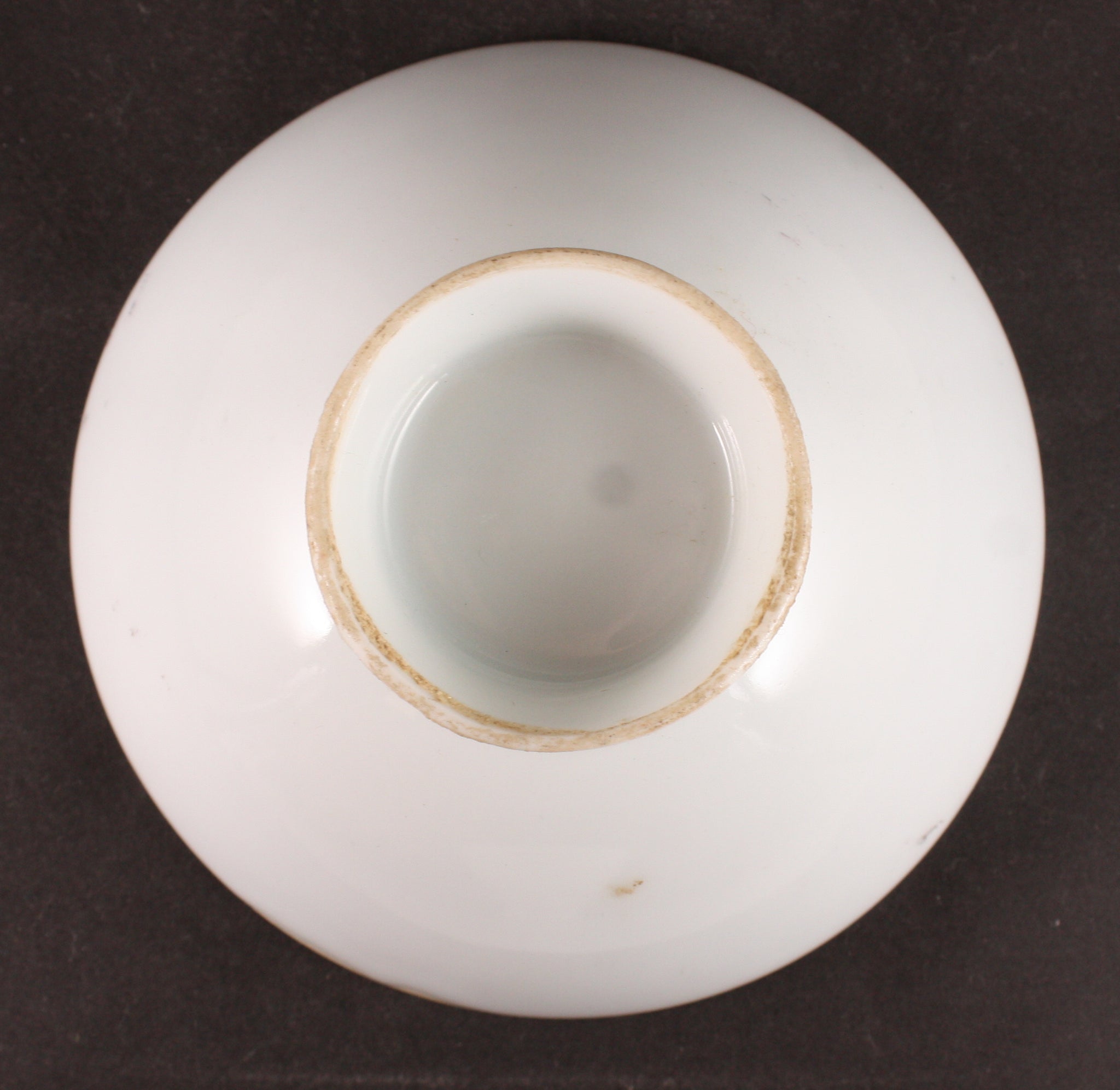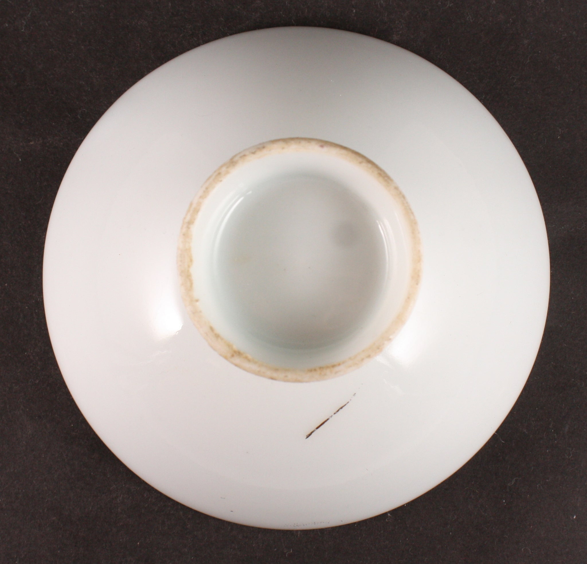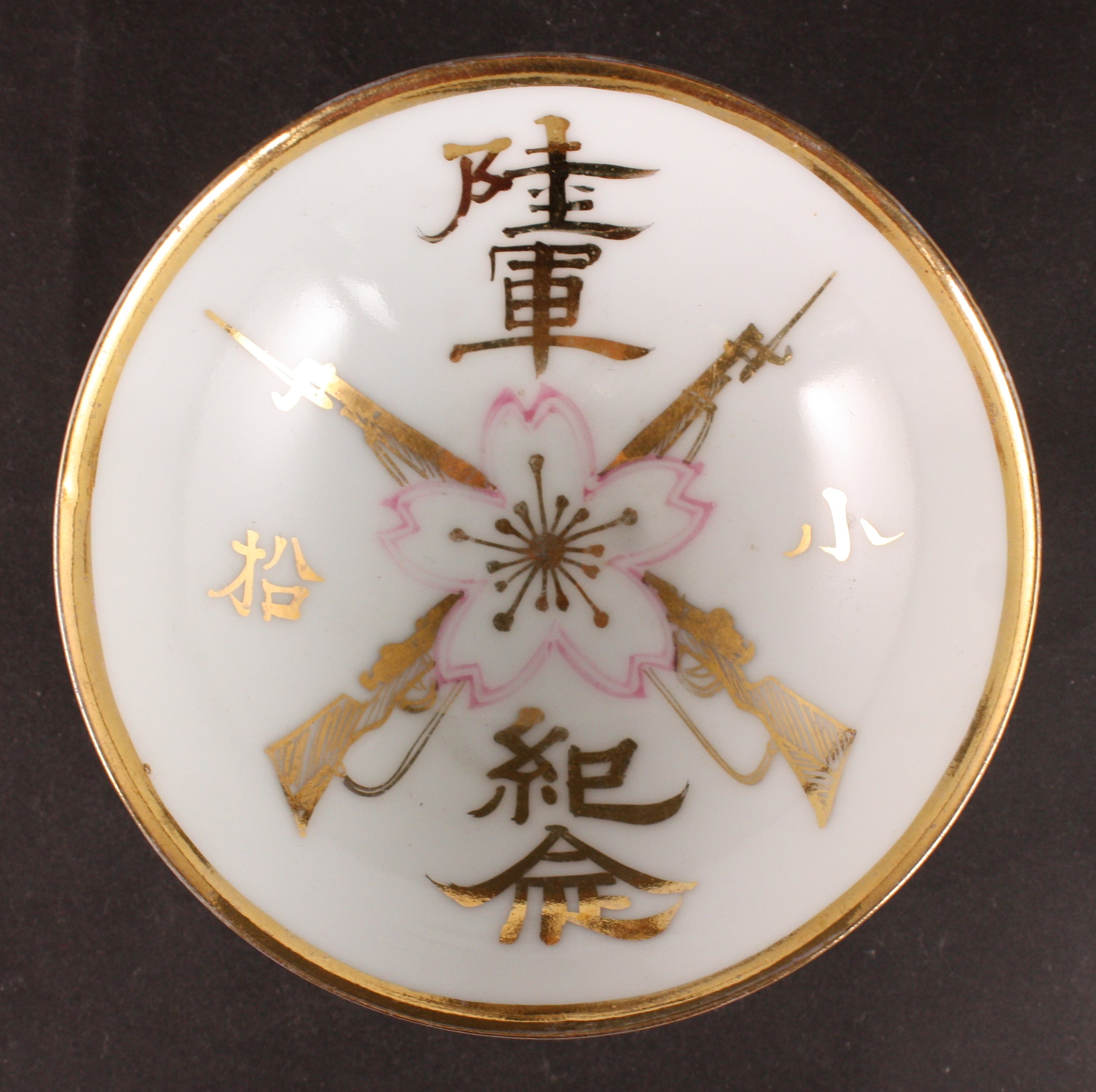 This is a set of 3 antique Japanese military sake cups, decorated each with a crossed pair of rifles, a cherry blossom in the center, and the words "Army Commemoration" and the soldier's name Komatsu. Cups with this design are usually for someone who received the marksmanship award, even though proportionally the cherry blossom here is a little small. The cups, however, are very large - I've included a 2" cup in one of the pictures for scale.