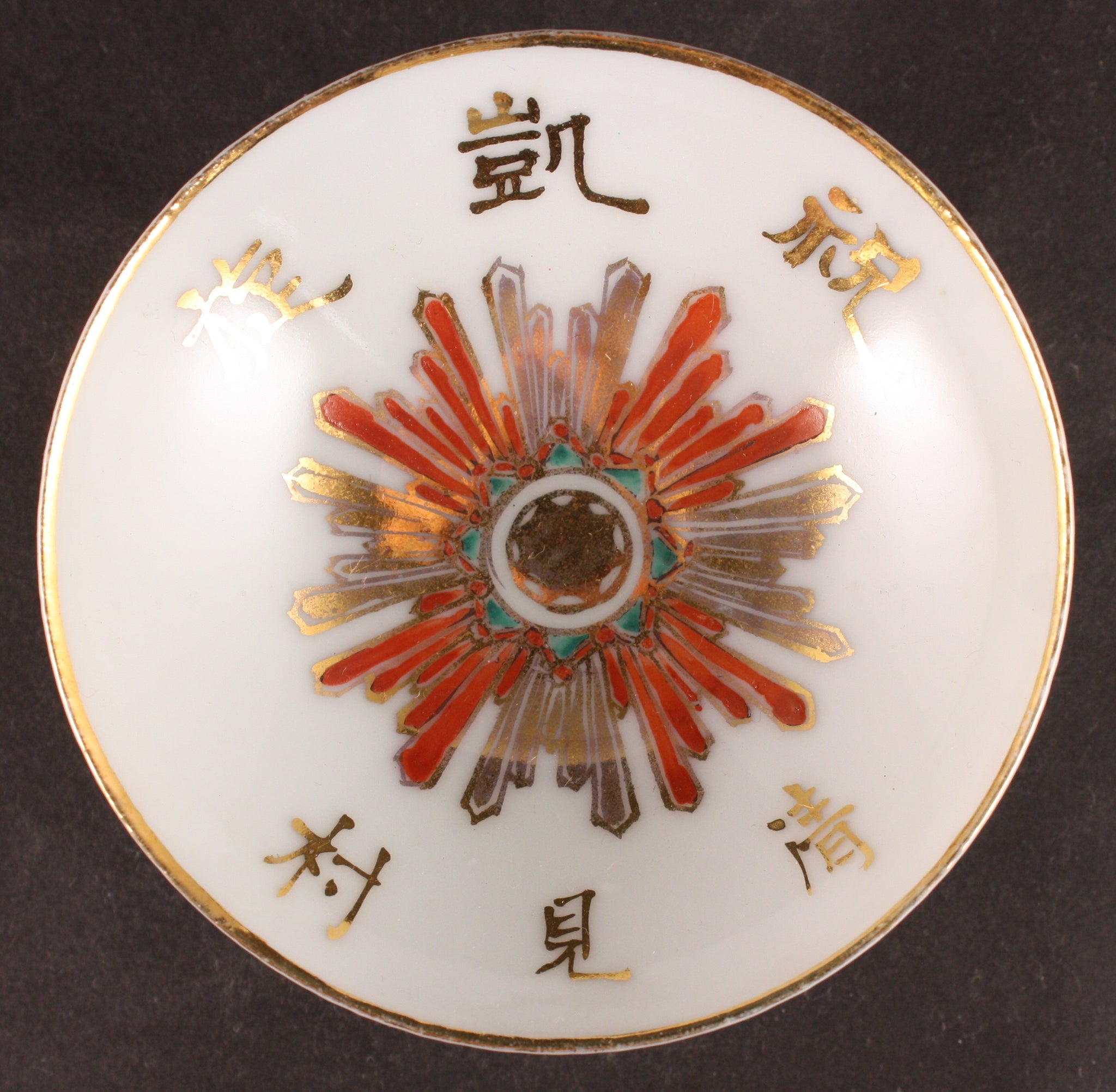 This is an antique Japanese military sake cup, decorated with a badge of the Order of Sacred Treasure, with the words "Congratulations Victorious Return" and "Kiyomi Village". This is probably for some returning soldiers.