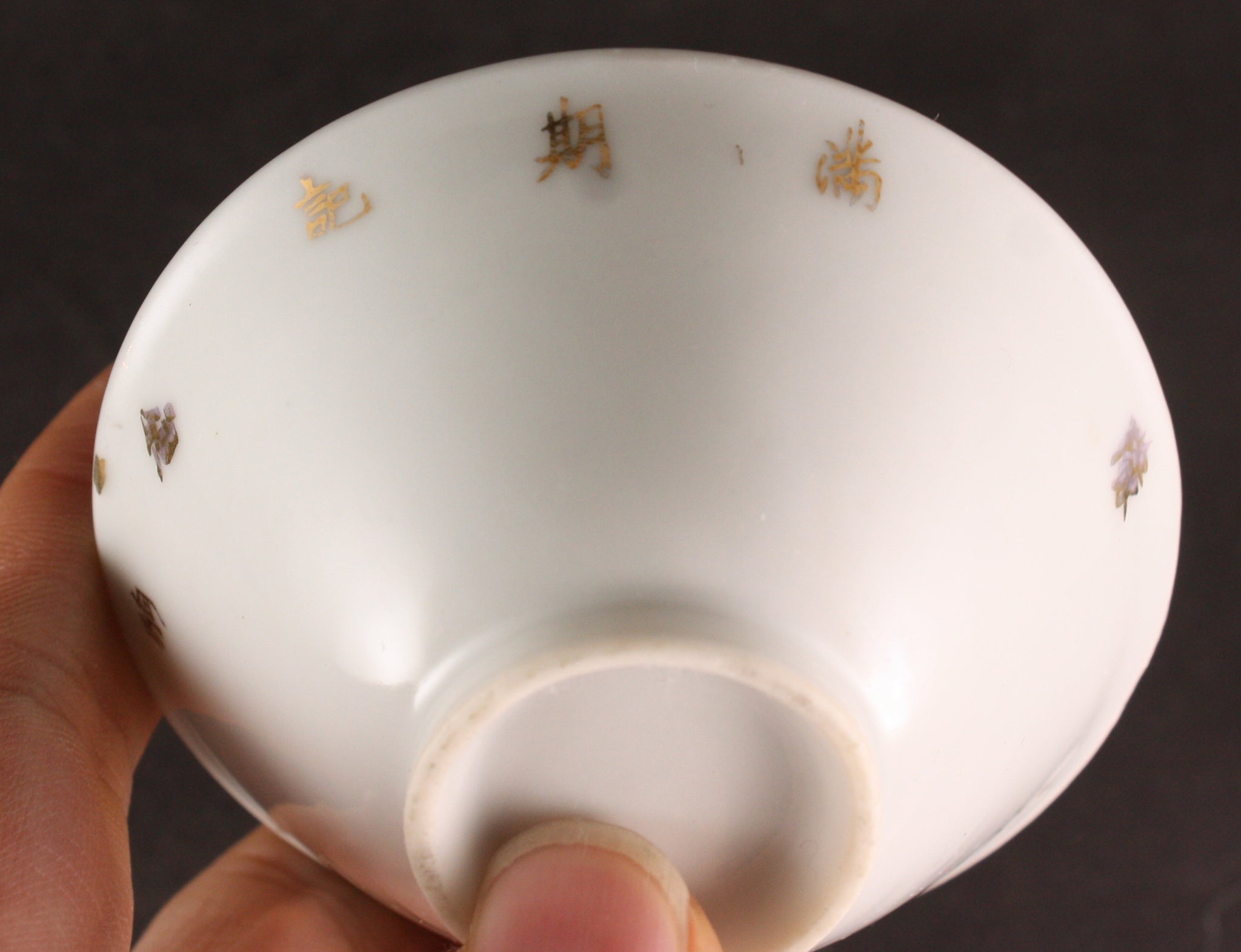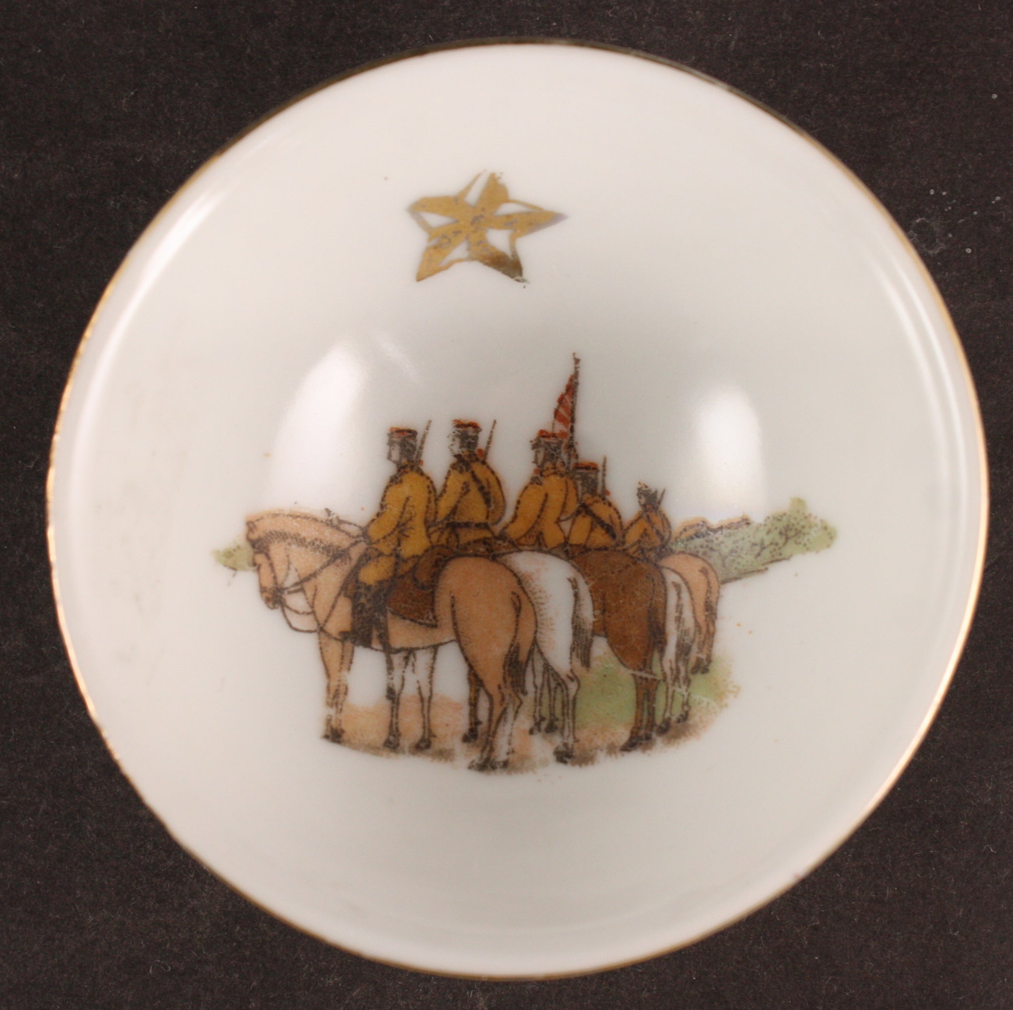 This is an antique Japanese military sake cup, decorated with a number of cavalry soldiers on their horses in some kind of formation. The words on the back are "Term Fulfillment Commemoration" "20th Cavalry Regiment".