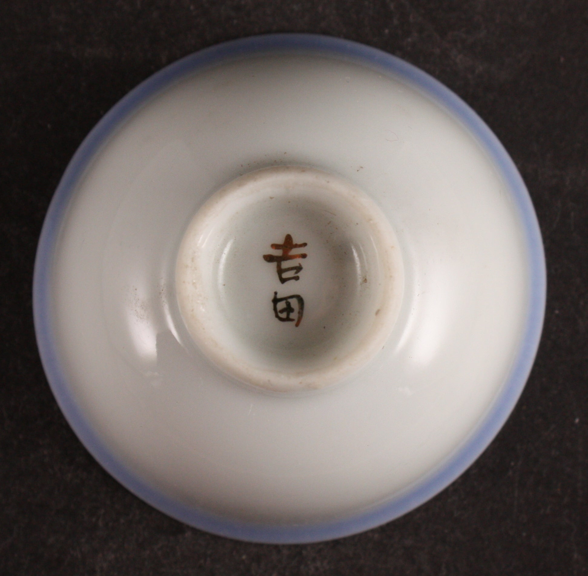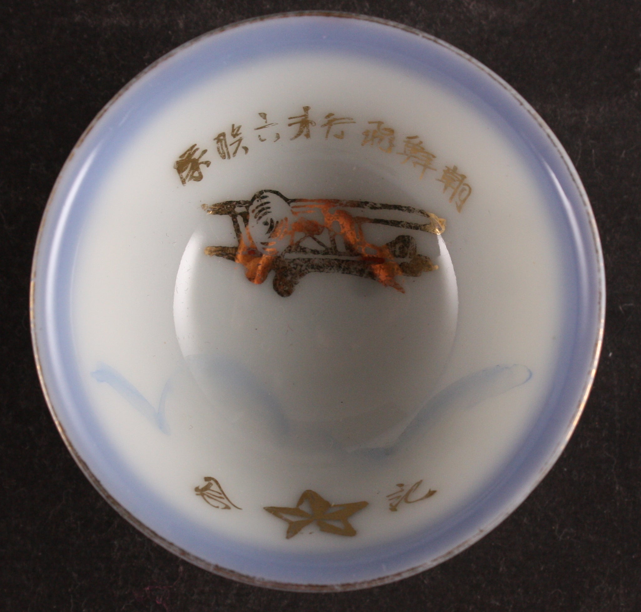 This is an antique Japanese military sake cup, decorated with a biplane flying over some clouds. The words are "Korea 6th Flying Regiment" "Commemoration". The soldier's name Yoshida is on the back.