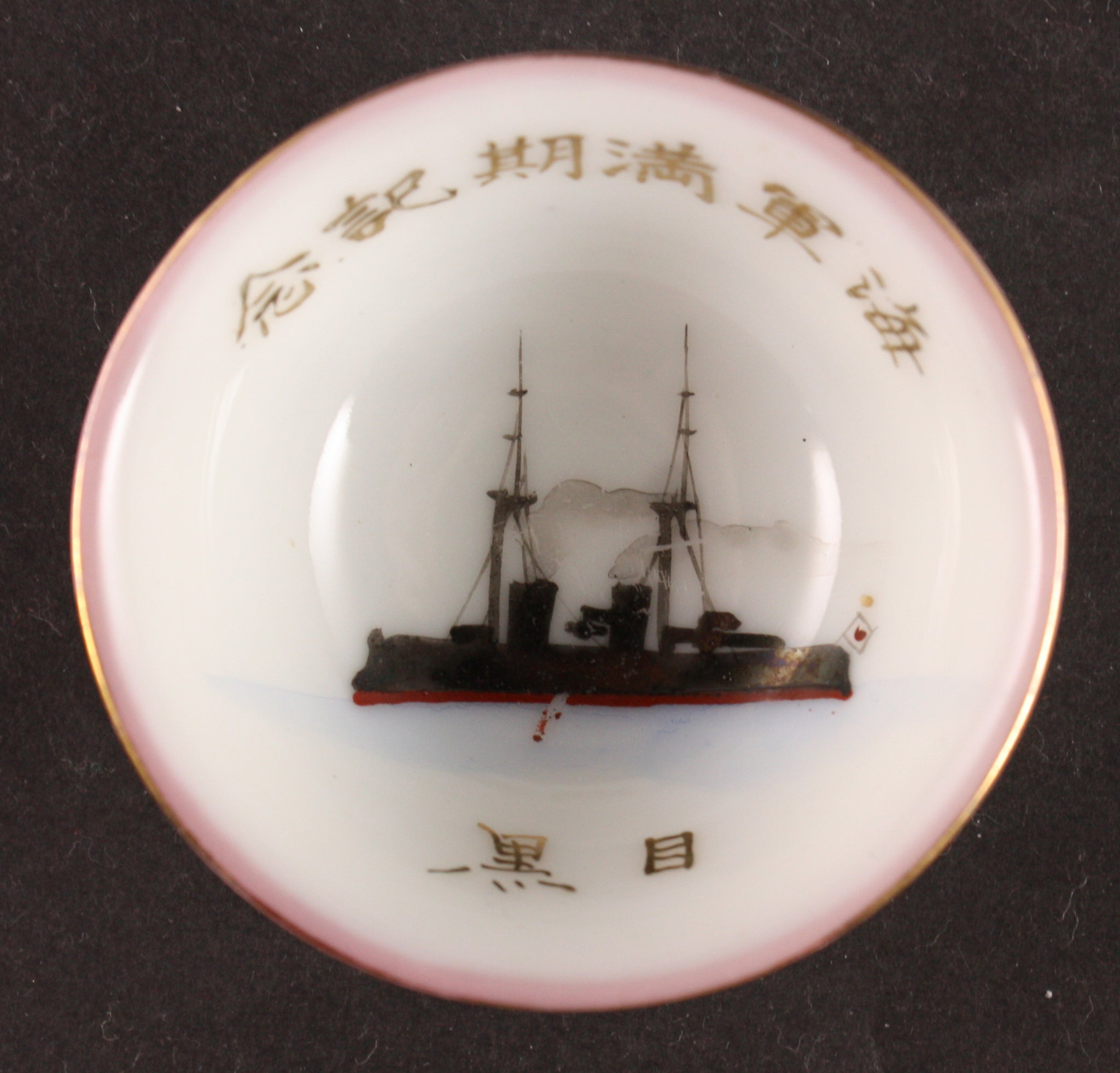 This is an antique Japanese military sake cup, decorated with a profile of what looks like a pre-dreadnought ship. The words are "Navy Term Fulfillment Commemoration" and the sailor's name Meguro.