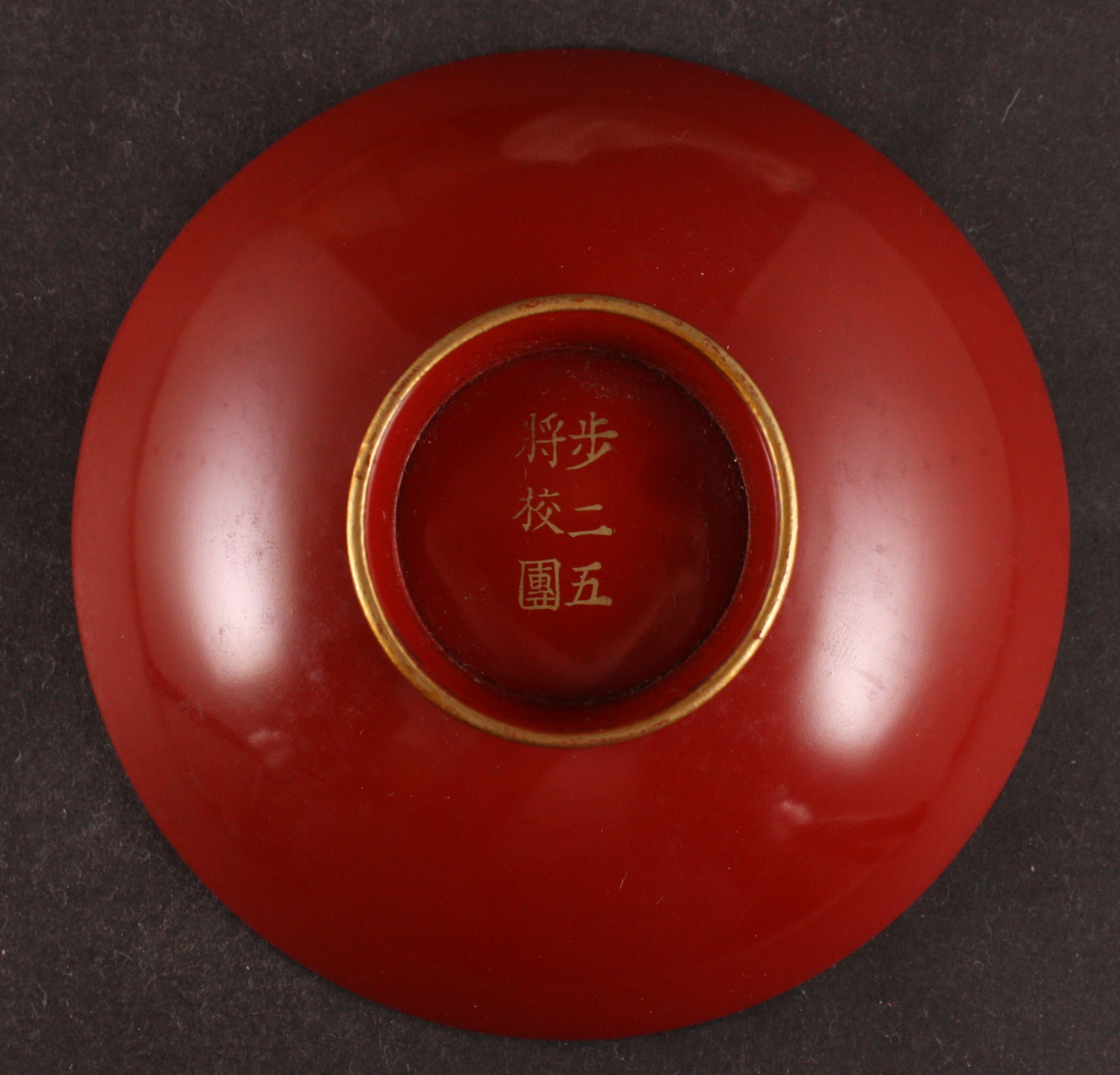 This is an antique Japanese military sake cup, decorated with a eagle on the front perched on a branch, looking menacingly at the NW - towards the area where Russia would be with the map on the background, which includes northern Japan, Sakhalin island, and the mainland coastline. There are some rays coming out from the bottom, suggesting the rising sun. The words on the back are "25th Infantry Officer Corps".