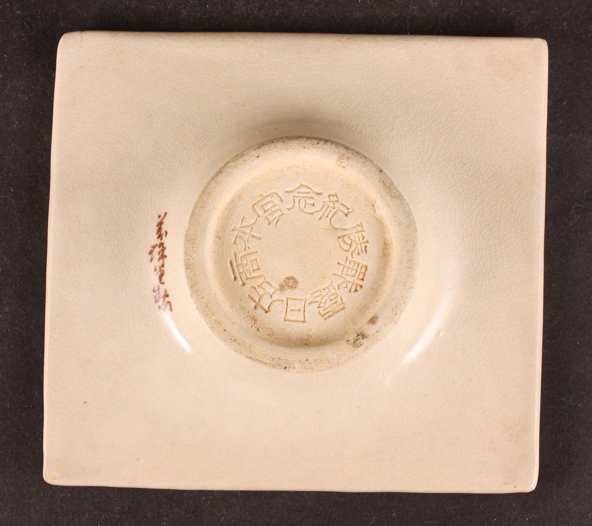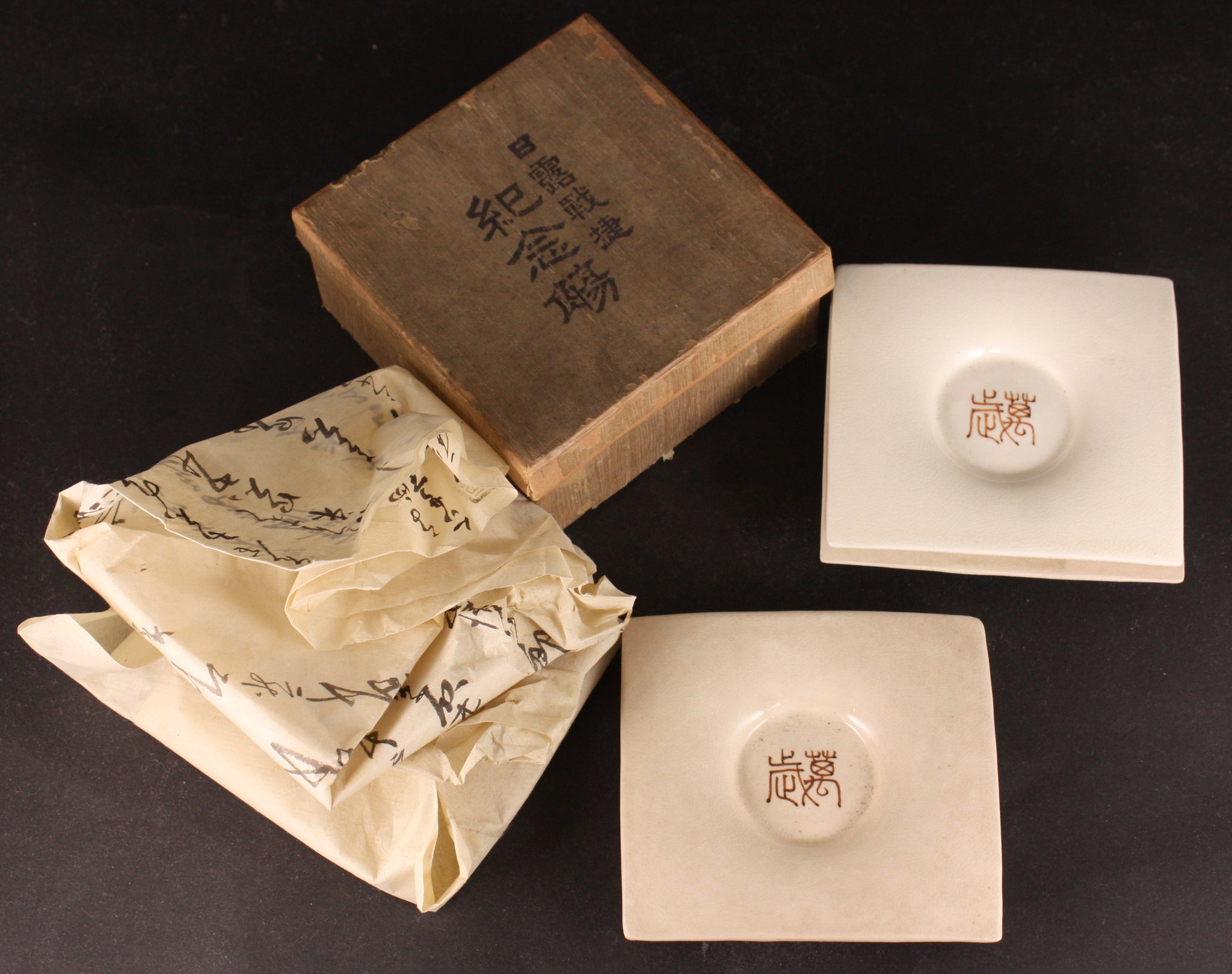 This is a set of 3 antique Japanese cup saucers, each have the word "Banzai" in the center. The words on the back are "Miyamoto Shop" "Russo Japanese War Victory Commemoration". The saucers are made of porcelain - a nice crackled glaze that will age a bit over time - as you can see one of them is lighter in color as it's probably been used less. It also comes with original cardboard box. Please note that I'm selling it as a set.