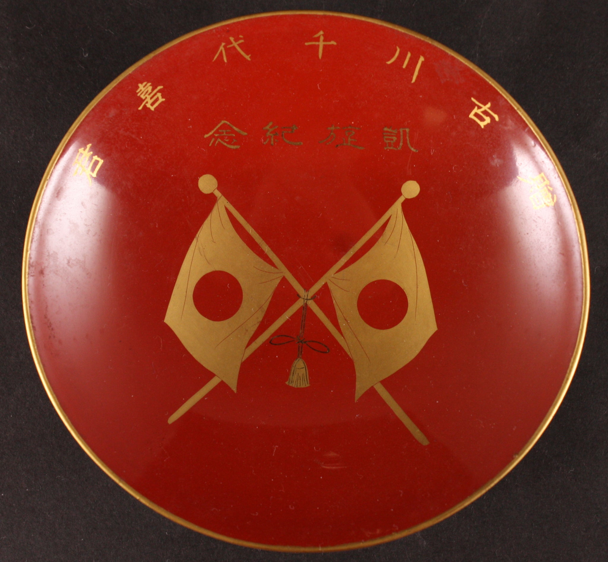 This is an antique Japanese military sake cup, decorated with a pair of flags and the words "Gift to Mr. Furukawa Chiyoki" "Victorious Return Commemoration". Thhe words on the back are "Meiji 39th Year May" "Hibachi Village Kanei District". This is for a returning soldier from the Russo Japanese War.