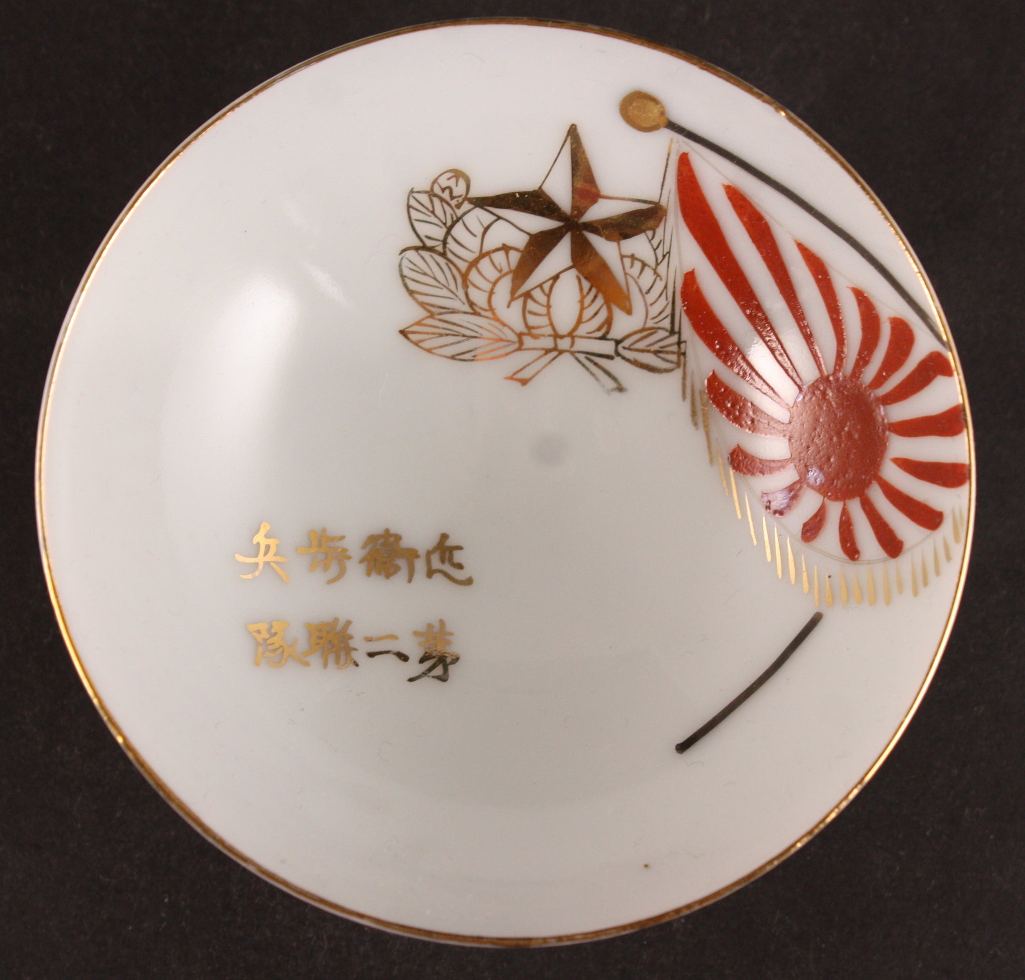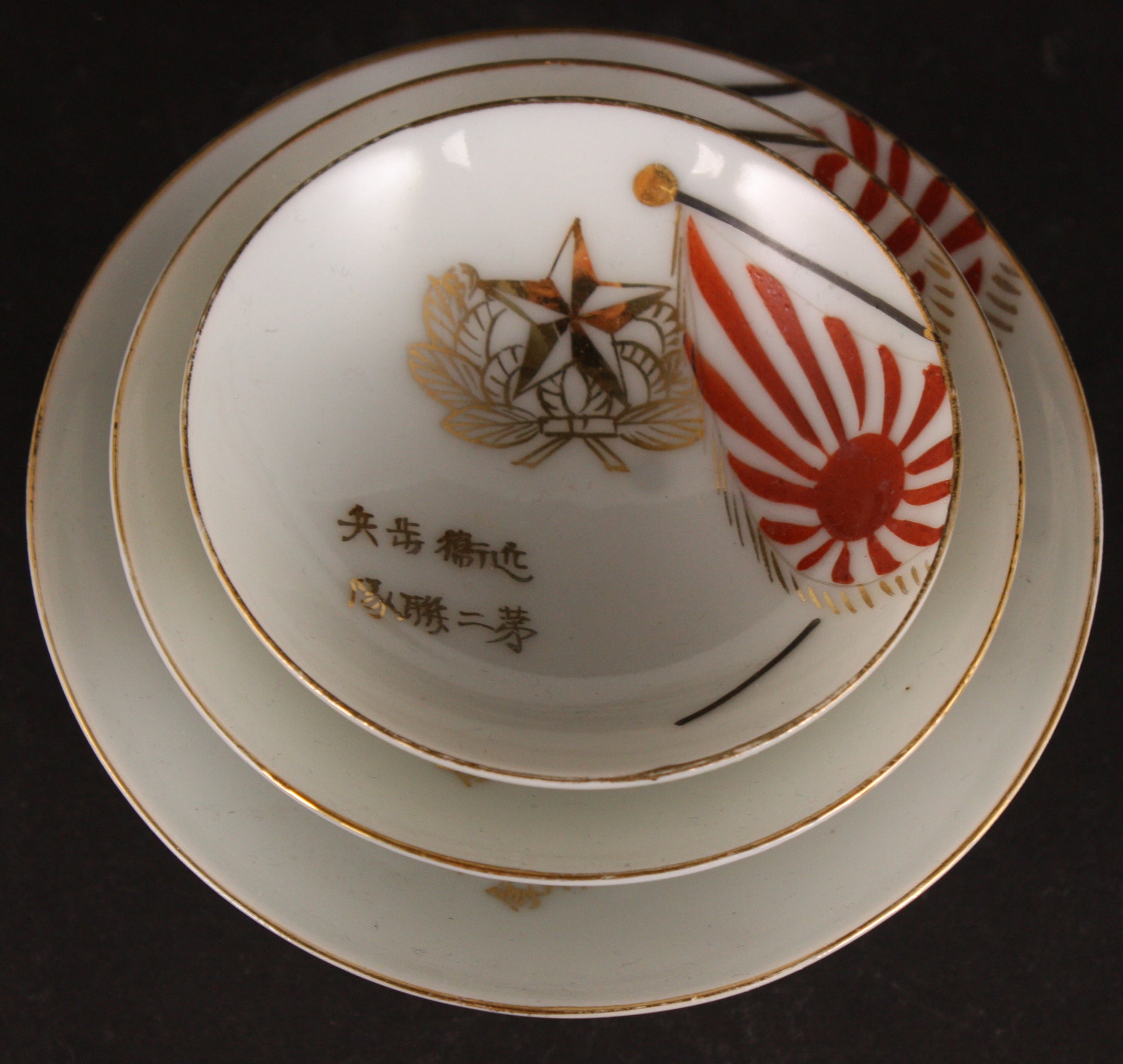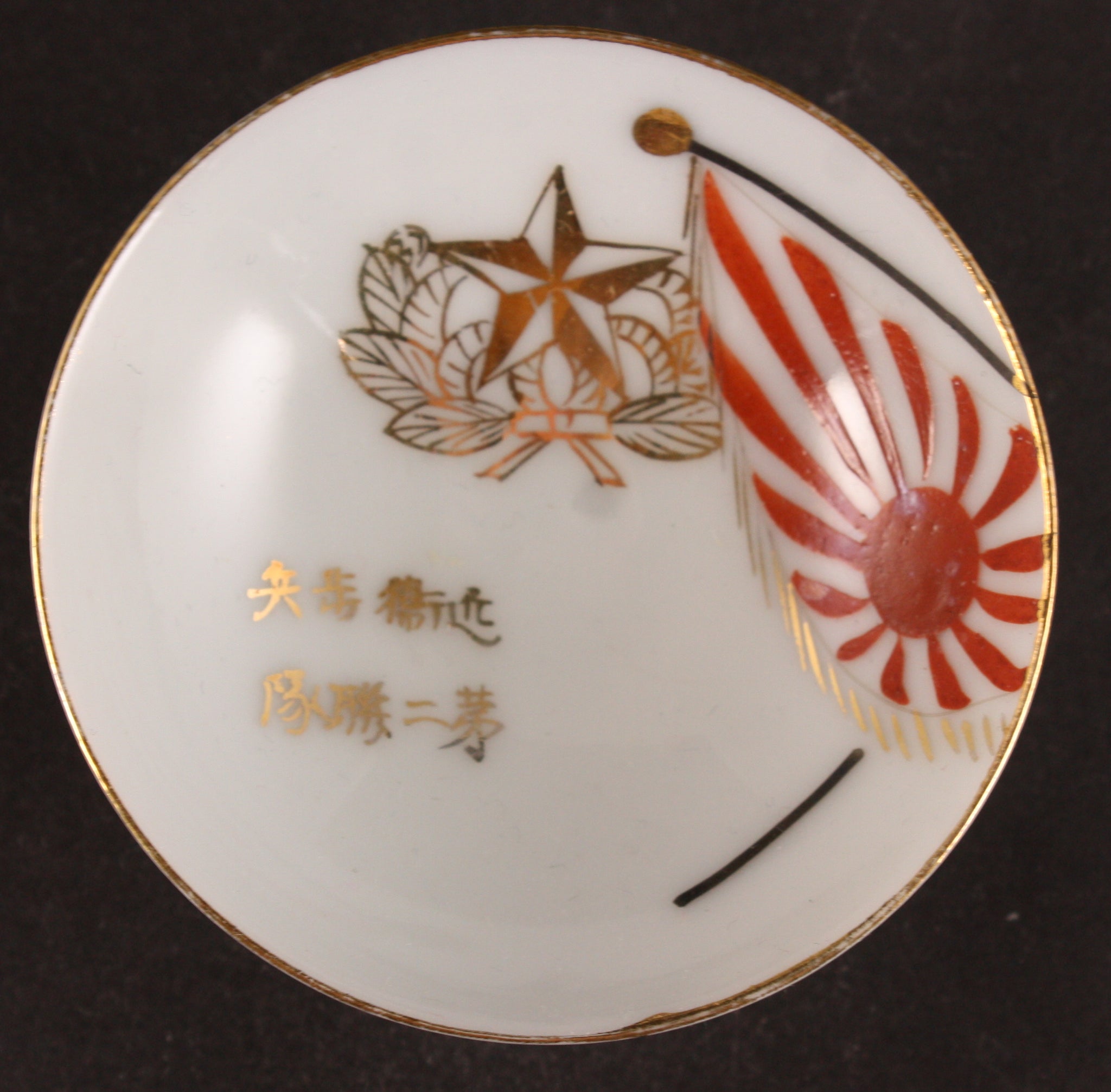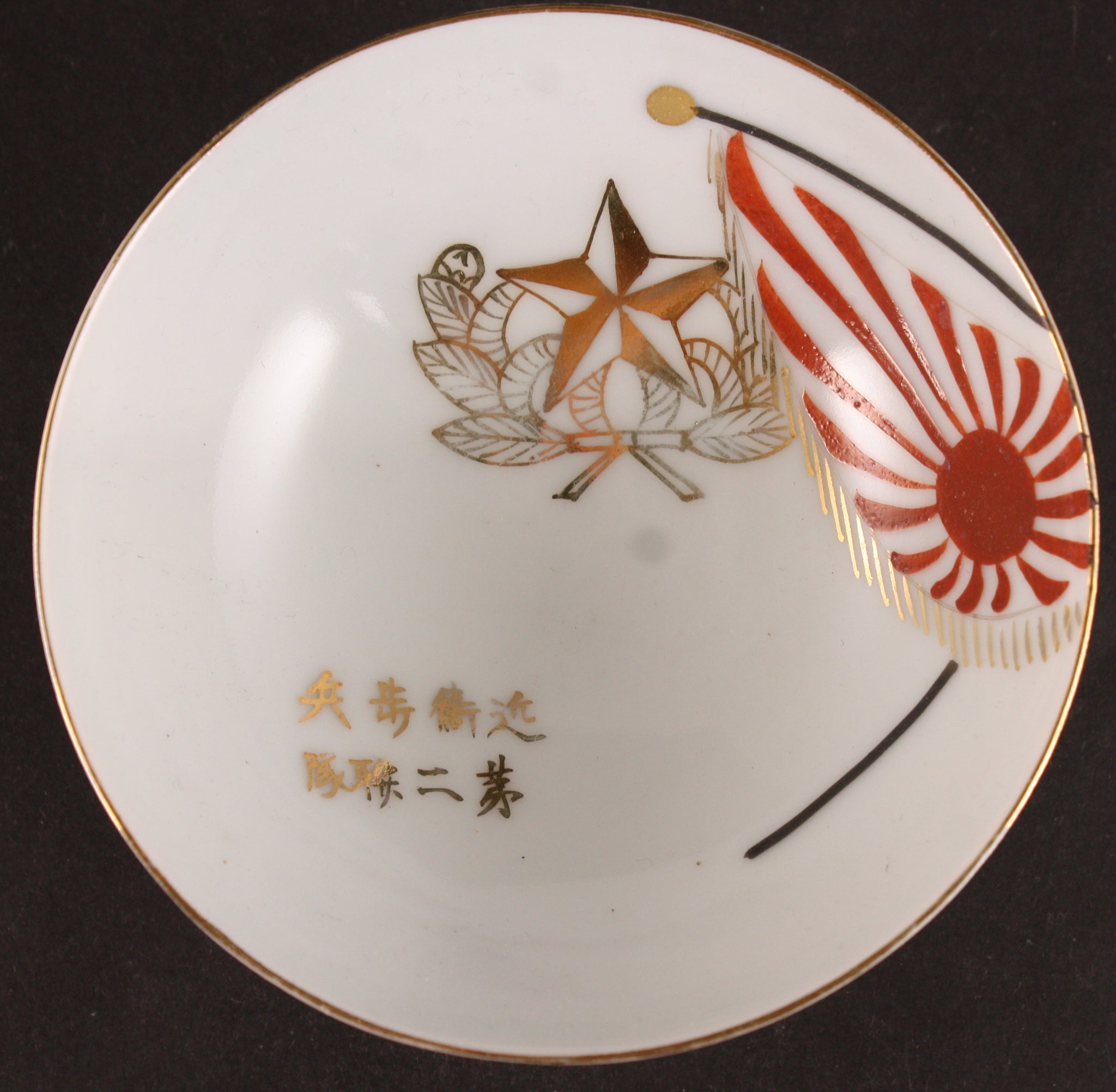This is an antique Japanese military sake cup set, decorated with a flag each with an insignia of the Imperial Guards, and the words "Imperial Guards 2nd Infantry Regiment". There's a soldier's name on the back but it's illegible.