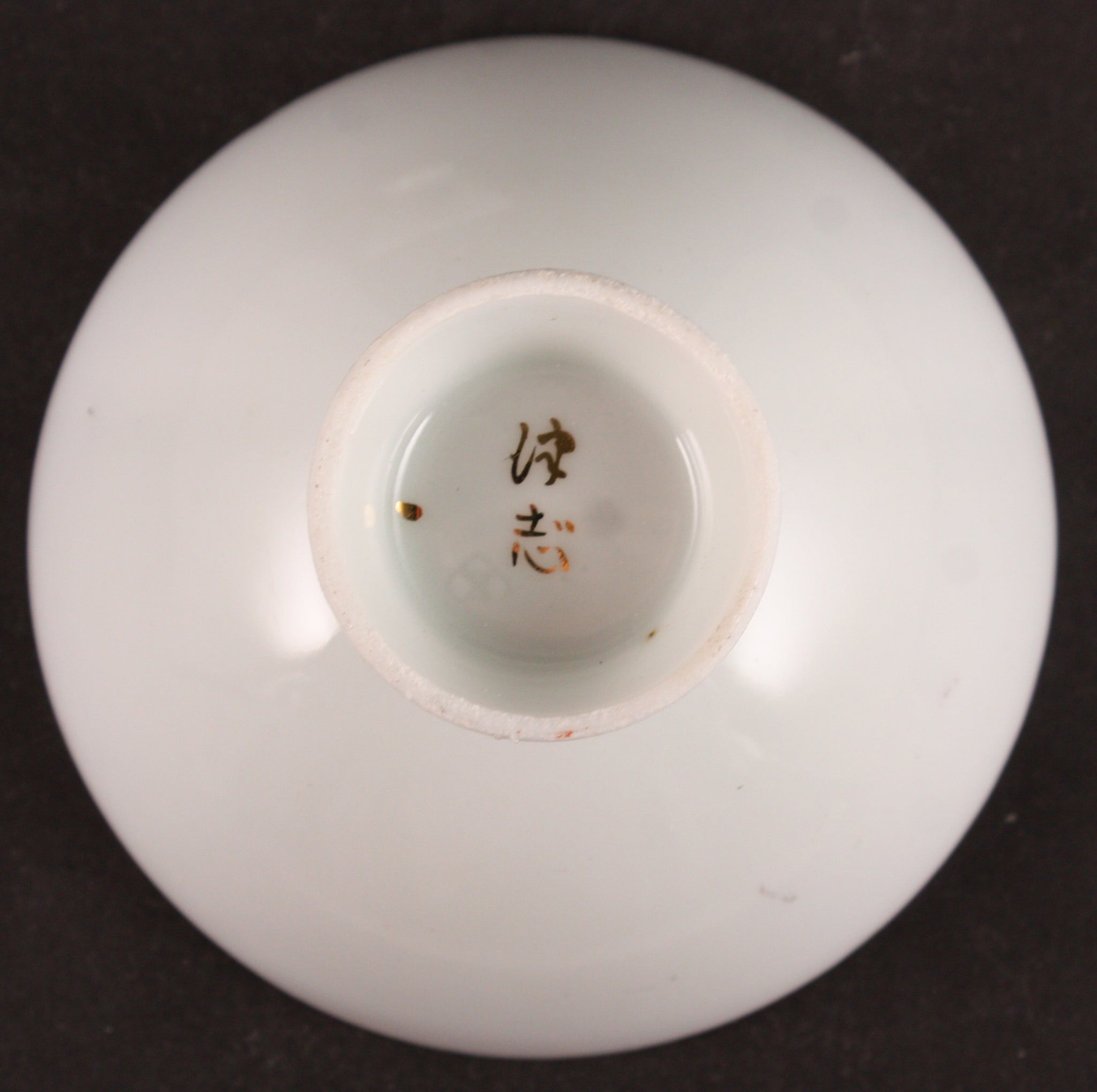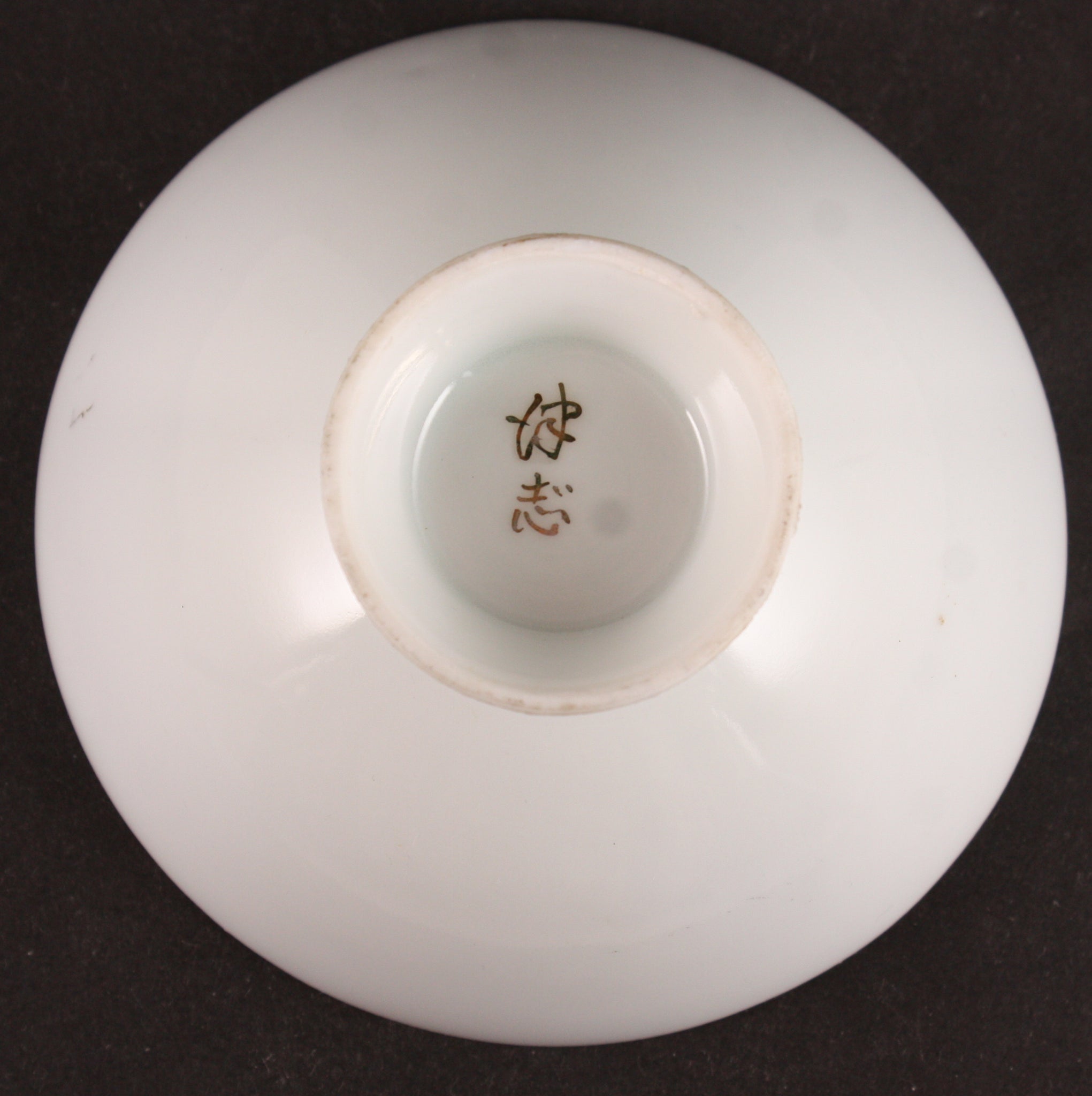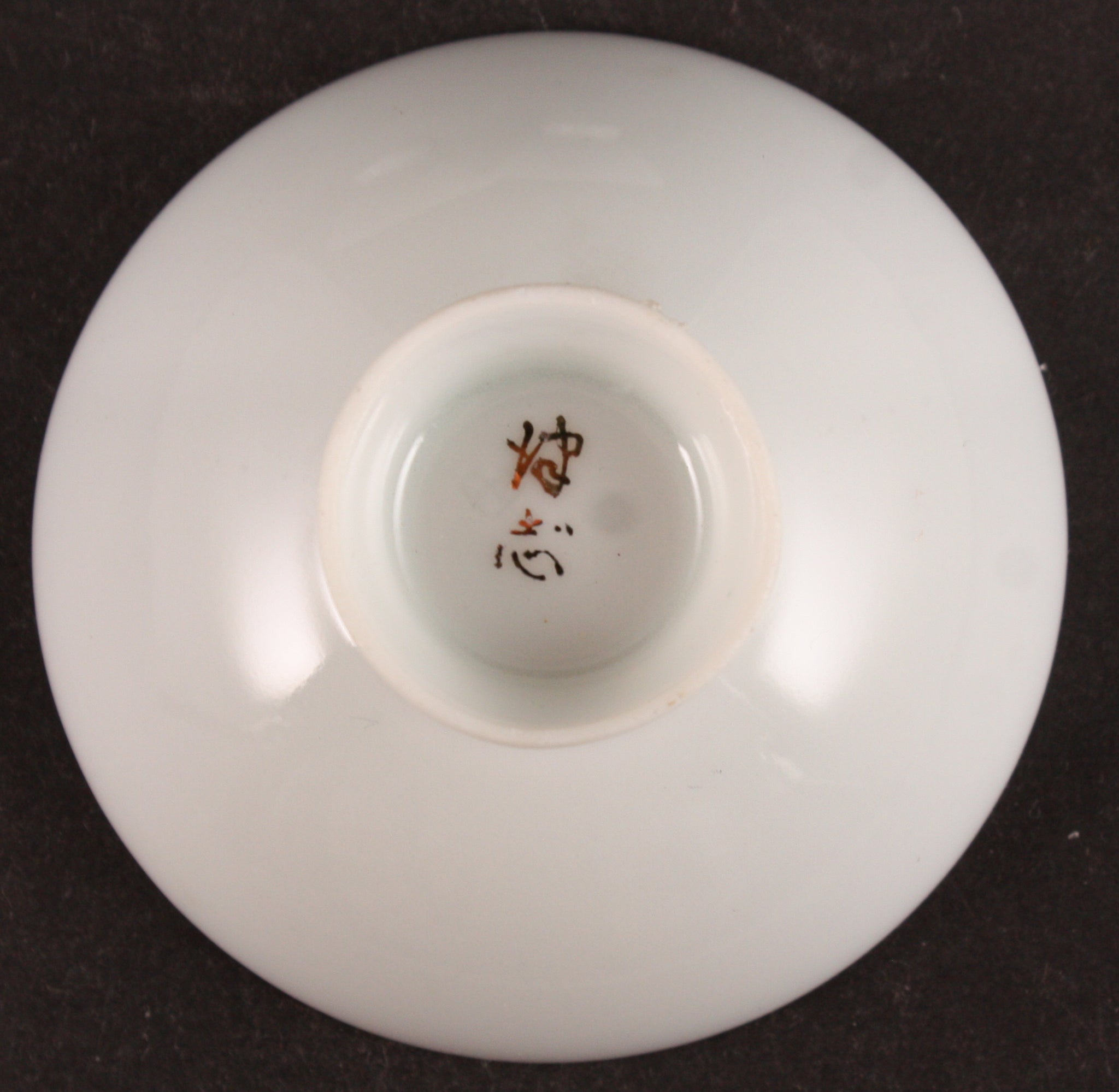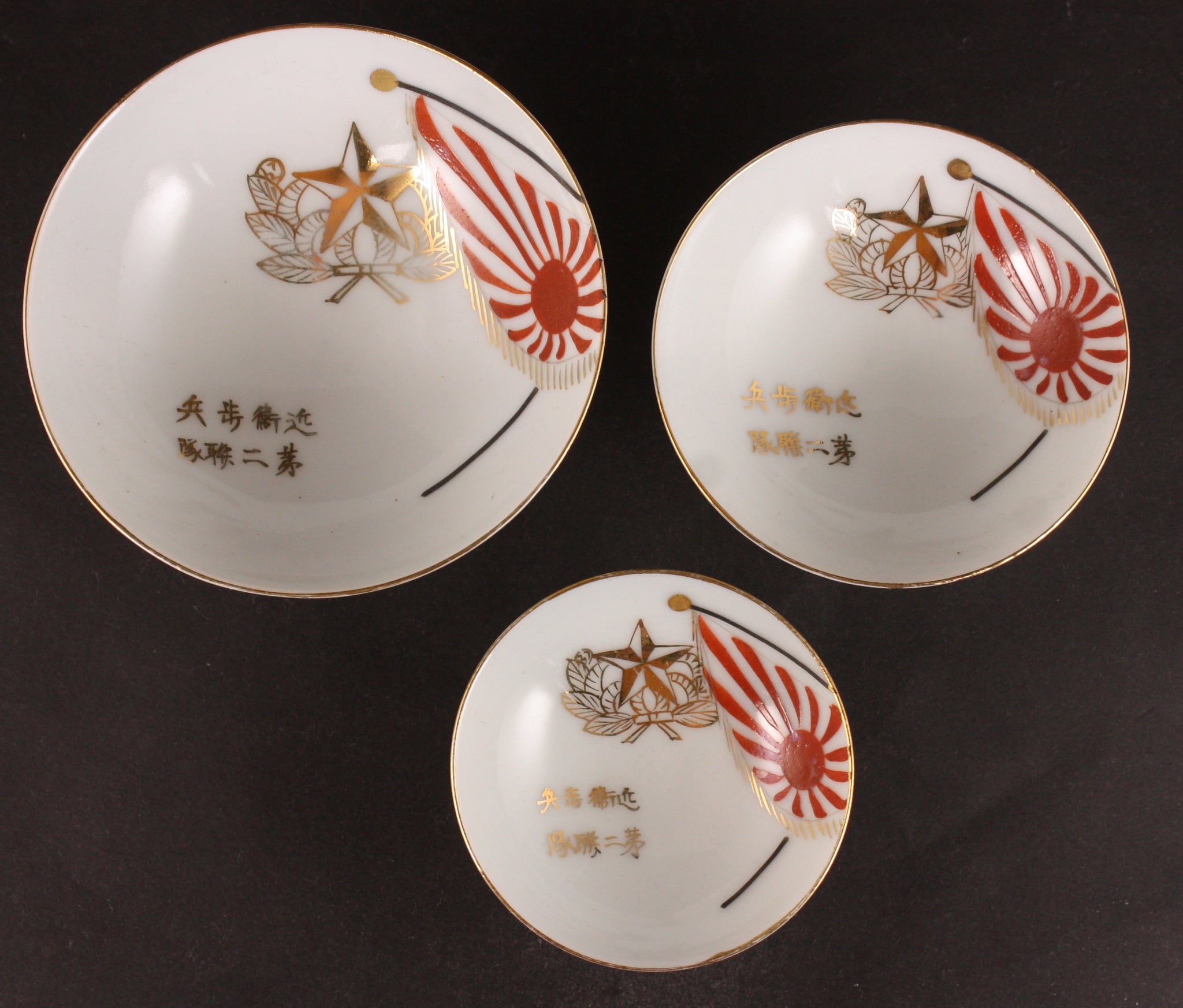 This is an antique Japanese military sake cup set, decorated with a flag each with an insignia of the Imperial Guards, and the words "Imperial Guards 2nd Infantry Regiment". There's a soldier's name on the back but it's illegible.