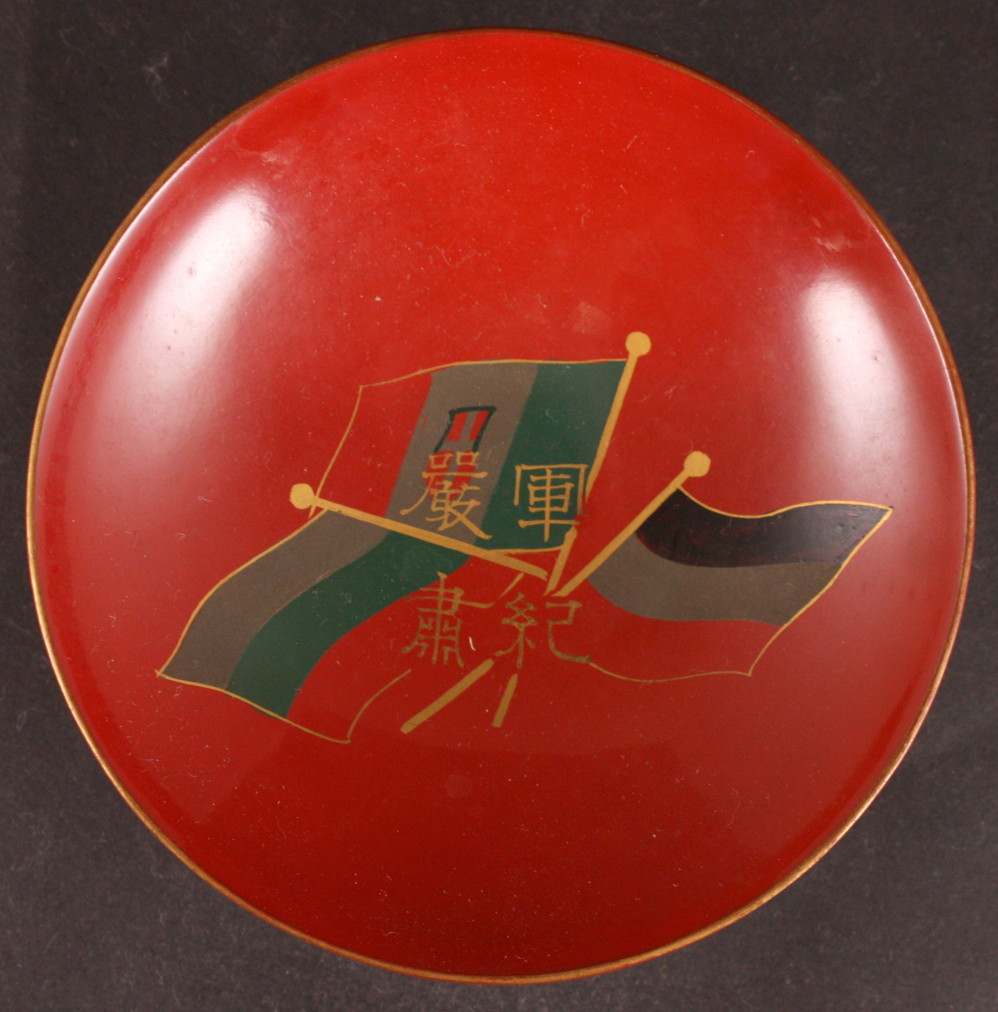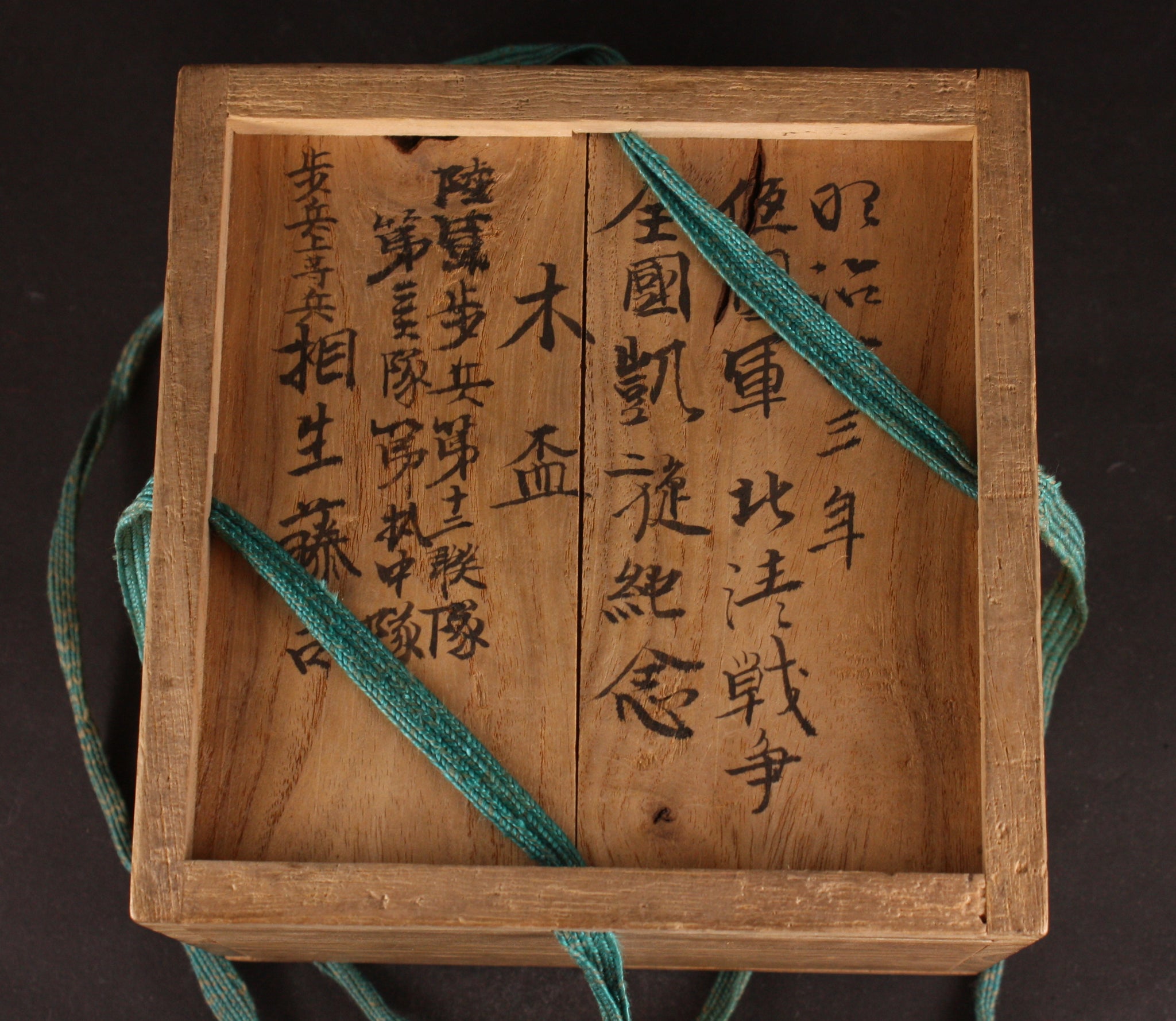 This is a pair of two military sake cups, with the smaller decorated with the flags of Germany, Russia, and Italy, and the bigger cup decorated with the flags of the USA, UK, Austria-Hungary, and France. The words on the smaller cups on the front are "Strict Army Discipline" and on the larger cup "Outstanding bravery in successive battles". The words on the back of each of the cups are "12th Infantry Regiment 3rd Battalion" and "Meiji 33rd Year North Qing Temporary Expedition Commemoration". The words on the bottom of the original wooden box say "Meiji 33rd Year United Nations Army Northern Qing War" "National Celebration of Victory Wooden Cups" "12th Infantry Regiment 3rd Battalion" and "Army Private 1st Class Aioi Fujiyoshi."