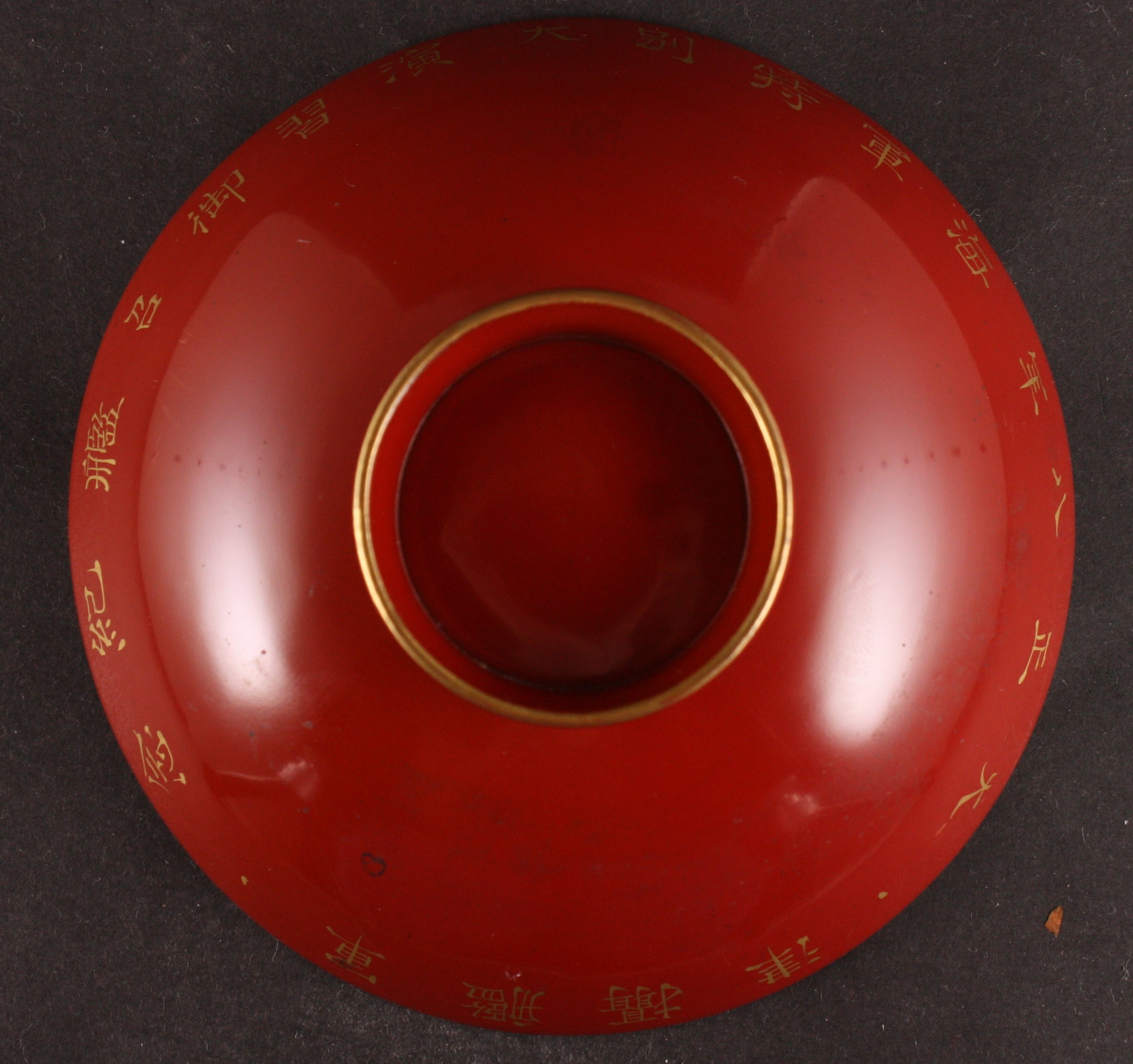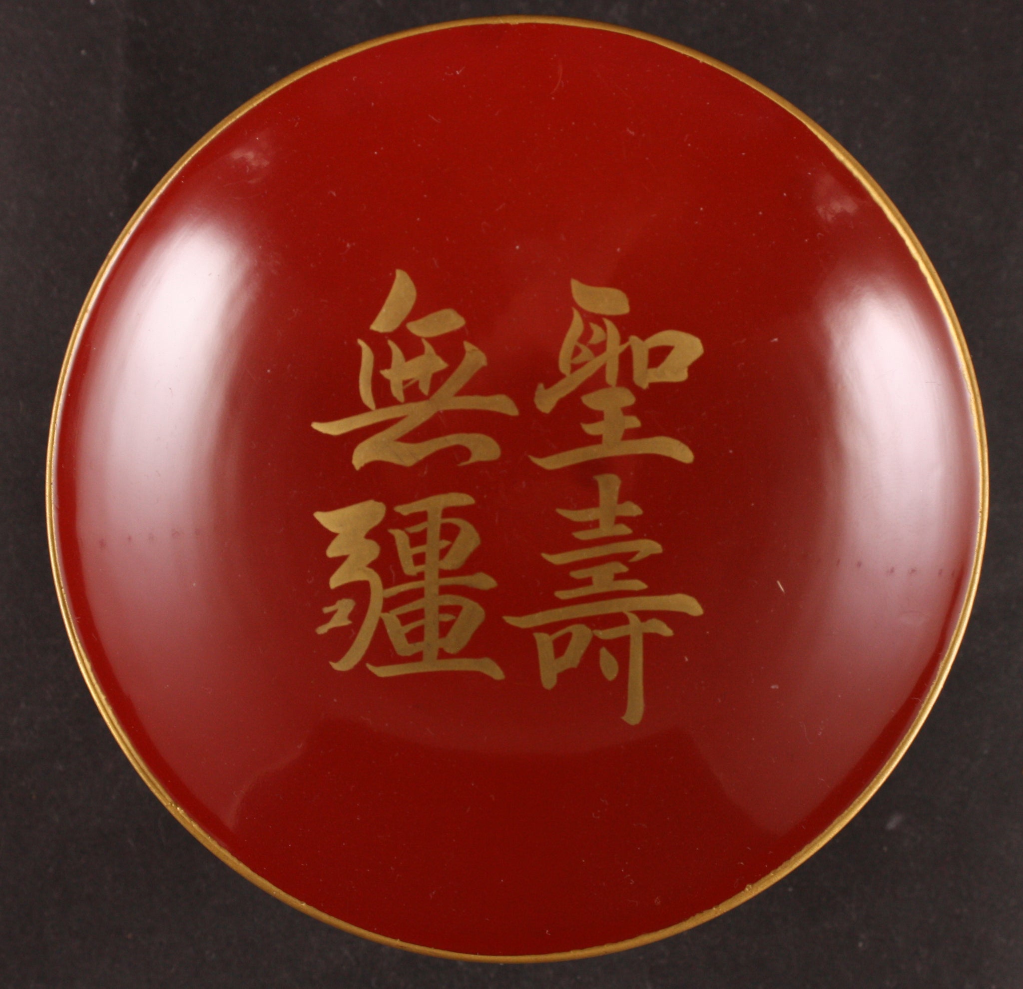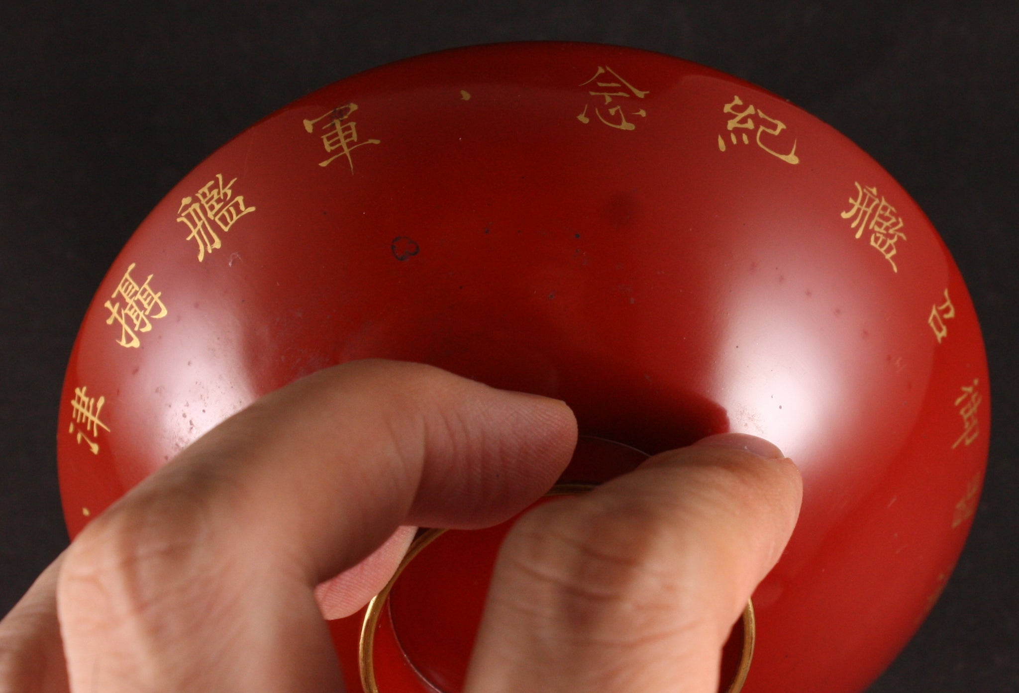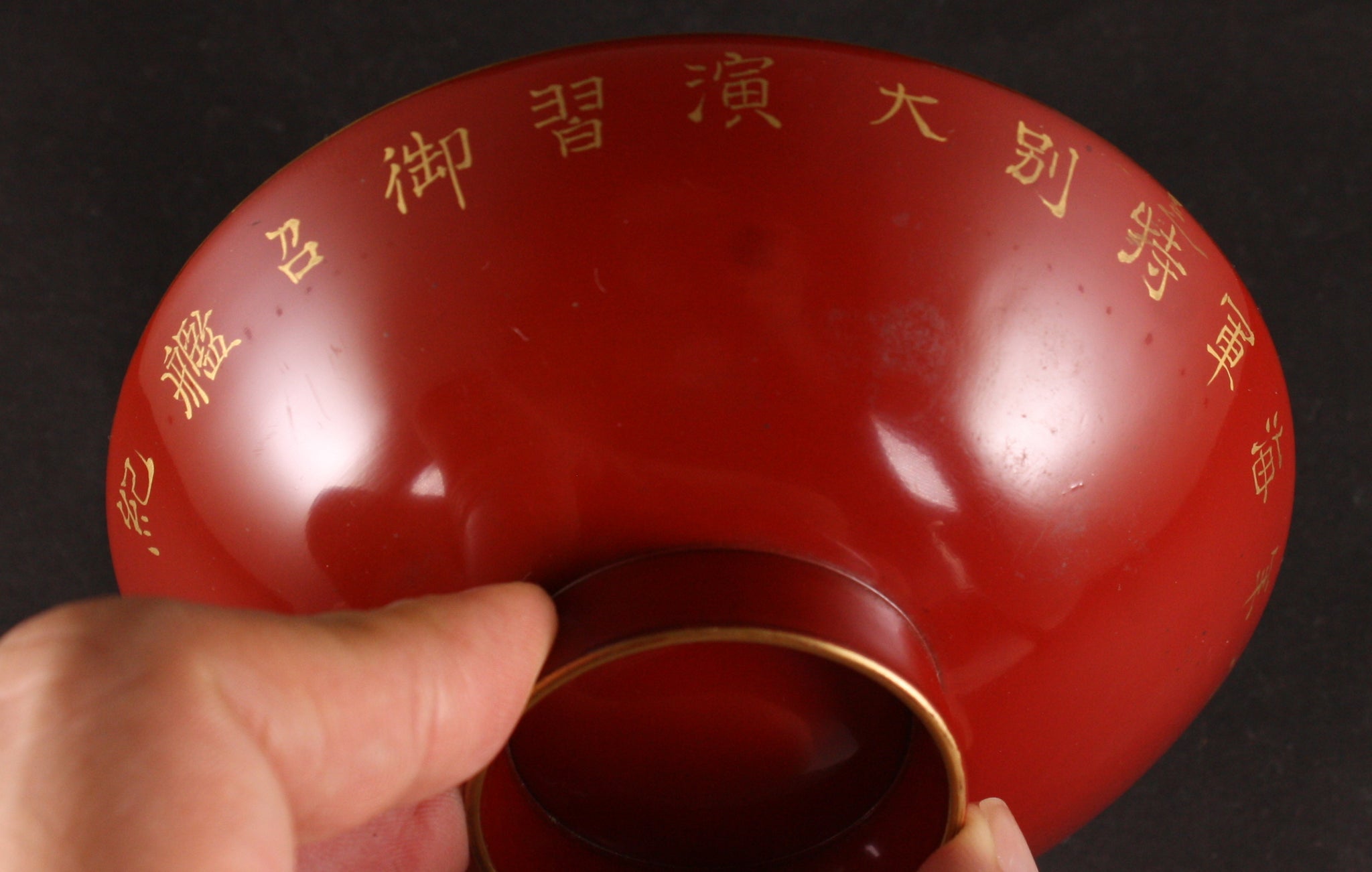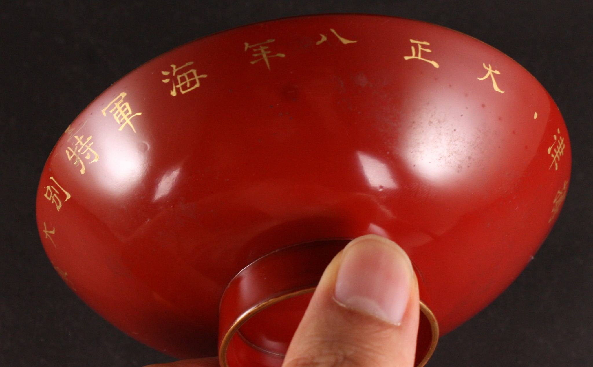 This is an antique Japanese military sake cup, decorated with the four words "Imperial Longevity Has No Bounds". This is basically a reference to the emperor's birthday. The words on the back are "Taisho 8th Year (1919) Navy Special Exercises Imperial Vessel Commemoration" "Warship Settsu". This refers to Settsu serving as the main imperial vessel where the emperor sat and reviewed the fleet. It was a great honor for a ship to serve as these imperial vessels, and the cups are quite rare.