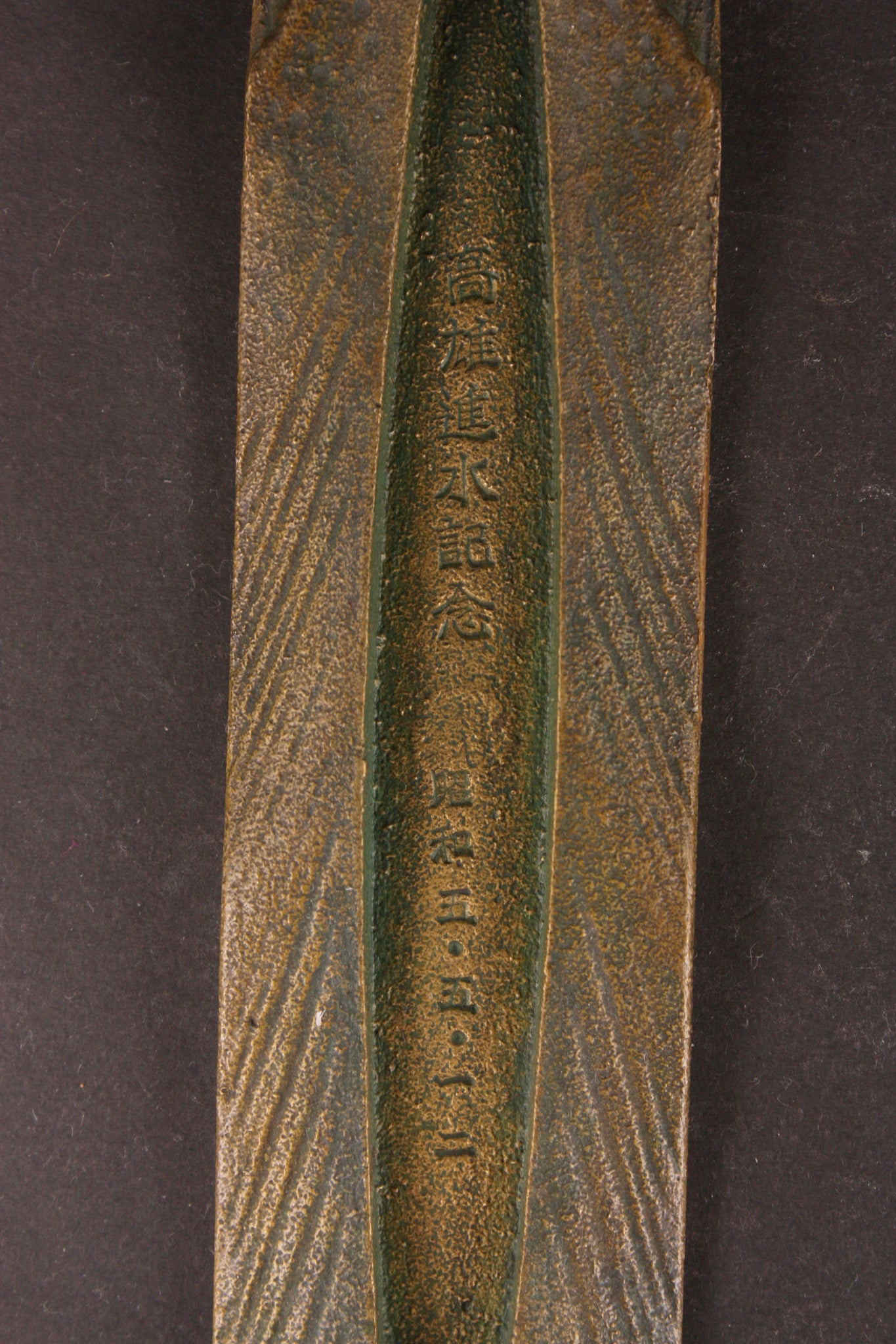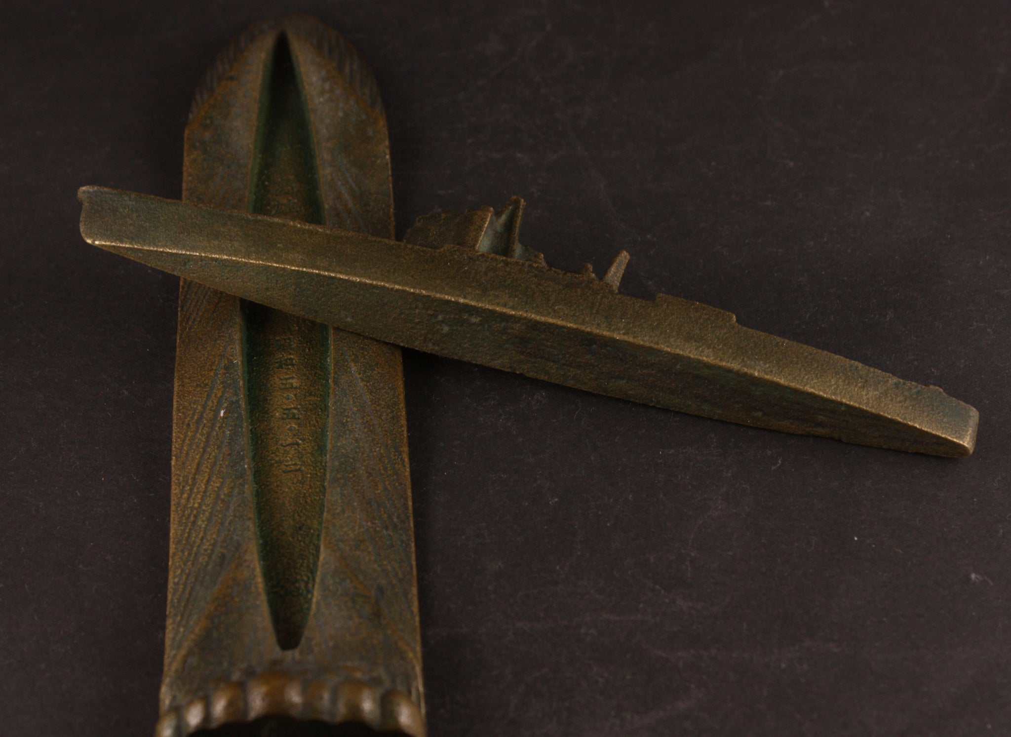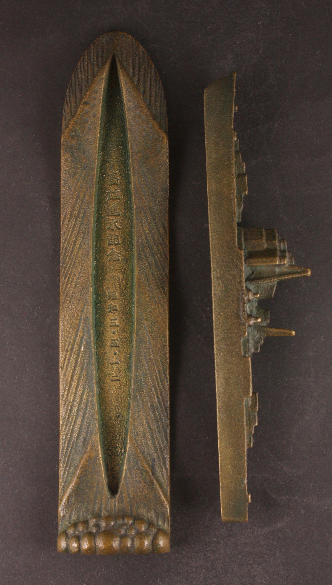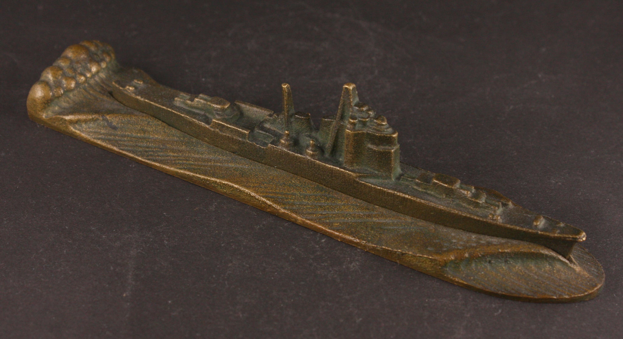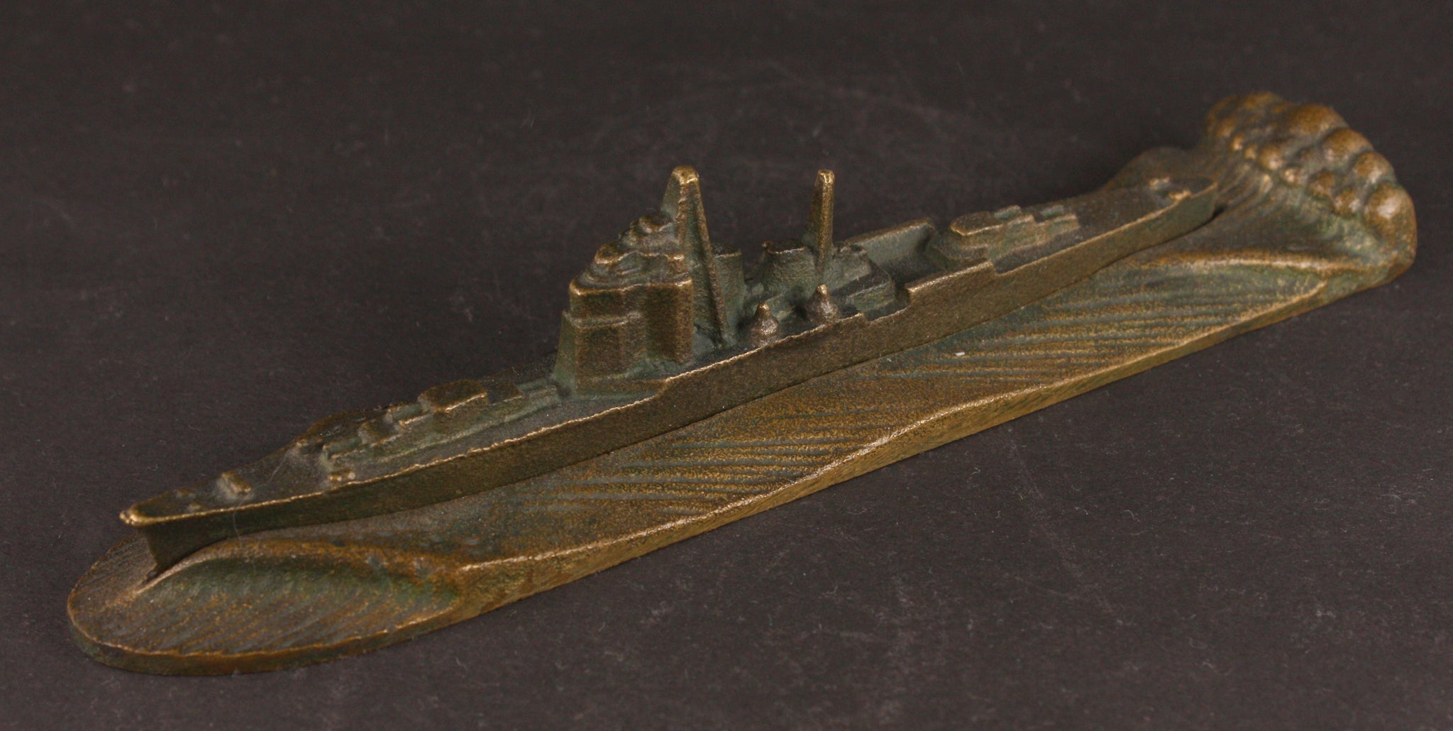 This is an antique Japanese military paper weight, made of what seems to be bronze and in the shape of a cruiser sailing through the seas. The item is made of two parts - the ship is detachable. On the base the words are "Takao Launch Commemoration" "Showa 5th Year (1930) May 12th". There's also a mark "M" underneath the base. Anything launch related is very rare - as it only ever happens once for every ship. The Takao, of course, was one of the most modern IJN cruisers to see service, and was the backbone of the Japanese cruiser fleet during WW2.
