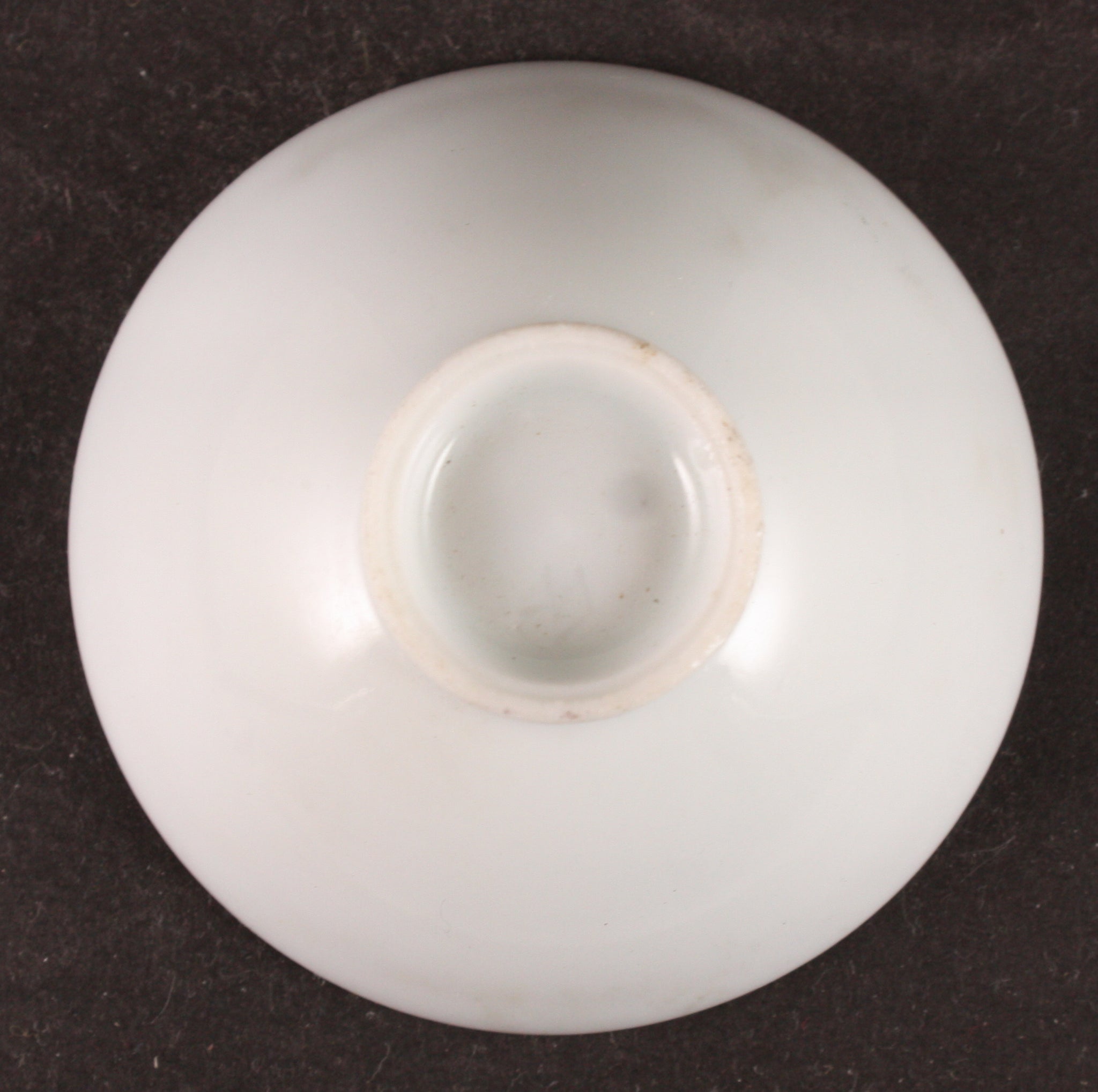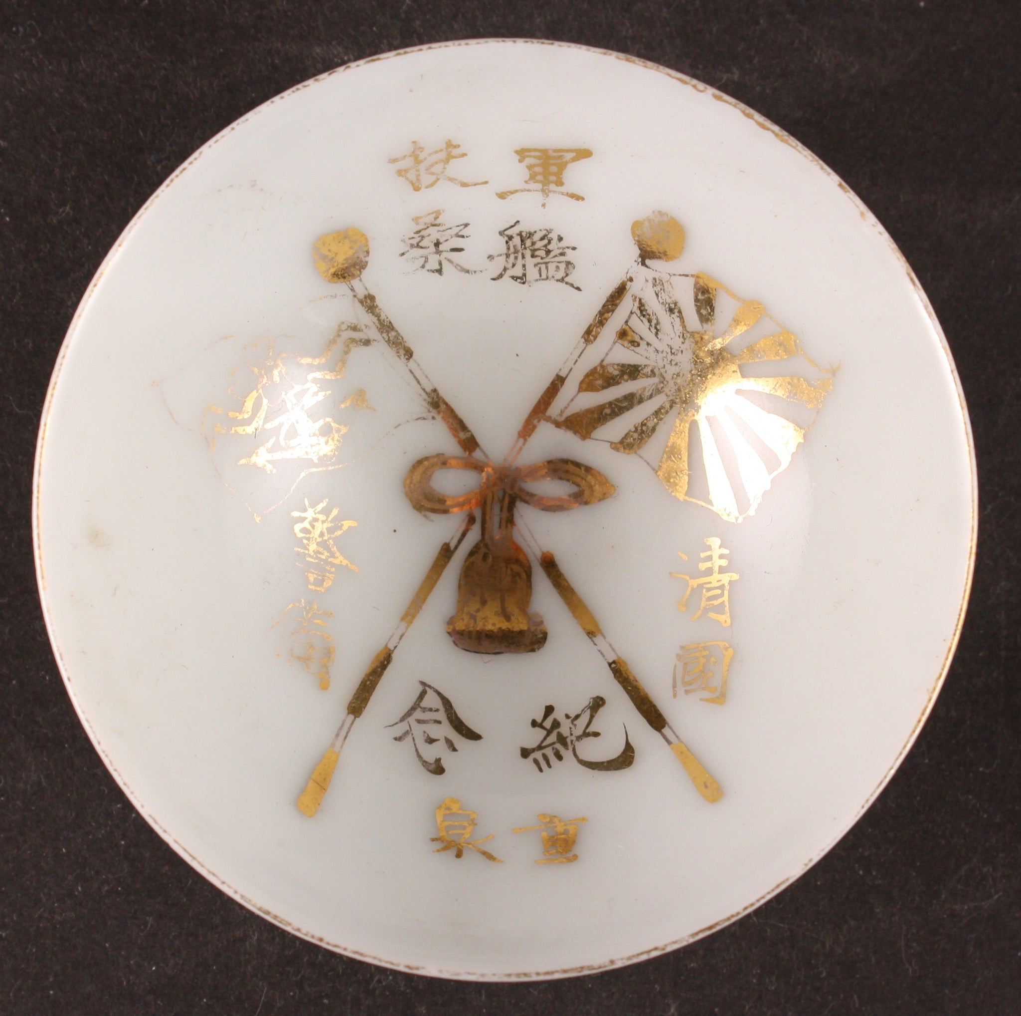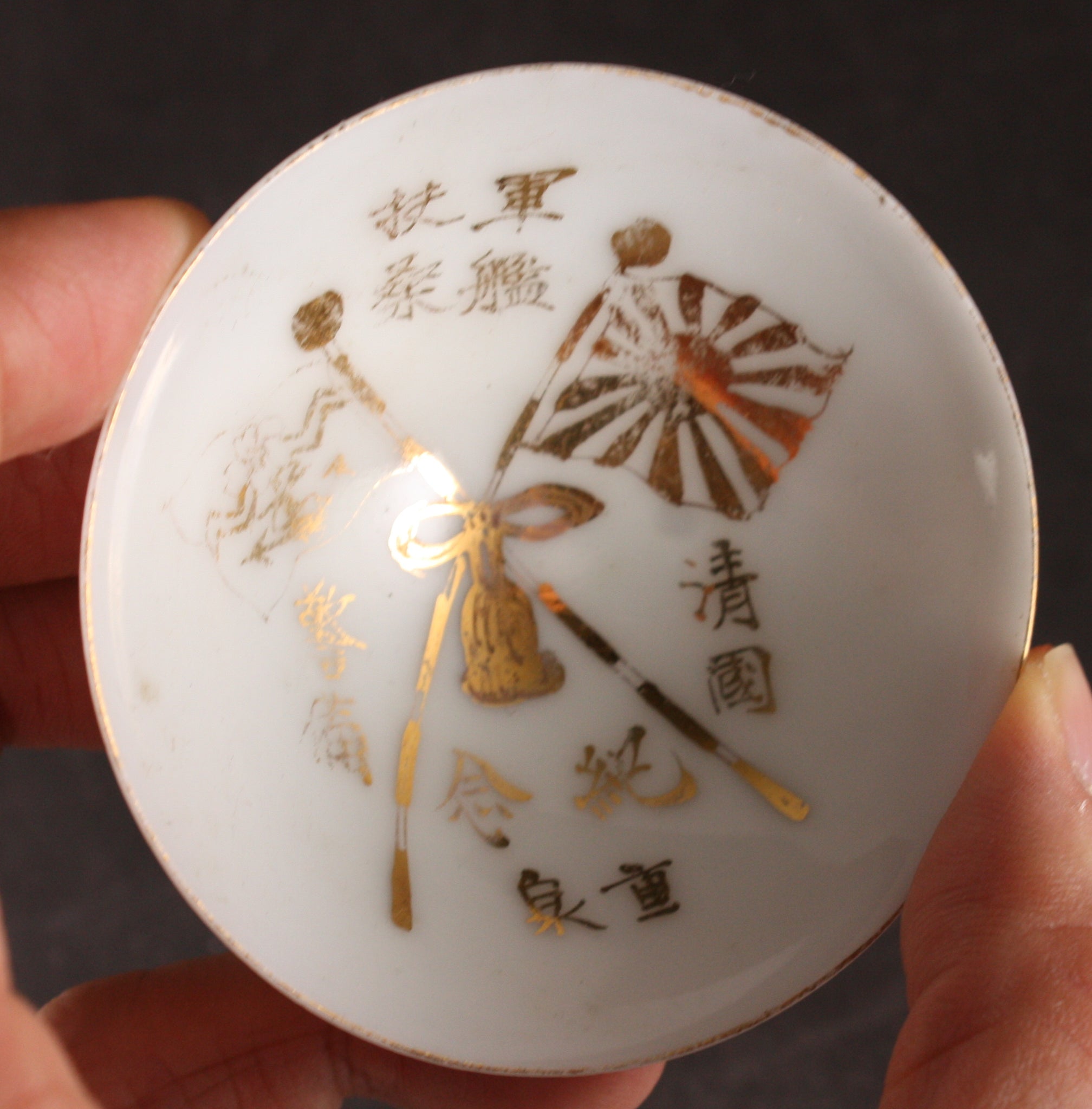 This is an antique Japanese military sake cup, decorated with a pair of flags and the words "Warship Fuso Qing Patrol Commemoration" and the sailor's name Shigeizumi. The ship named here is the Ironclad Fuso - one of Japan's first western style warship that was capable of fighting other navies, ordered in the 1870s and used during the Sino Japanese war of 1895. The reference to "Qing" in the cup means this cannot be the later Fuso of WW2 fame. It's a rare piece of Japanese naval history as cups for ships this early is quite rare.