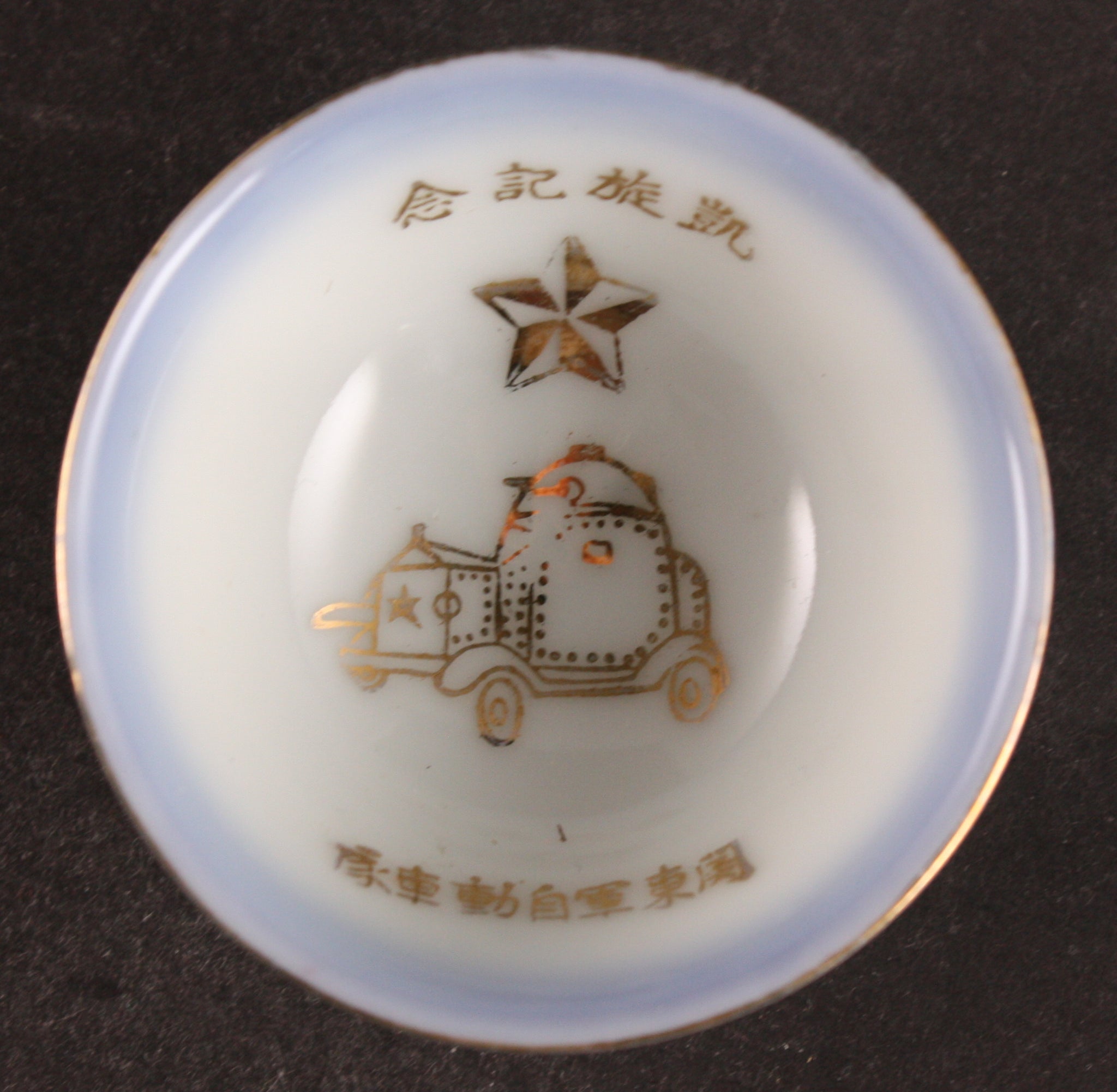 This is an antique Japanese military sake cup, decorated with a nice picture of a British Vickers Crossley Armoured Car, which was an armoured vehicle in the Japanese army service. The words on the cup are "Victorious Return Commemoration" "Kanto Army Automobile Unit" and the soldier's name Imanishi is on the back. The Kanto army was the Japanese army unit in Manchuria that spearheaded the invasion of China in 1937.